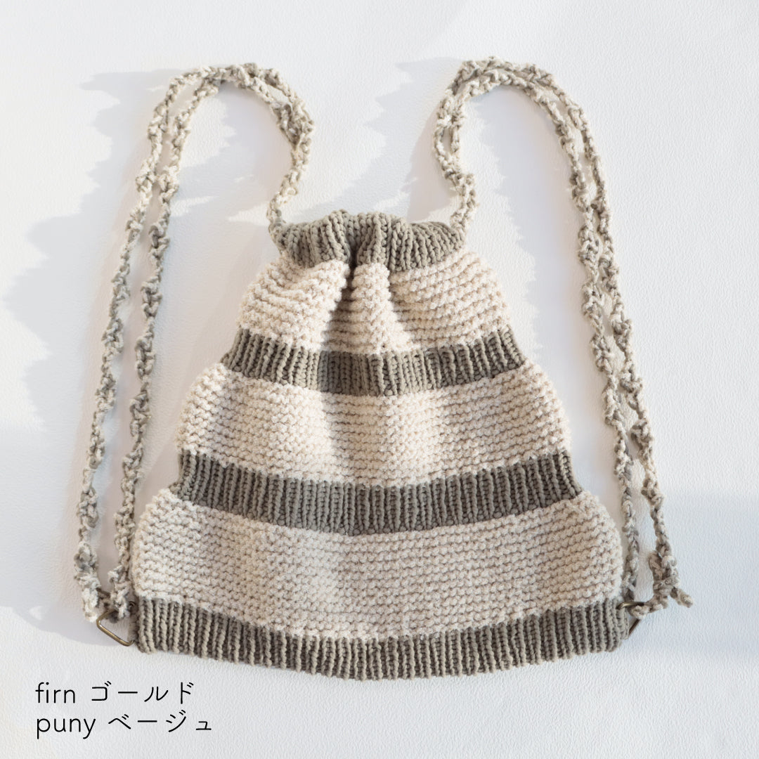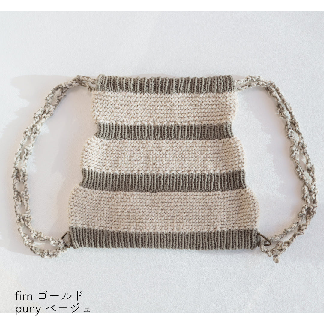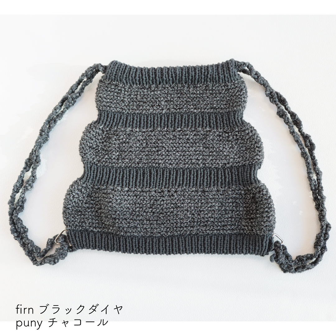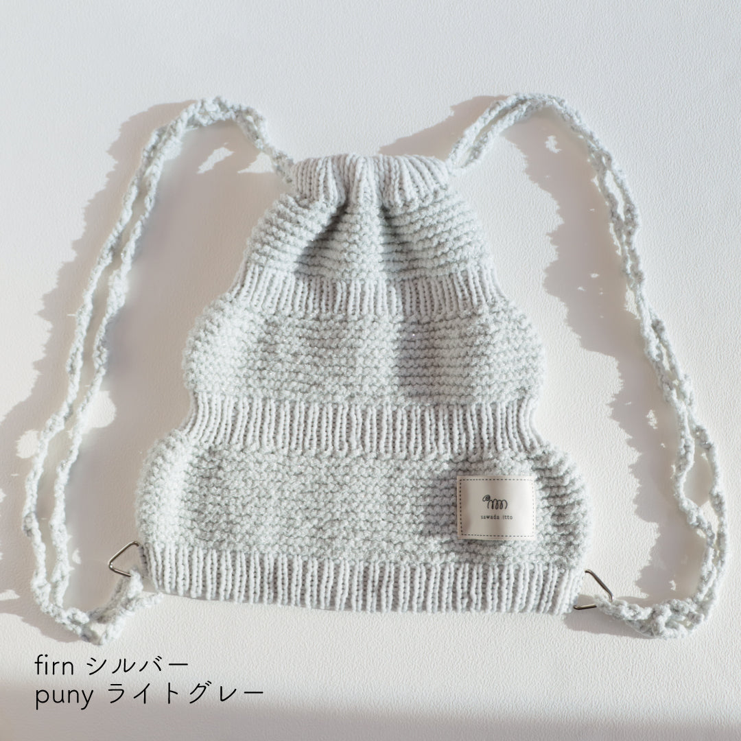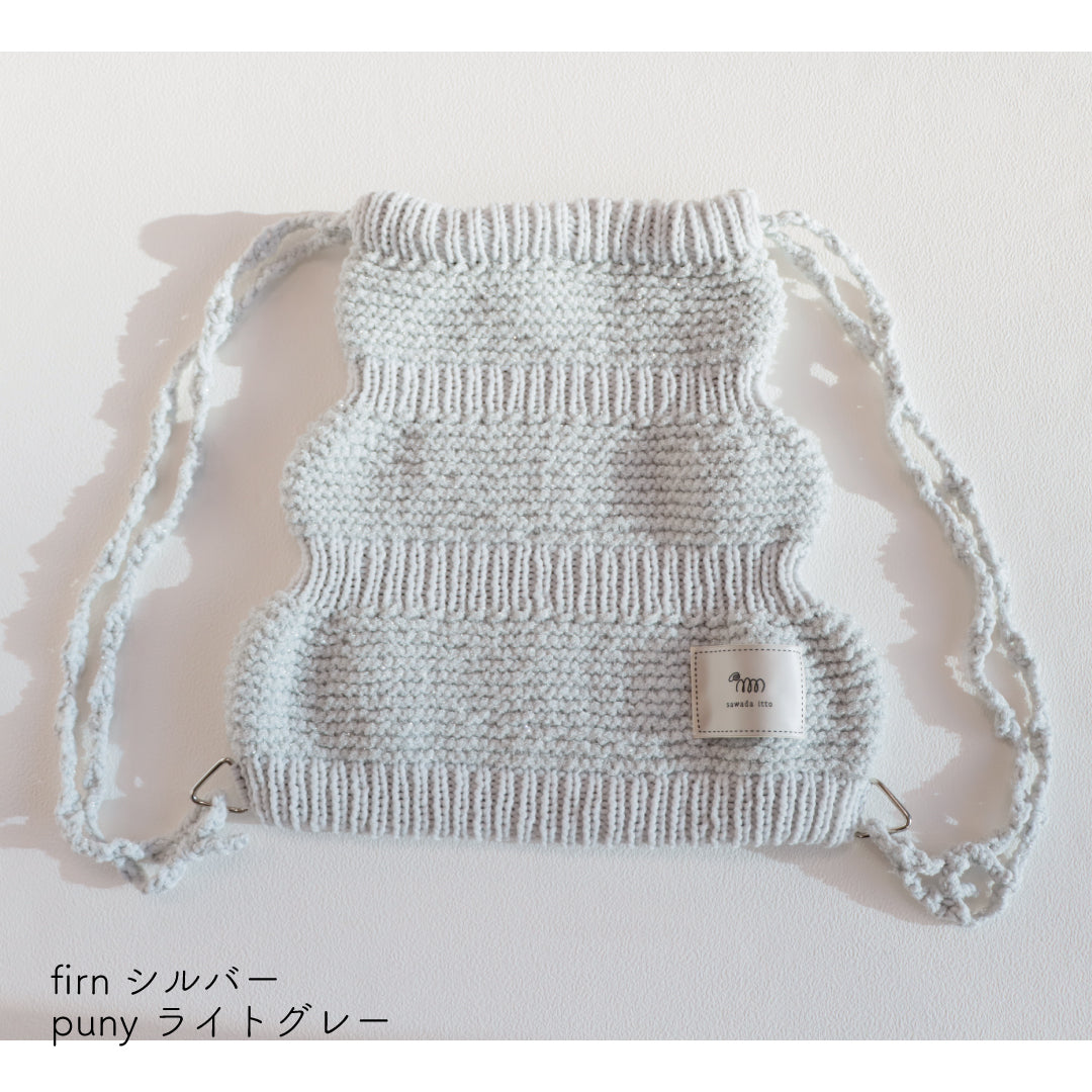 糸と編み方の違いが楽しい波打つナップサック。糸も太く、簡単な編み方なのであっという間に編み終わるキットです。firnのキラキラなラメとPunyのもちもちな風合いで素材の違いも楽しんで編めます。本体は棒針、肩紐はかぎ針で編んでいます。うねうねとした肩紐もかわいいナップサックになりました
