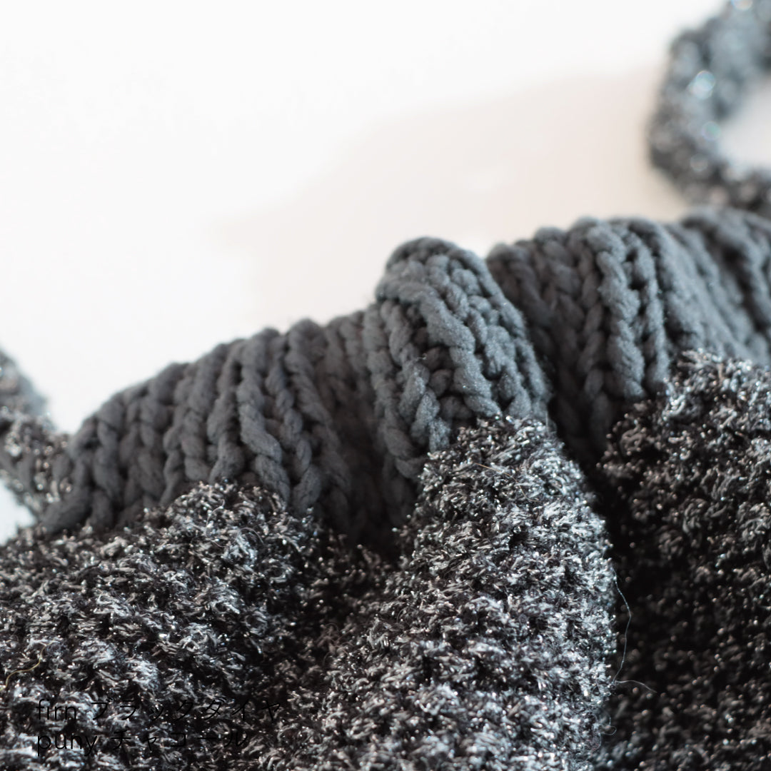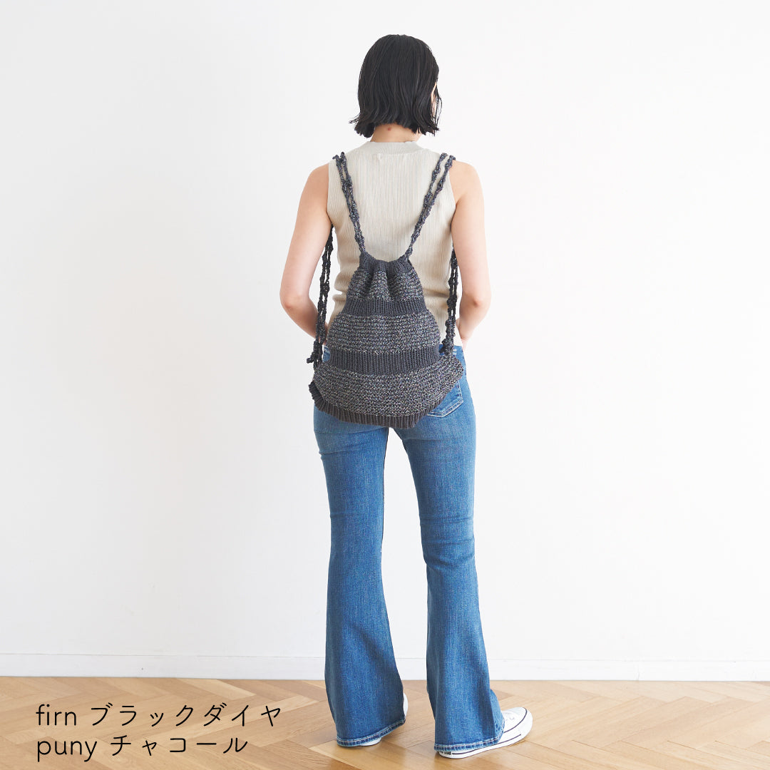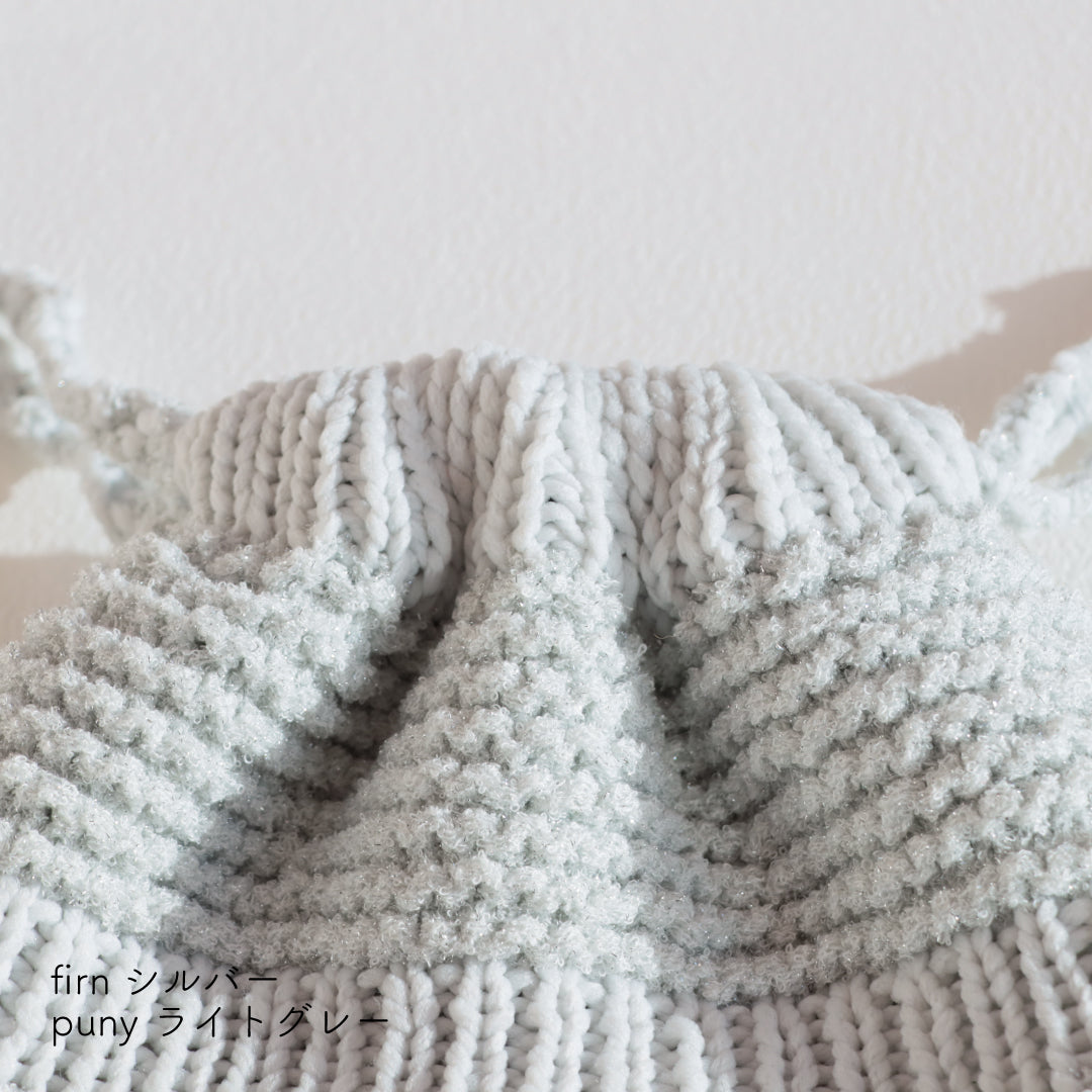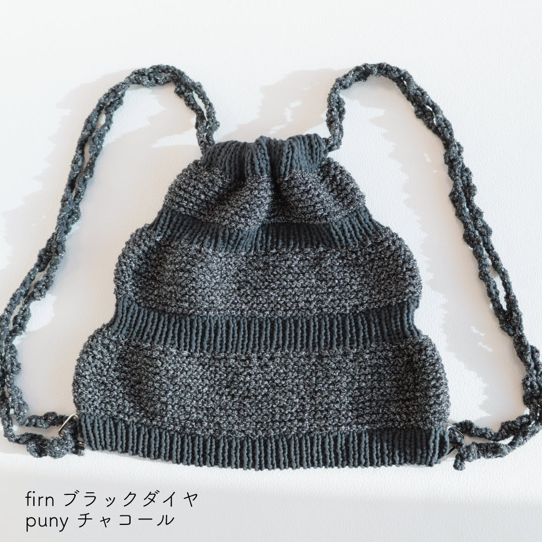 糸と編み方の違いが楽しい波打つナップサック。糸も太く、簡単な編み方なのであっという間に編み終わるキットです。firnのキラキラなラメとPunyのもちもちな風合いで素材の違いも楽しんで編めます。本体は棒針、肩紐はかぎ針で編んでいます。うねうねとした肩紐もかわいいナップサックになりました