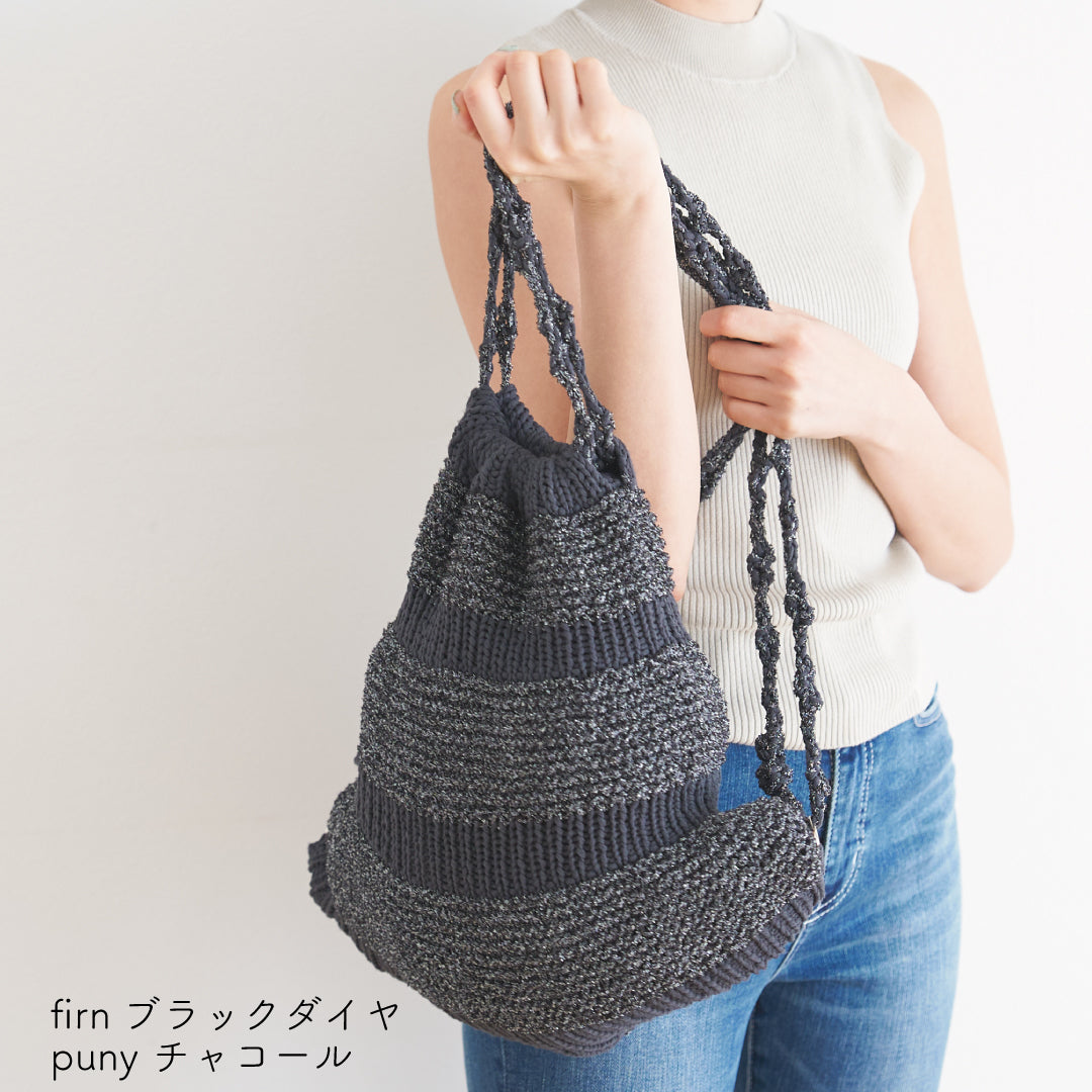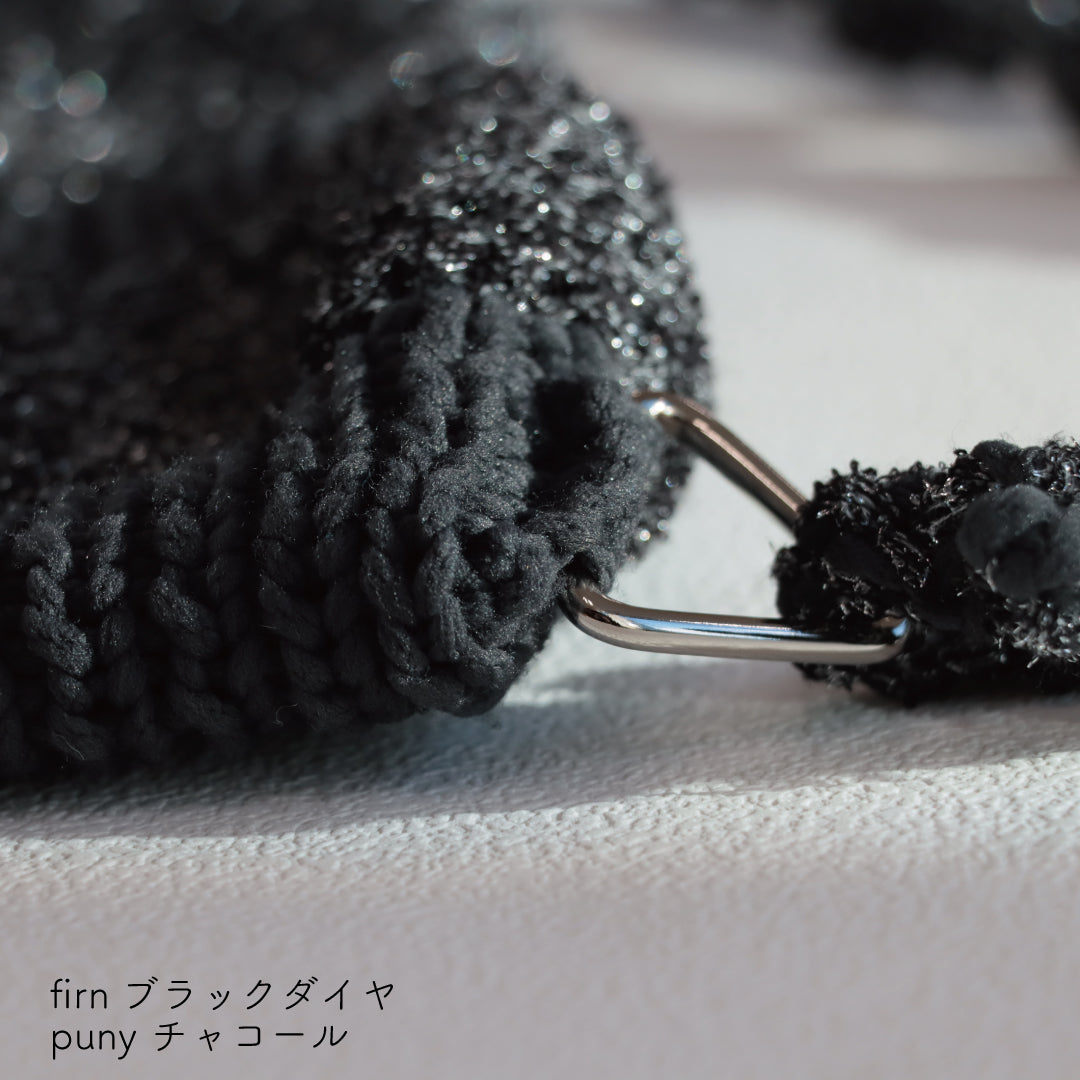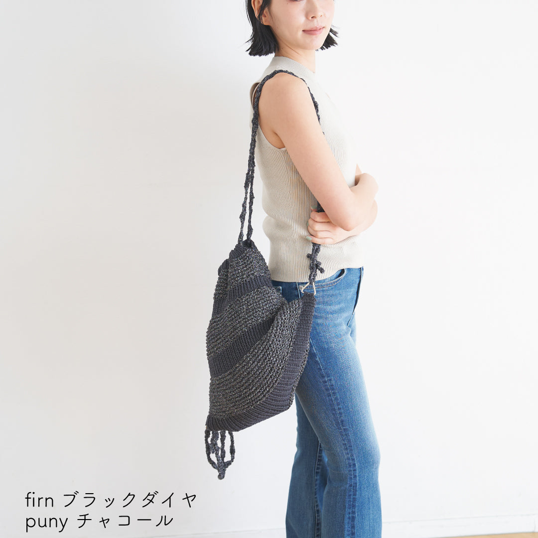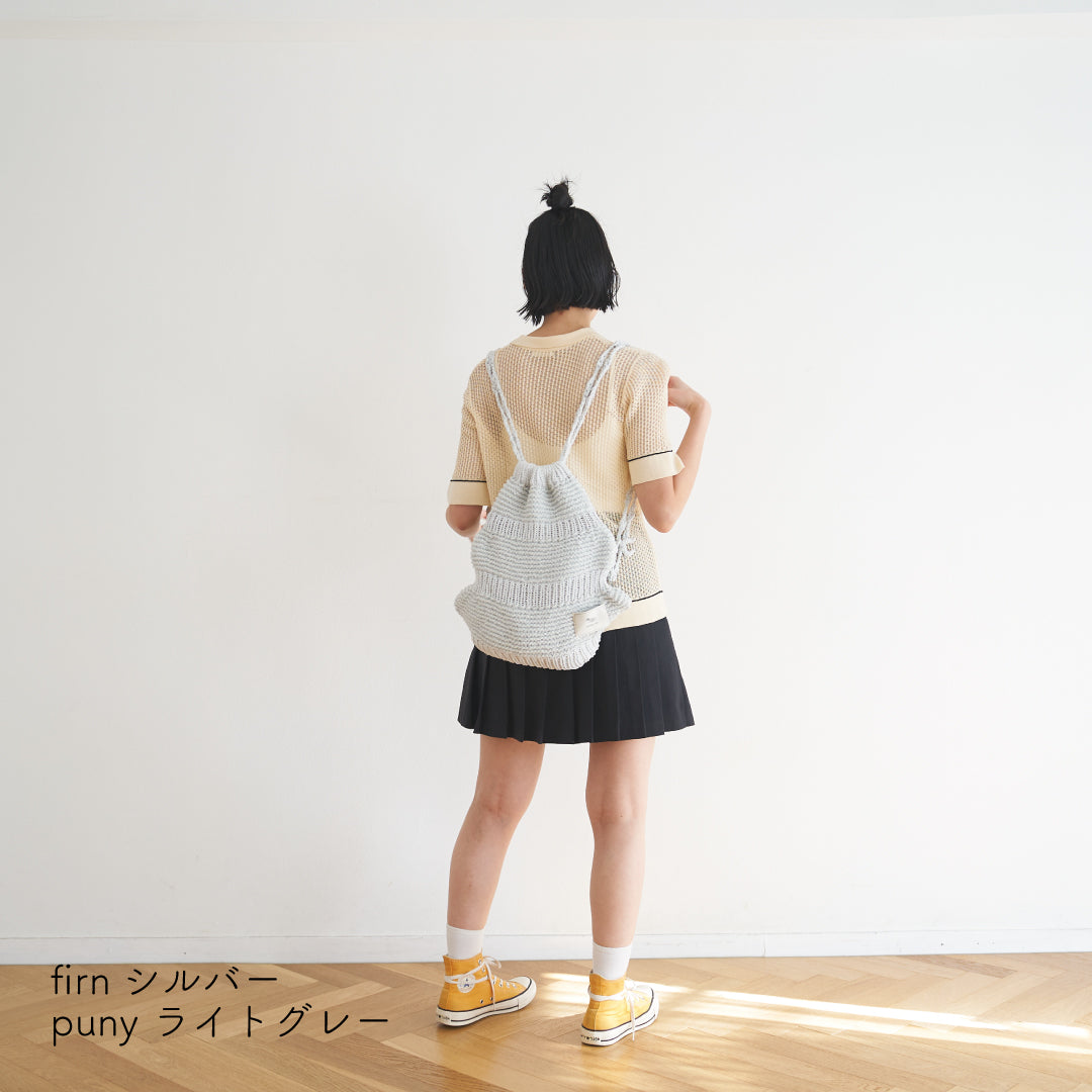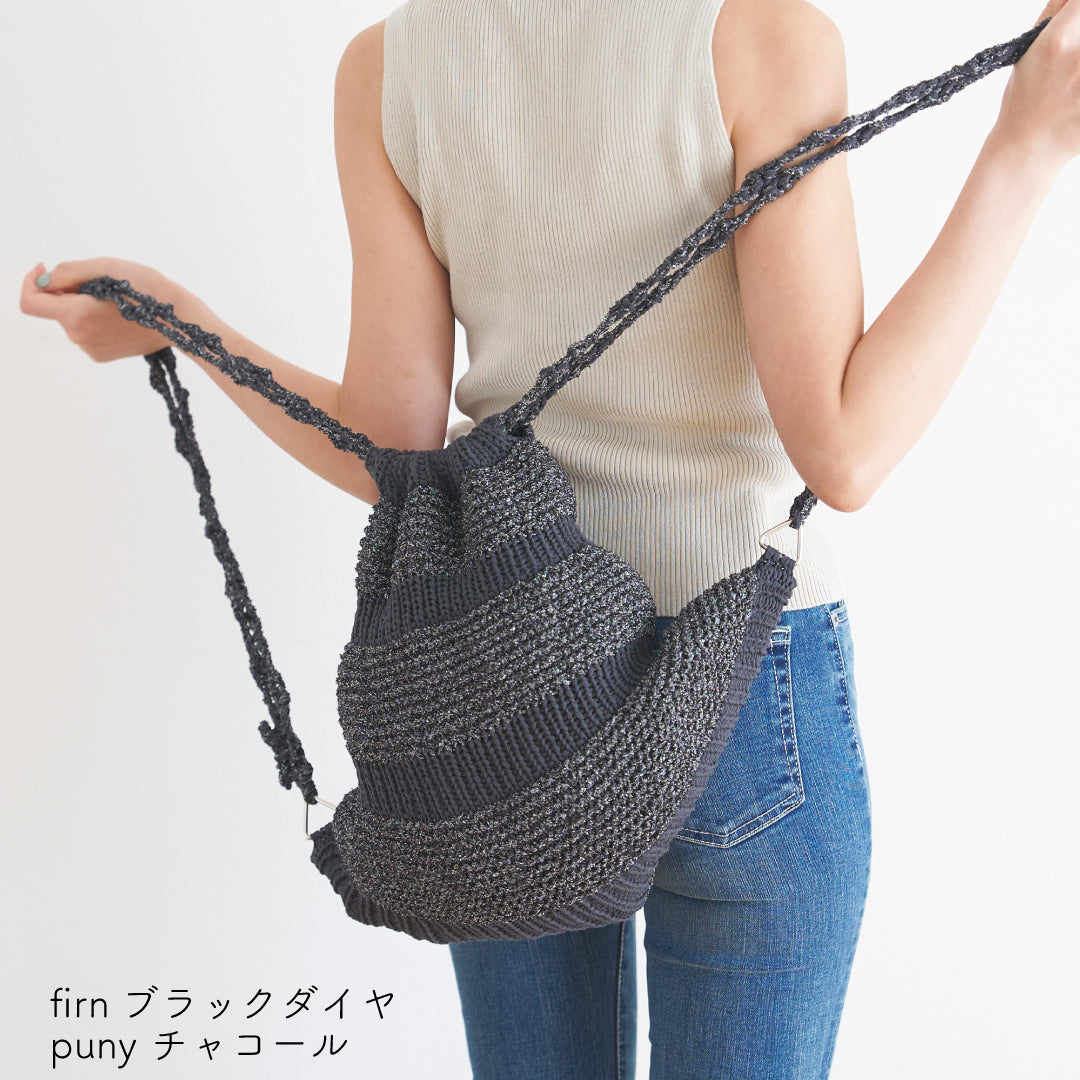 糸と編み方の違いが楽しい波打つナップサック。糸も太く、簡単な編み方なのであっという間に編み終わるキットです。firnのキラキラなラメとPunyのもちもちな風合いで素材の違いも楽しんで編めます。本体は棒針、肩紐はかぎ針で編んでいます。うねうねとした肩紐もかわいいナップサックになりました