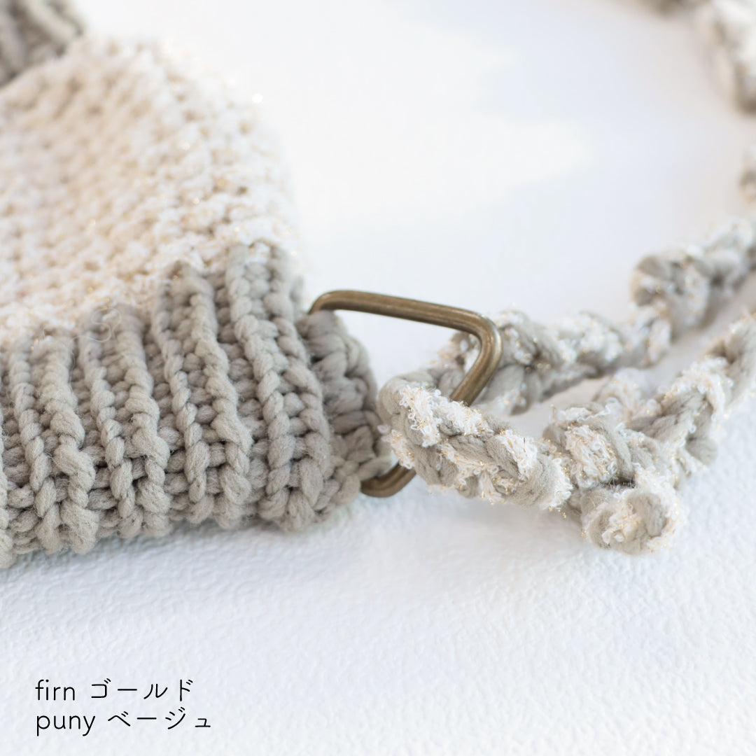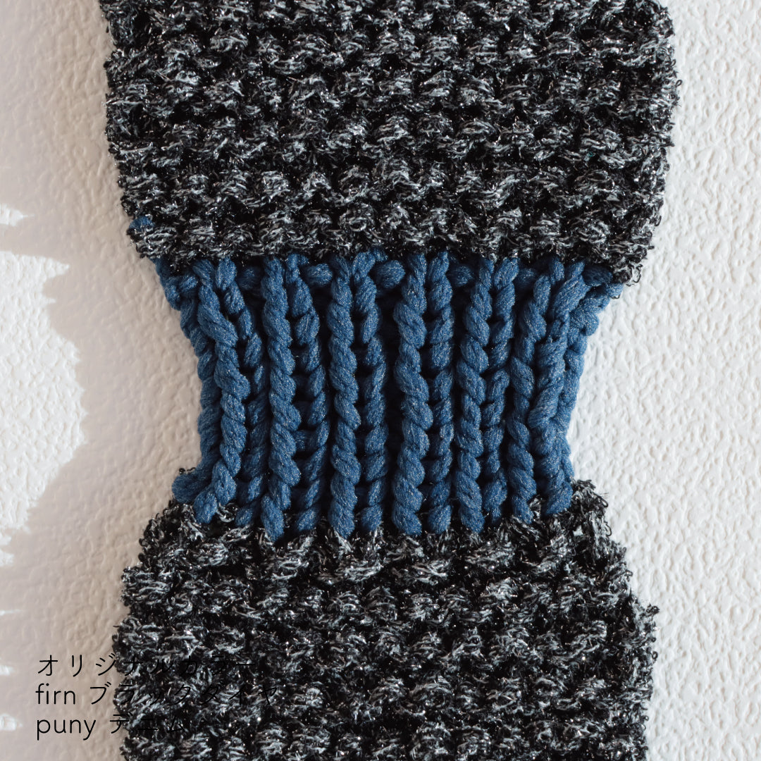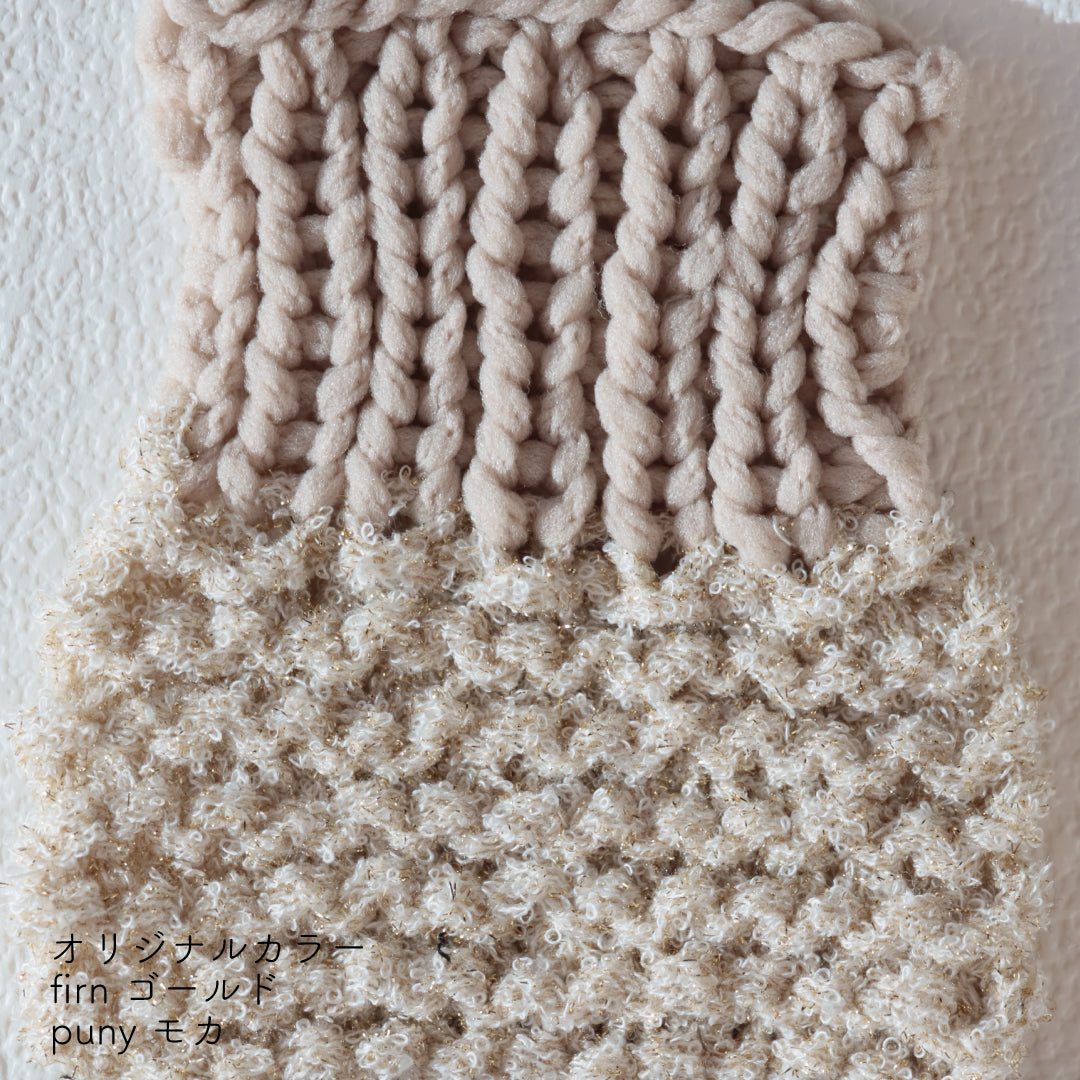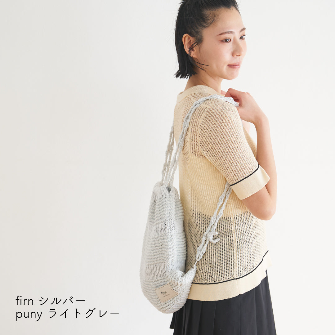 糸と編み方の違いが楽しい波打つナップサック。糸も太く、簡単な編み方なのであっという間に編み終わるキットです。firnのキラキラなラメとPunyのもちもちな風合いで素材の違いも楽しんで編めます。本体は棒針、肩紐はかぎ針で編んでいます。うねうねとした肩紐もかわいいナップサックになりました