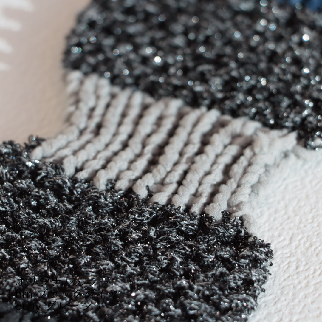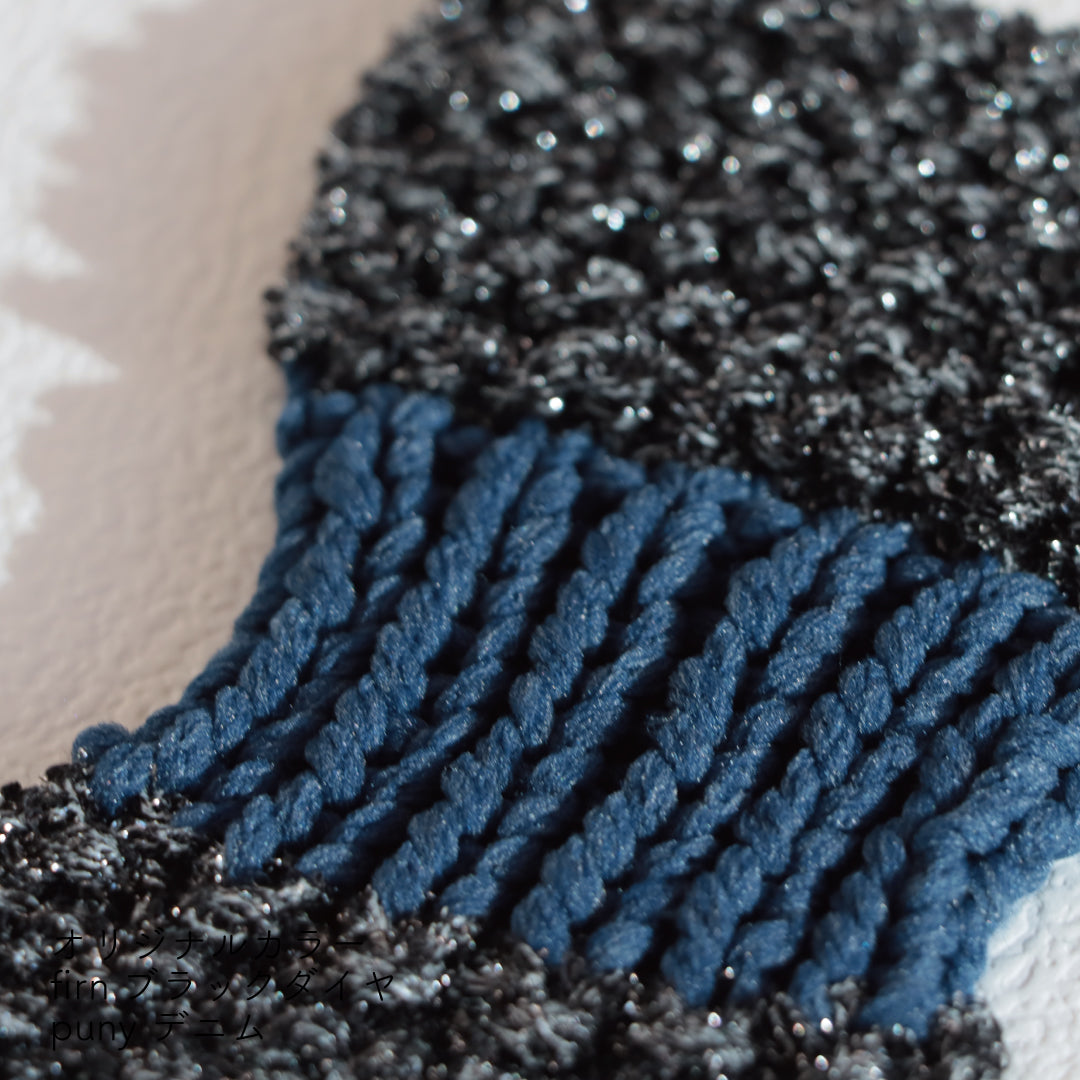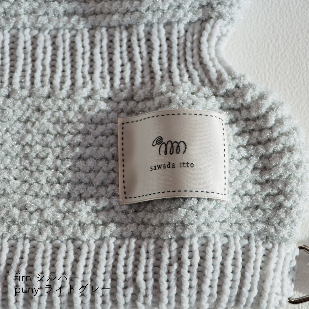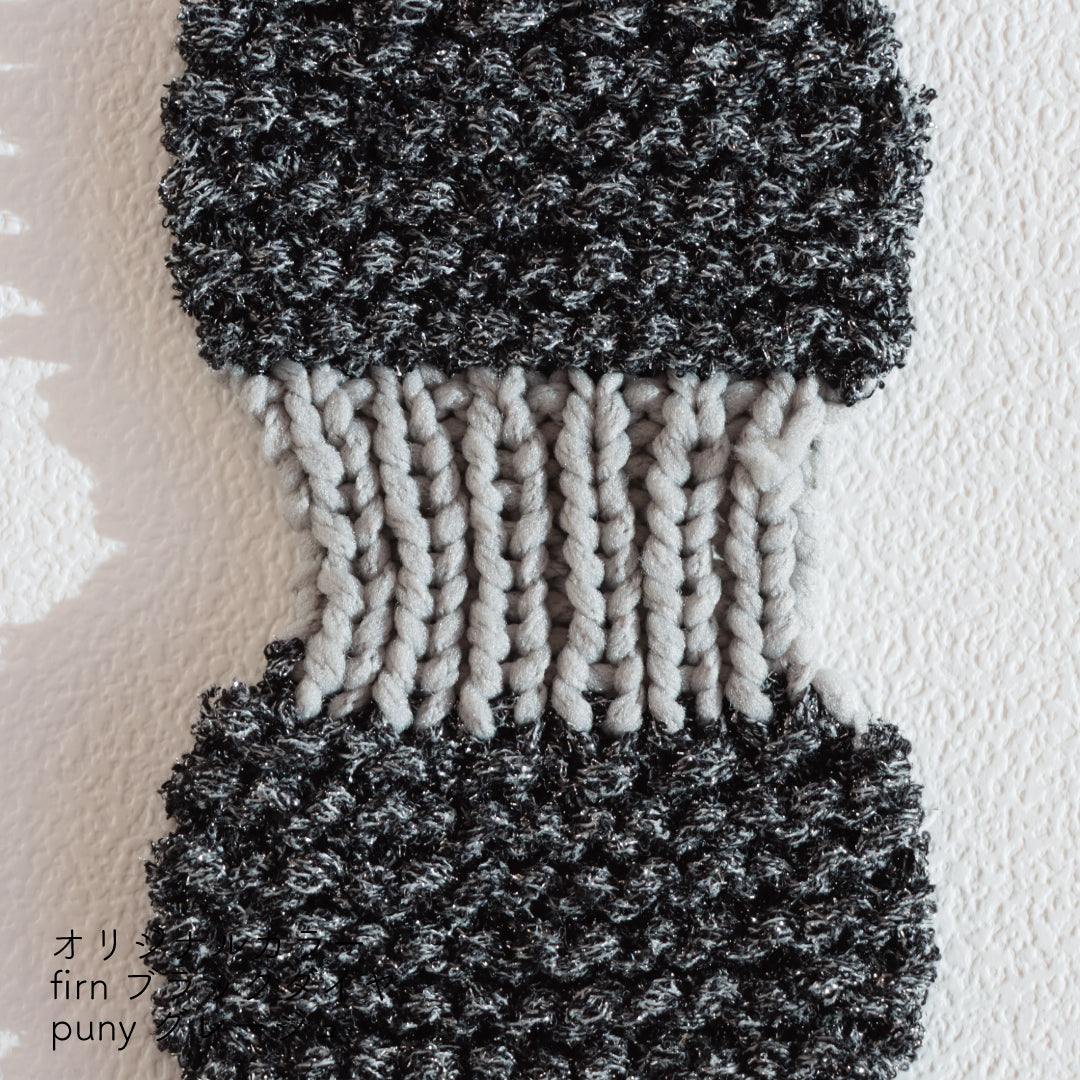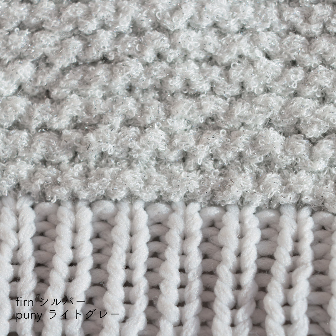 糸と編み方の違いが楽しい波打つナップサック。糸も太く、簡単な編み方なのであっという間に編み終わるキットです。firnのキラキラなラメとPunyのもちもちな風合いで素材の違いも楽しんで編めます。本体は棒針、肩紐はかぎ針で編んでいます。うねうねとした肩紐もかわいいナップサックになりました