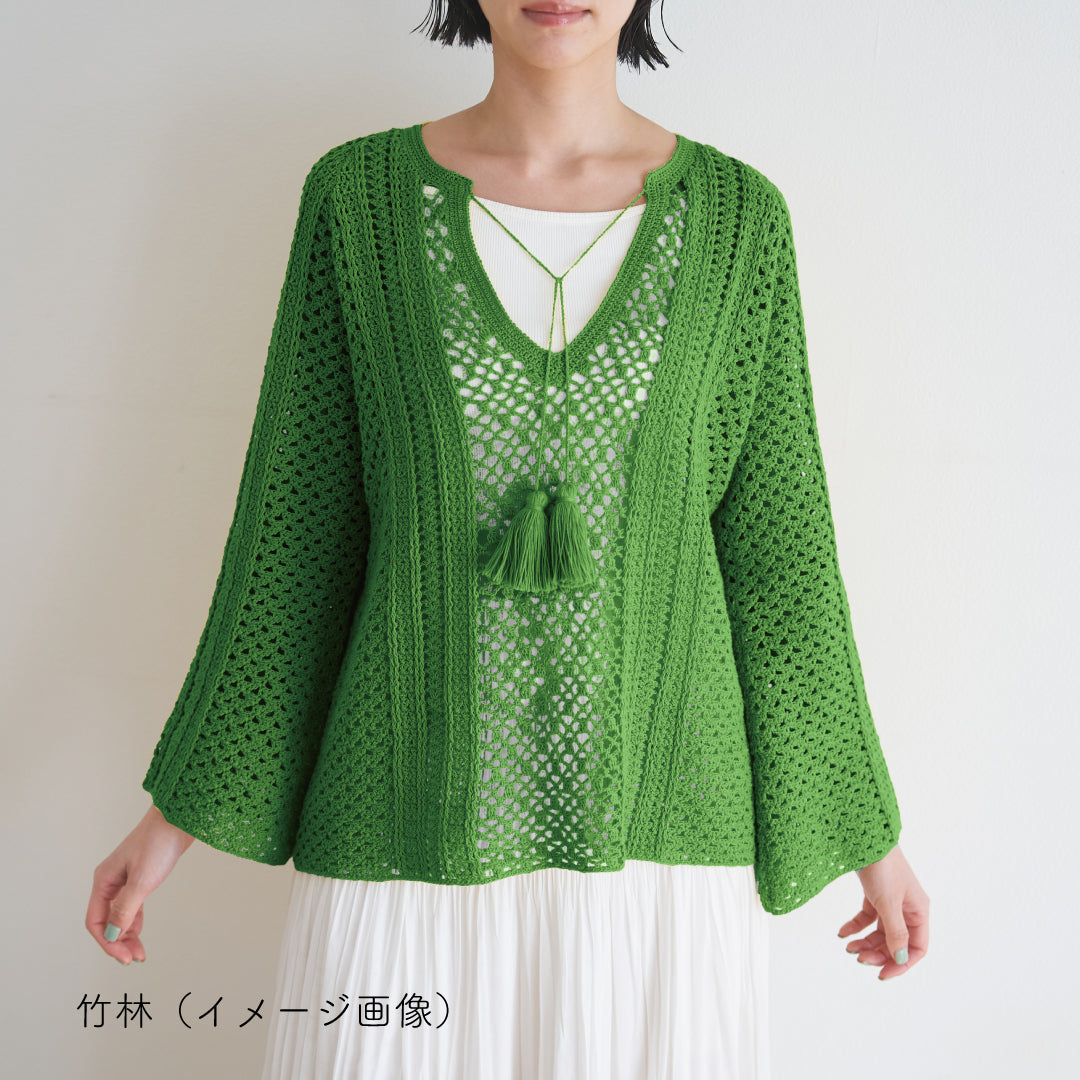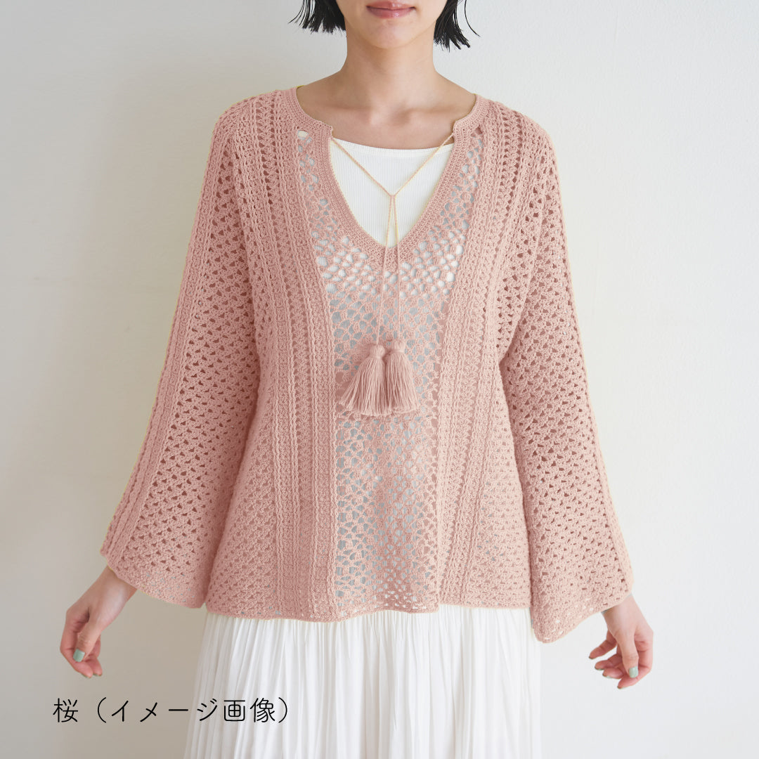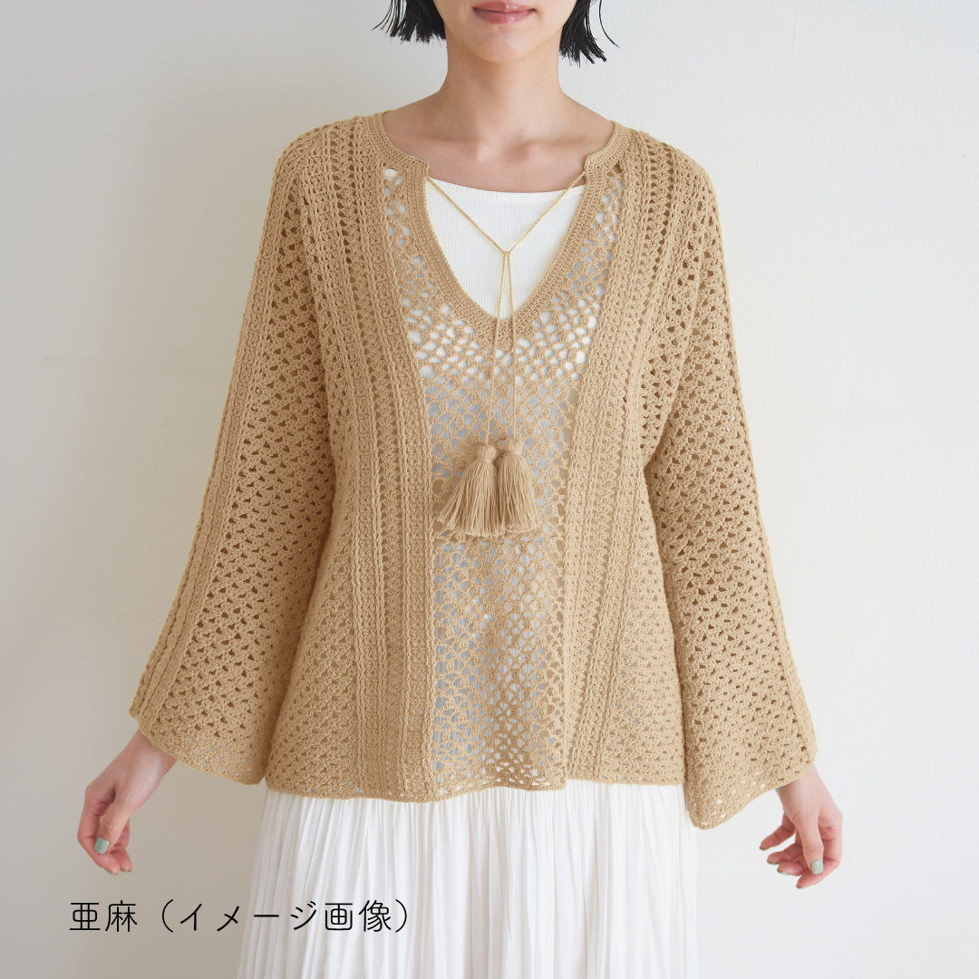 袖はフレアタイプで、ゆったりとしたシルエットが女性らしい印象を与え、体型を選ばずリラックス感あるウエアです。フロントにはタッセル付きの紐がアクセントになっていて、部分的に+ittoなどで引き揃えをするのもおすすめ。