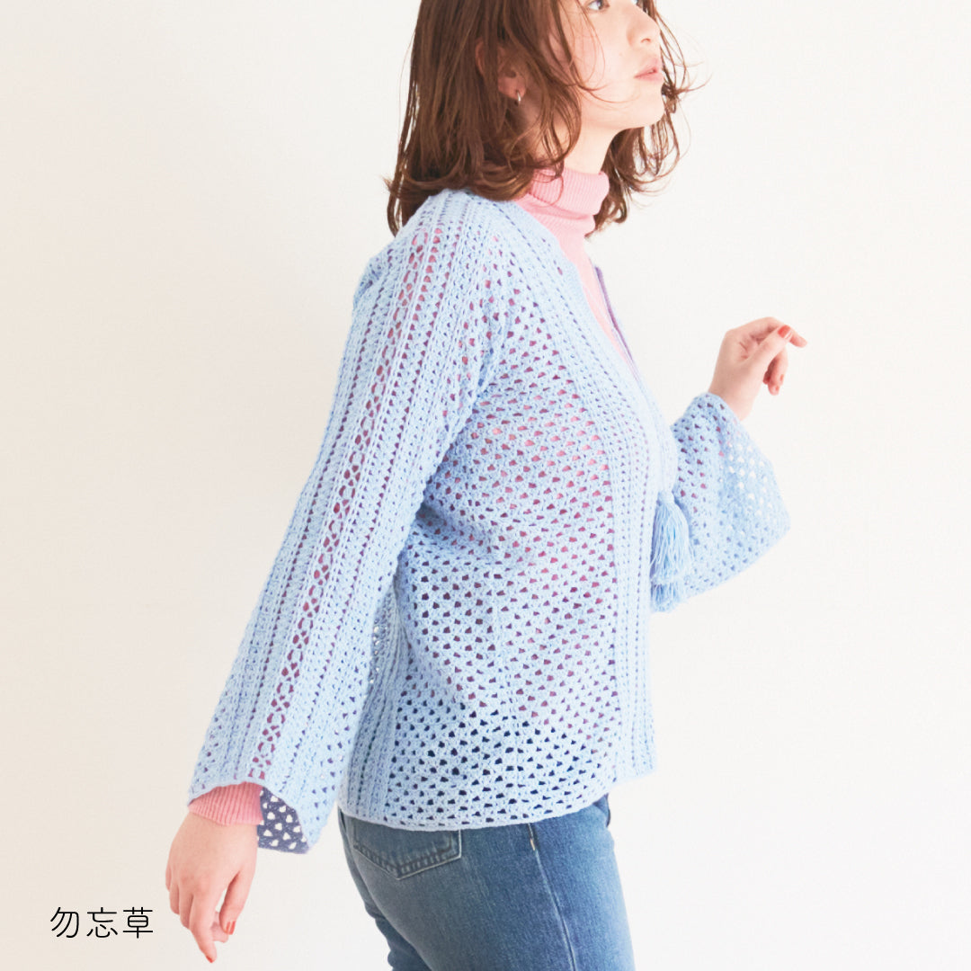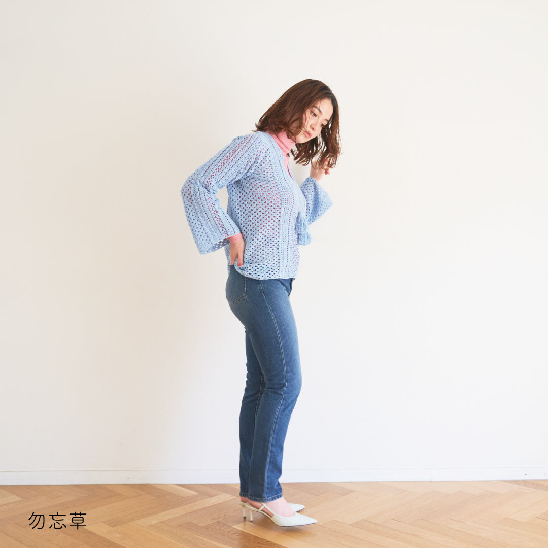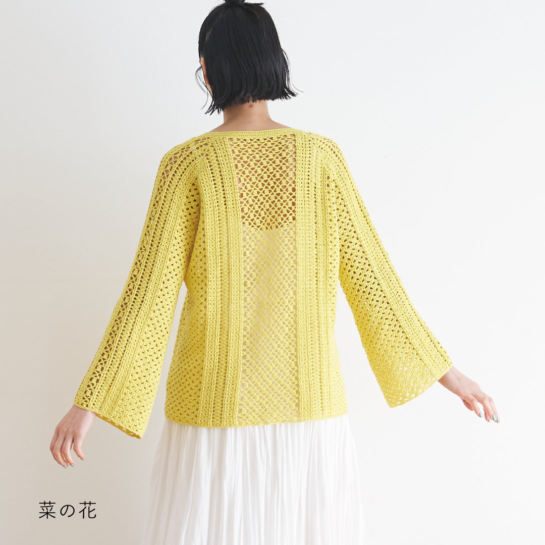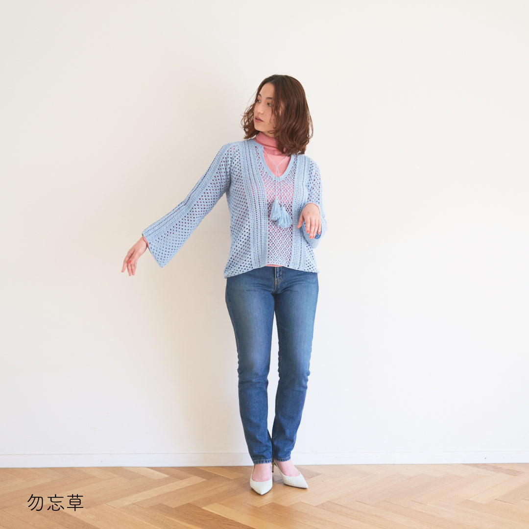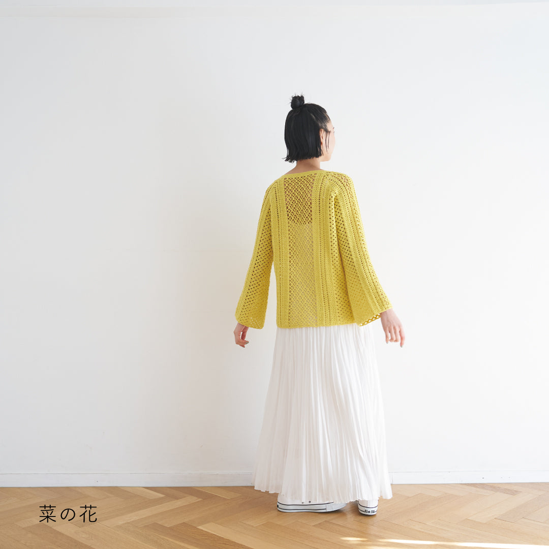 涼しげで通気性があり、春夏にぴったりです。全体に透かし模様が入っていて、インナーとのレイヤードが楽しめるデザインになっています。