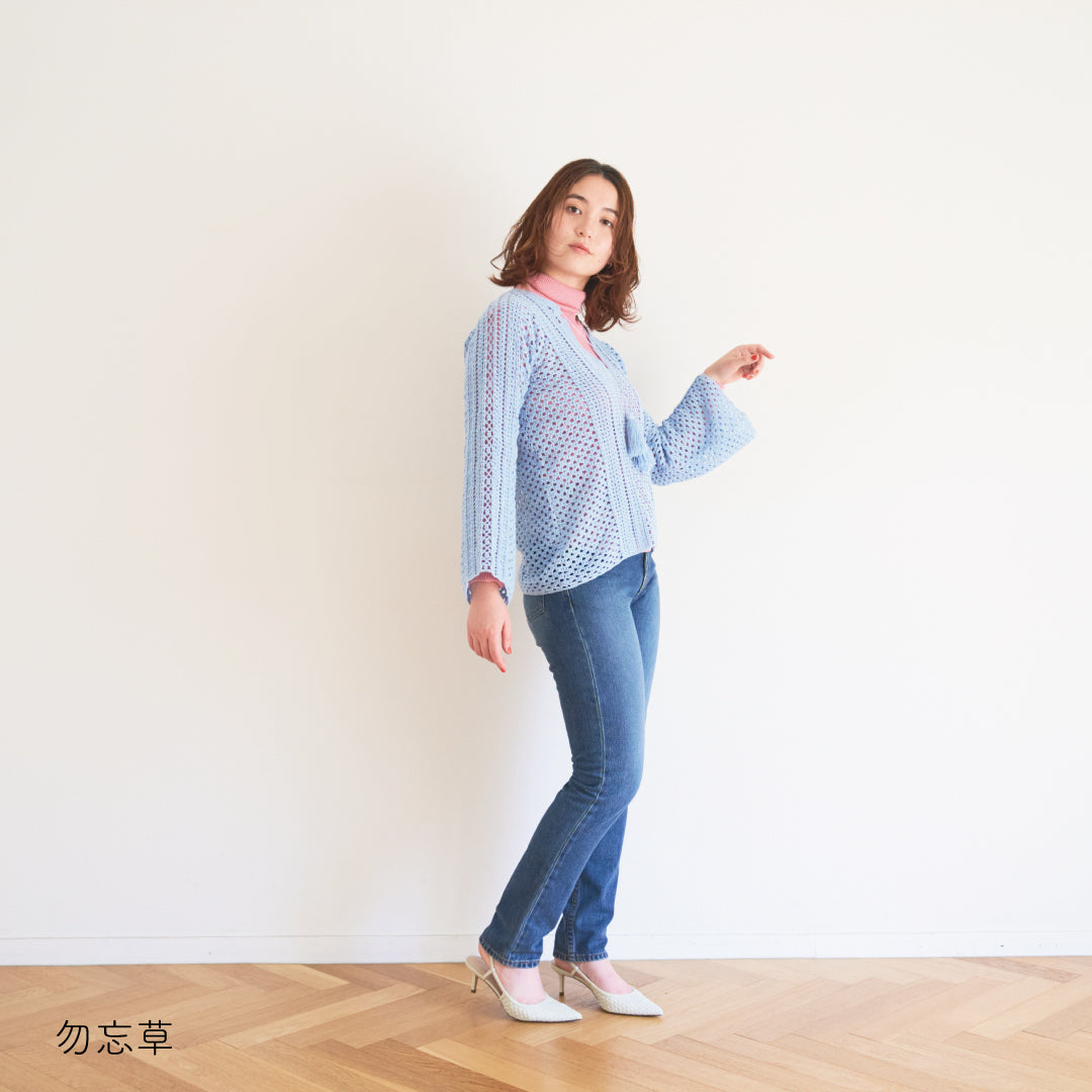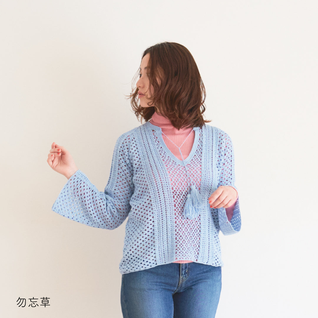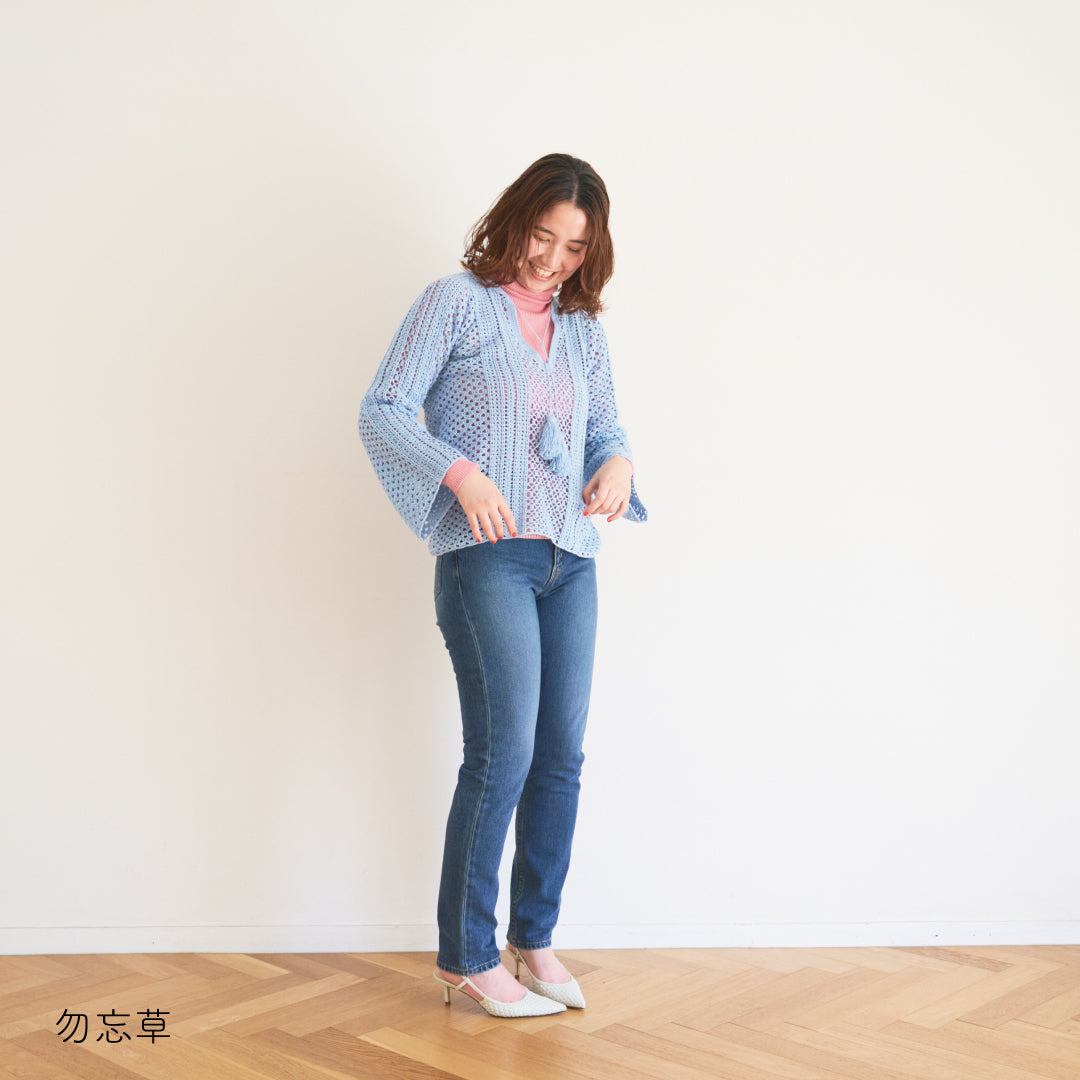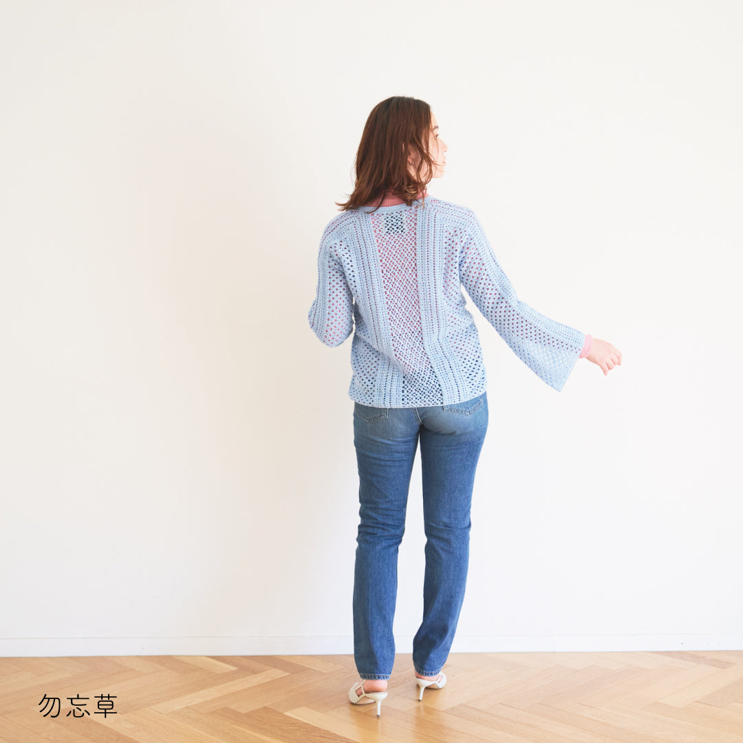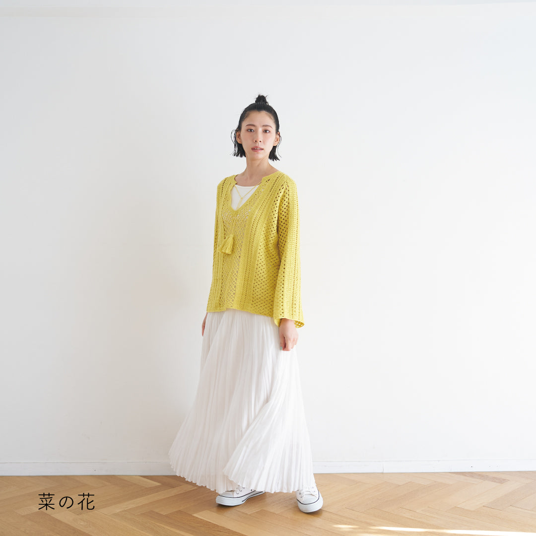 涼しげで通気性があり、春夏にぴったりです。全体に透かし模様が入っていて、インナーとのレイヤードが楽しめるデザインになっています。