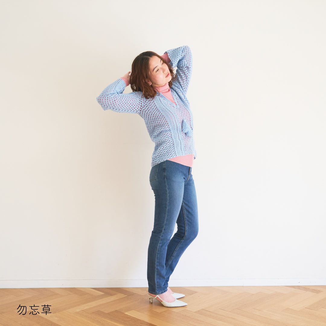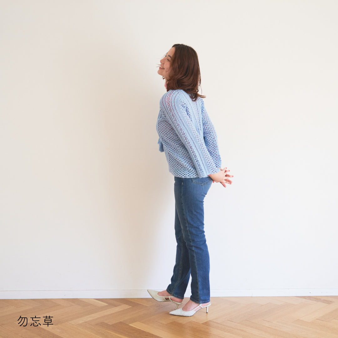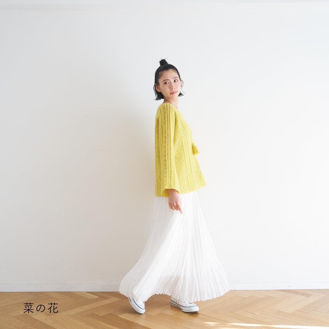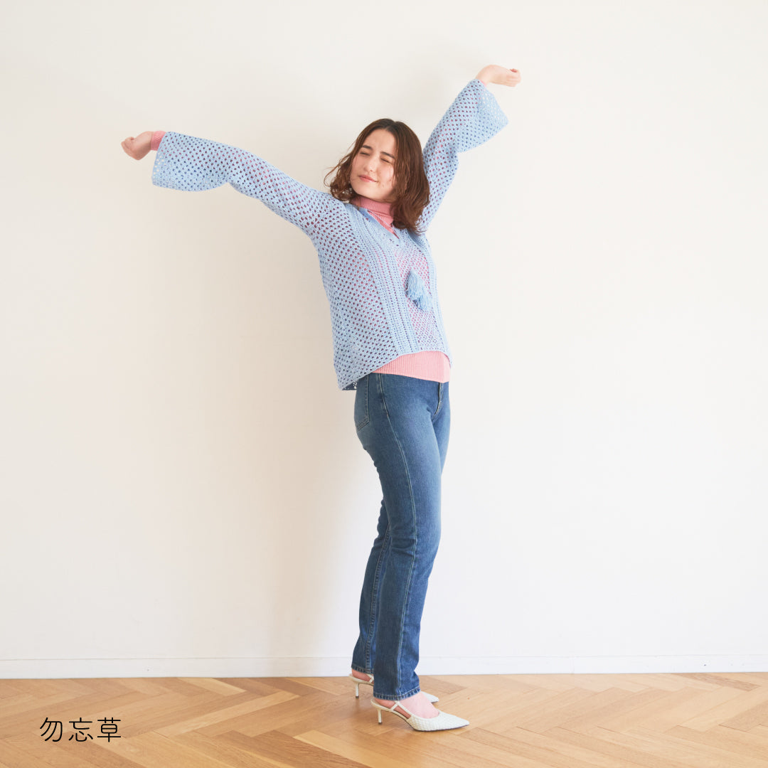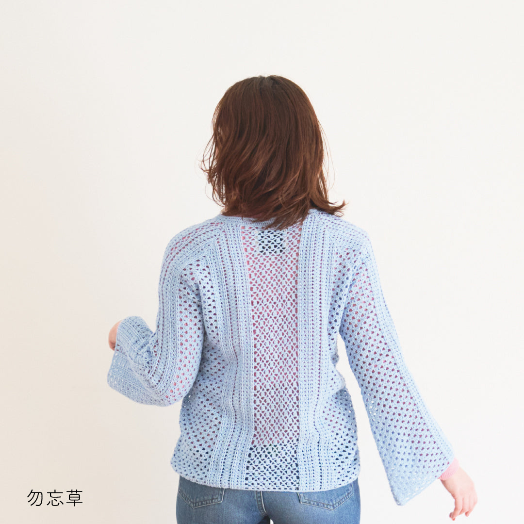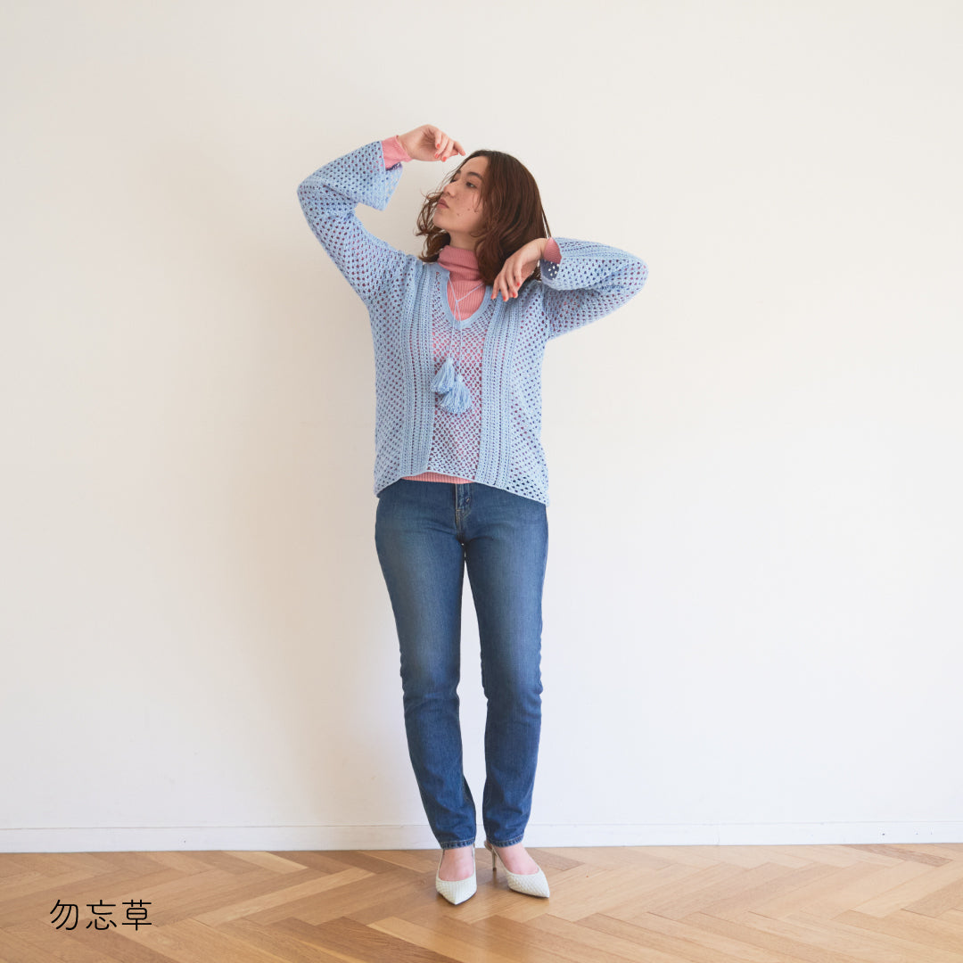 涼しげで通気性があり、春夏にぴったりです。全体に透かし模様が入っていて、インナーとのレイヤードが楽しめるデザインになっています。