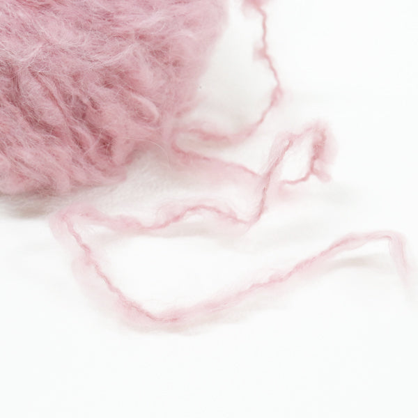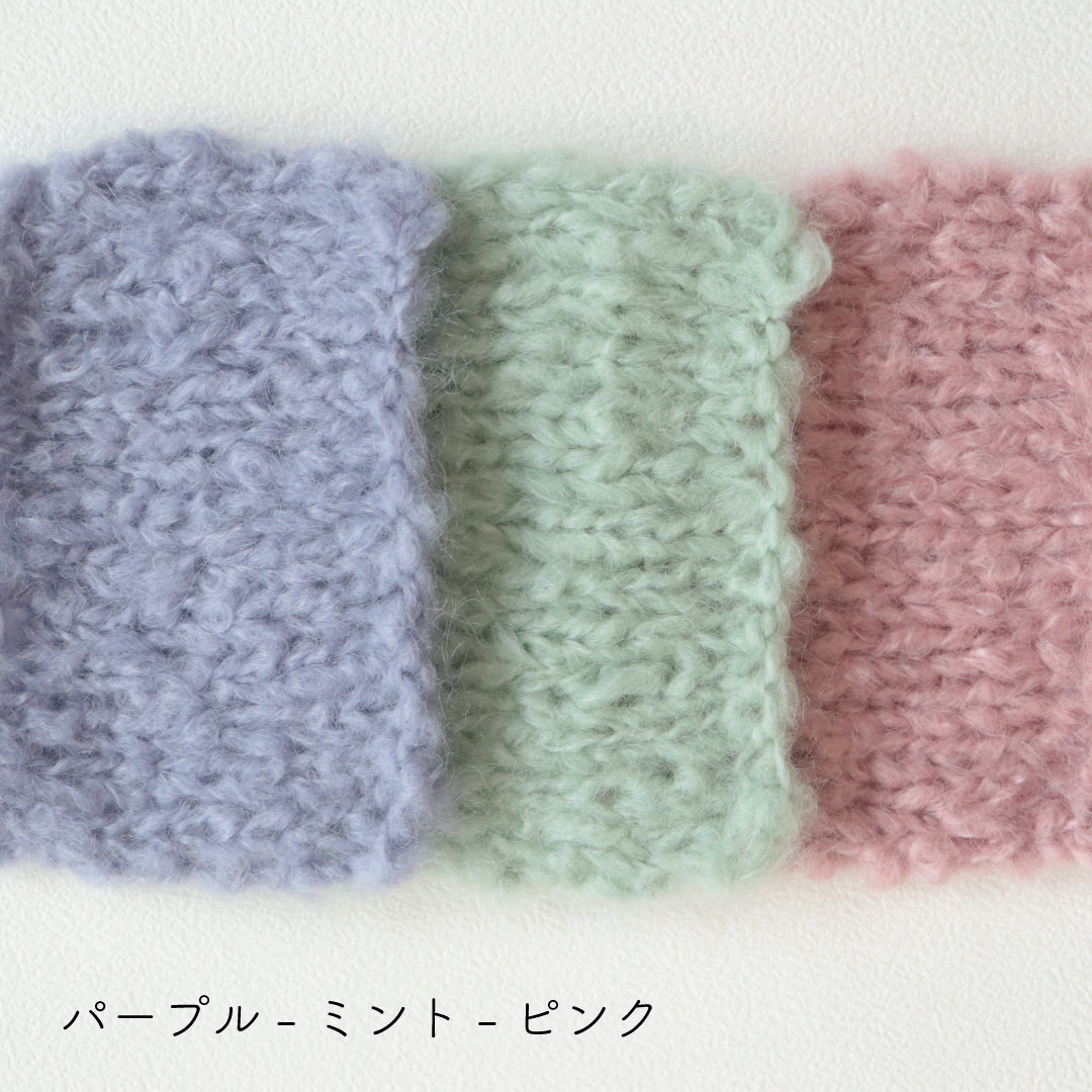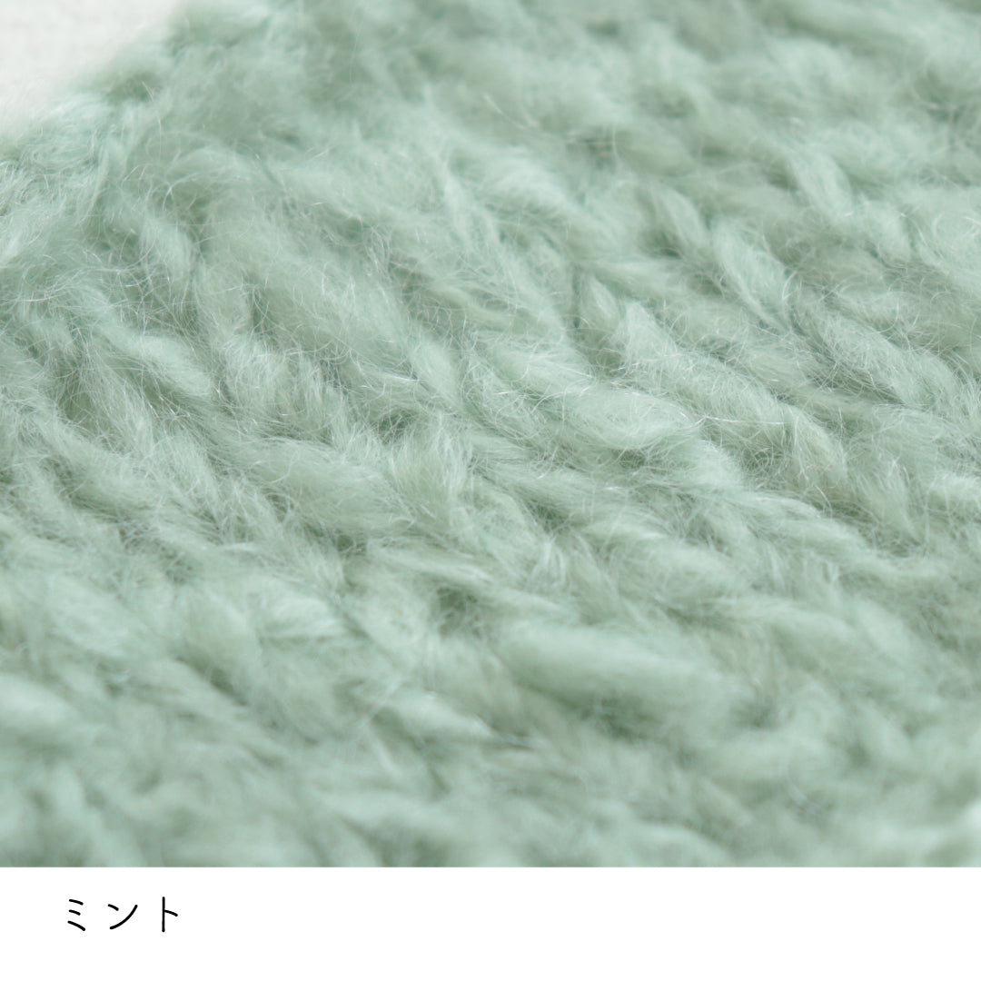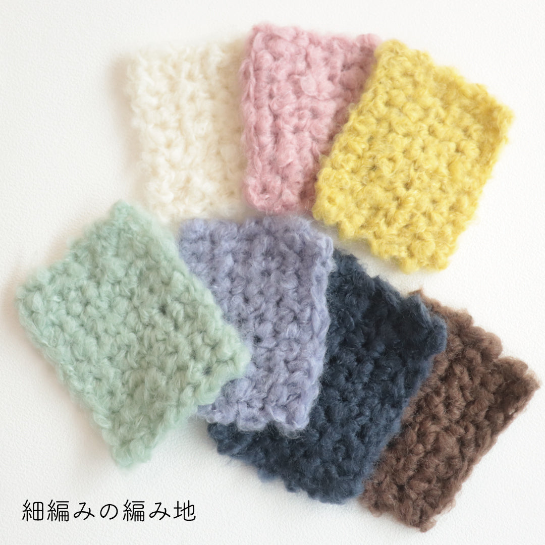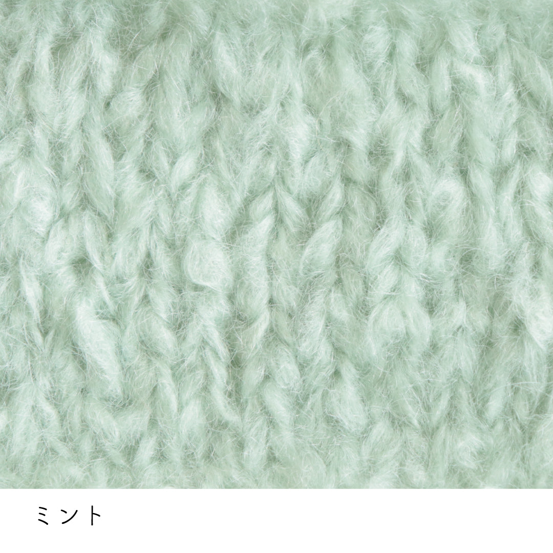希少なキッドモヘヤをたっぷりと使用した、至極のふわふわ極太糸ができました。生後1年以内のアンゴラ山羊(ヤギ)からのみ刈り取ることが出来る、直径わずか26~32ミクロンの繊細なモヘヤ。糸を起毛させることで、毛質を最も活かした抜群の風合いに仕上げています。しっとりとした光沢があり、甘くなりすぎないこだわりのパステルカラーはどの色で組み合わせても可愛くなります。軽くて暖かく触り心地が抜群なのでウエアやマフラーレッグウォーマーなど肌に触れる秋冬小物が特におすすめ。極太糸はざくざく編み進められるので、作品の完成もはやく楽しく編めます。