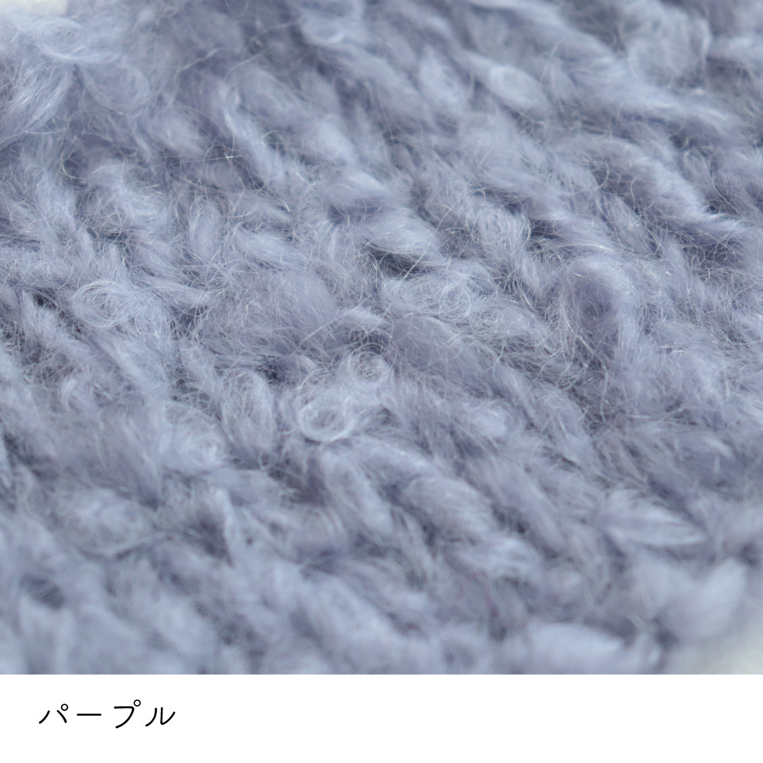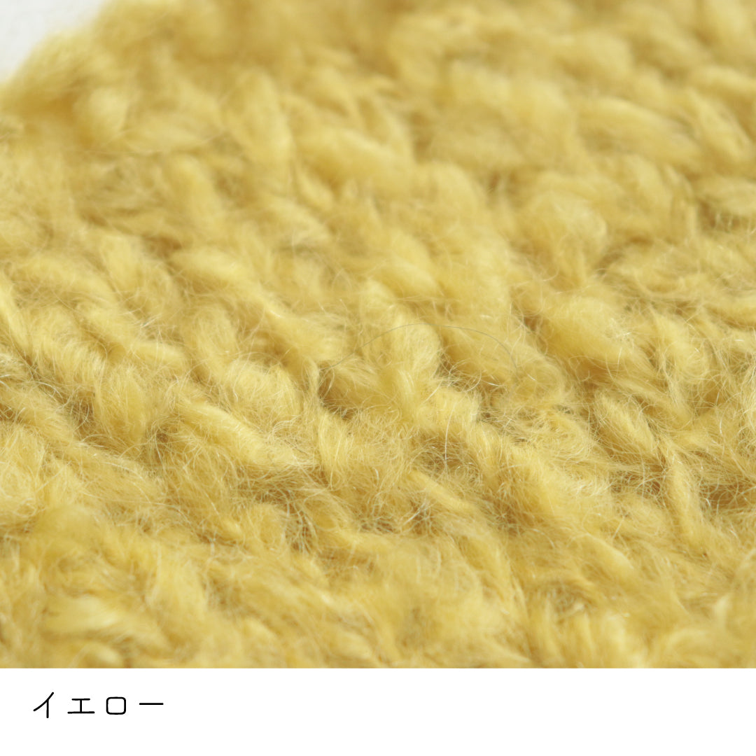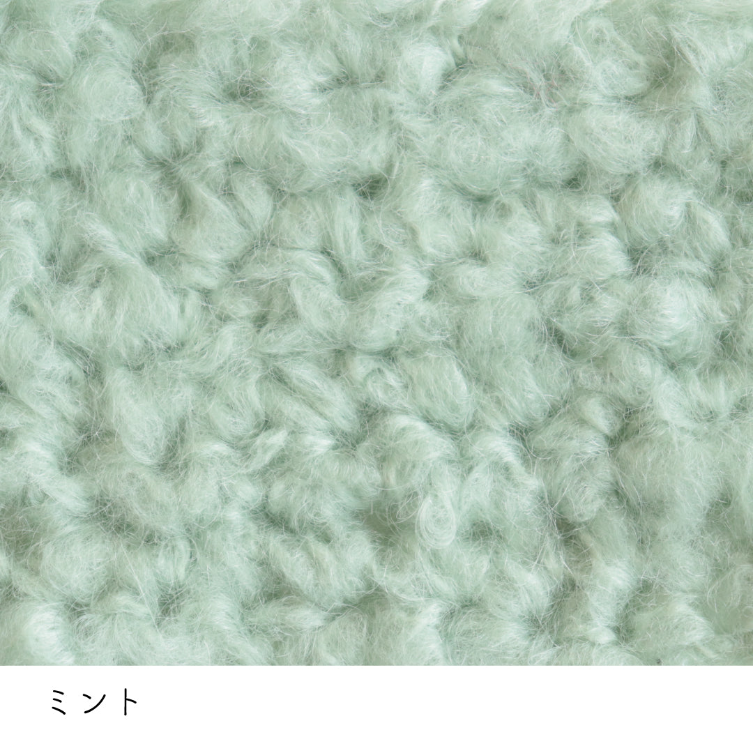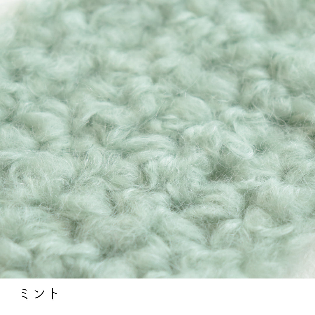 希少なキッドモヘヤをたっぷりと使用した、至極のふわふわ極太糸ができました。生後1年以内のアンゴラ山羊(ヤギ)からのみ刈り取ることが出来る、直径わずか26~32ミクロンの繊細なモヘヤ。糸を起毛させることで、毛質を最も活かした抜群の風合いに仕上げています。しっとりとした光沢があり、甘くなりすぎないこだわりのパステルカラーはどの色で組み合わせても可愛くなります。軽くて暖かく触り心地が抜群なのでウエアやマフラーレッグウォーマーなど肌に触れる秋冬小物が特におすすめ。極太糸はざくざく編み進められるので、作品の完成もはやく楽しく編めます。