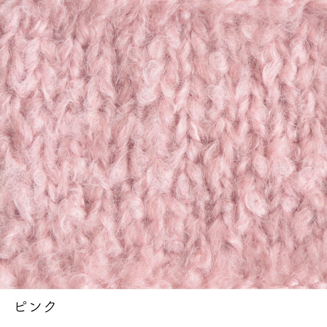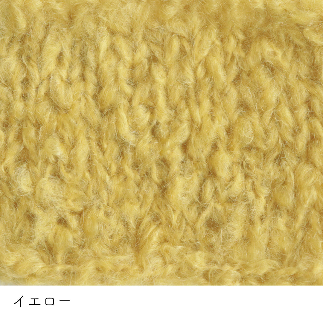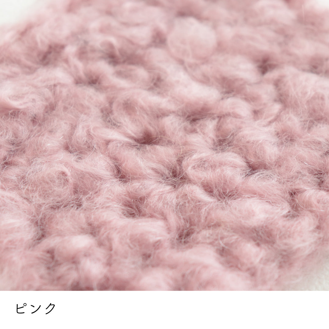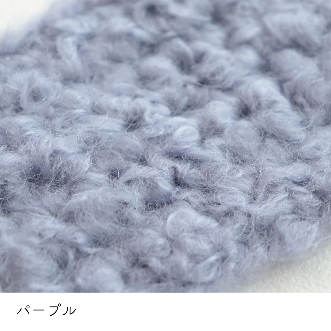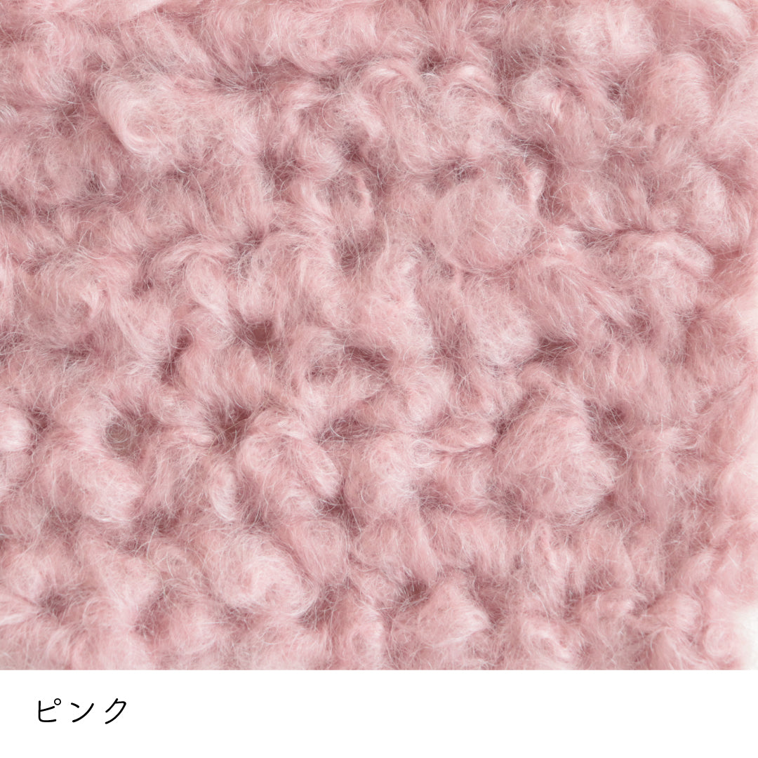 希少なキッドモヘヤをたっぷりと使用した、至極のふわふわ極太糸ができました。生後1年以内のアンゴラ山羊(ヤギ)からのみ刈り取ることが出来る、直径わずか26~32ミクロンの繊細なモヘヤ。糸を起毛させることで、毛質を最も活かした抜群の風合いに仕上げています。しっとりとした光沢があり、甘くなりすぎないこだわりのパステルカラーはどの色で組み合わせても可愛くなります。軽くて暖かく触り心地が抜群なのでウエアやマフラーレッグウォーマーなど肌に触れる秋冬小物が特におすすめ。極太糸はざくざく編み進められるので、作品の完成もはやく楽しく編めます。