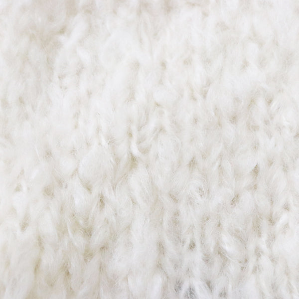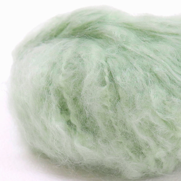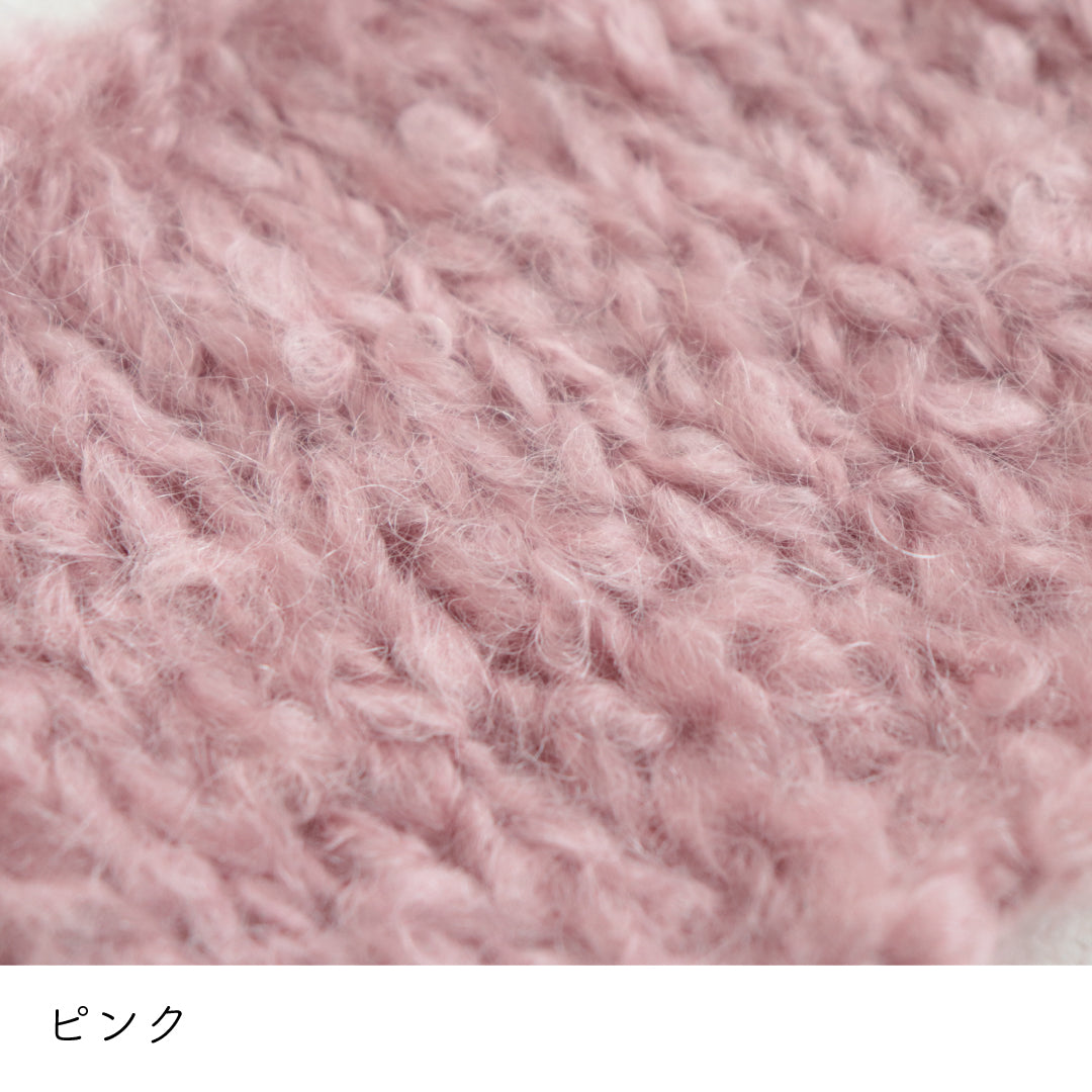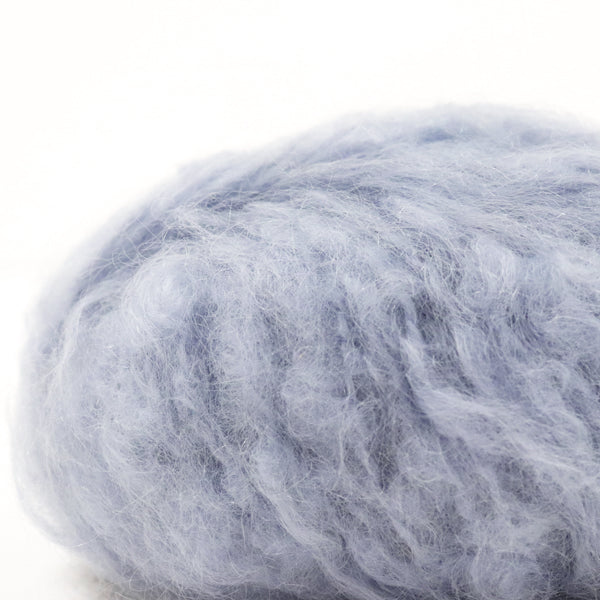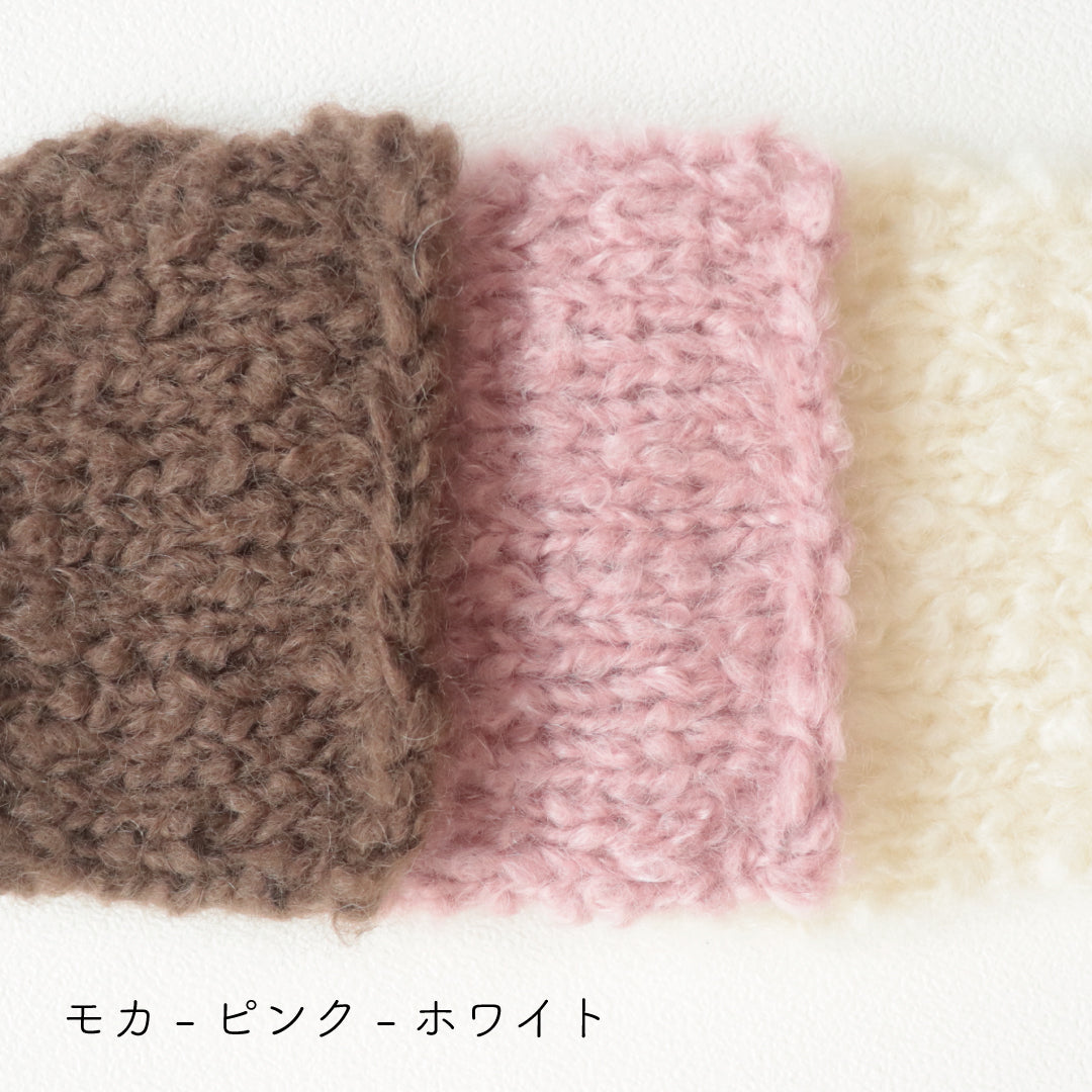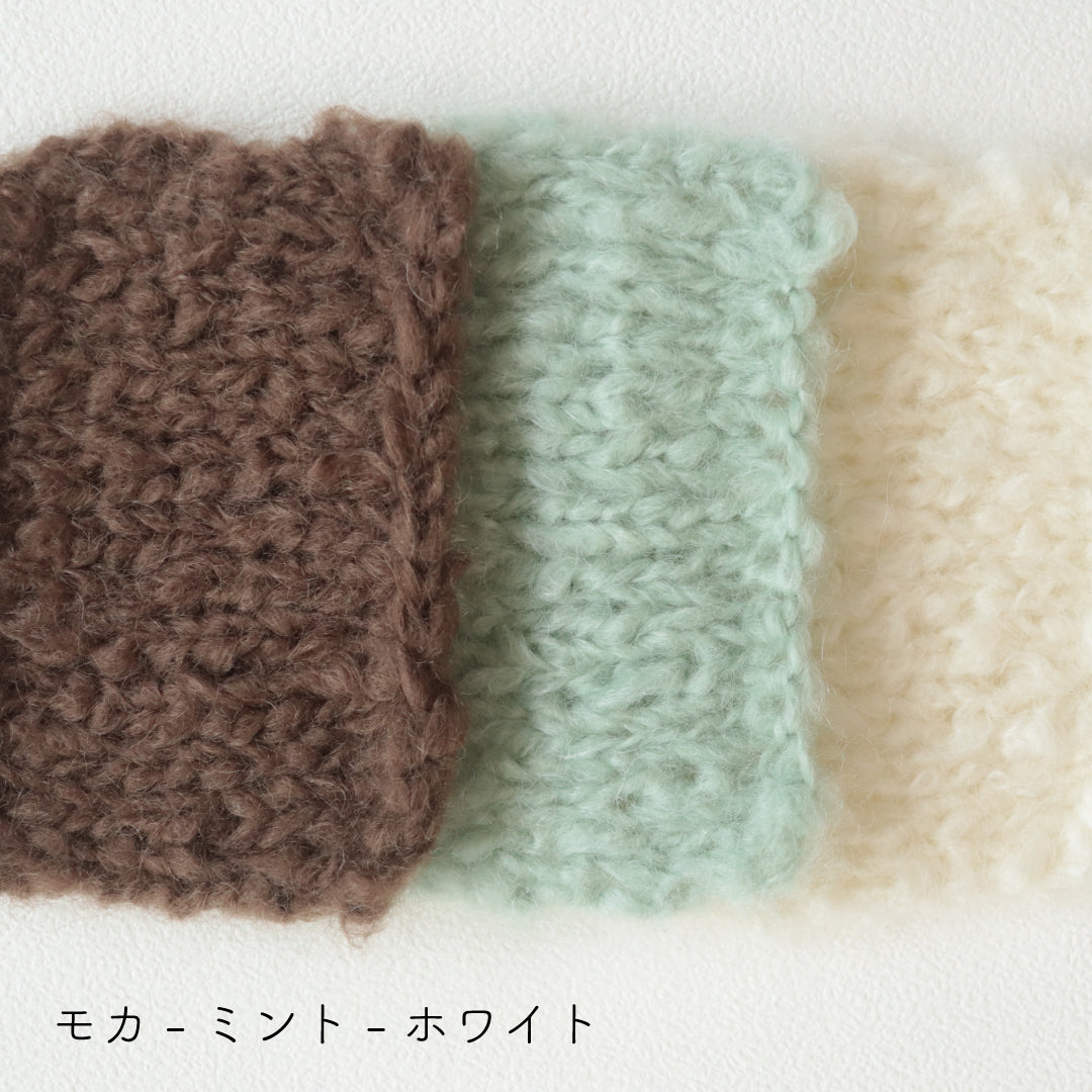 希少なキッドモヘヤをたっぷりと使用した、至極のふわふわ極太糸ができました。生後1年以内のアンゴラ山羊(ヤギ)からのみ刈り取ることが出来る、直径わずか26~32ミクロンの繊細なモヘヤ。糸を起毛させることで、毛質を最も活かした抜群の風合いに仕上げています。しっとりとした光沢があり、甘くなりすぎないこだわりのパステルカラーはどの色で組み合わせても可愛くなります。軽くて暖かく触り心地が抜群なのでウエアやマフラーレッグウォーマーなど肌に触れる秋冬小物が特におすすめ。極太糸はざくざく編み進められるので、作品の完成もはやく楽しく編めます。