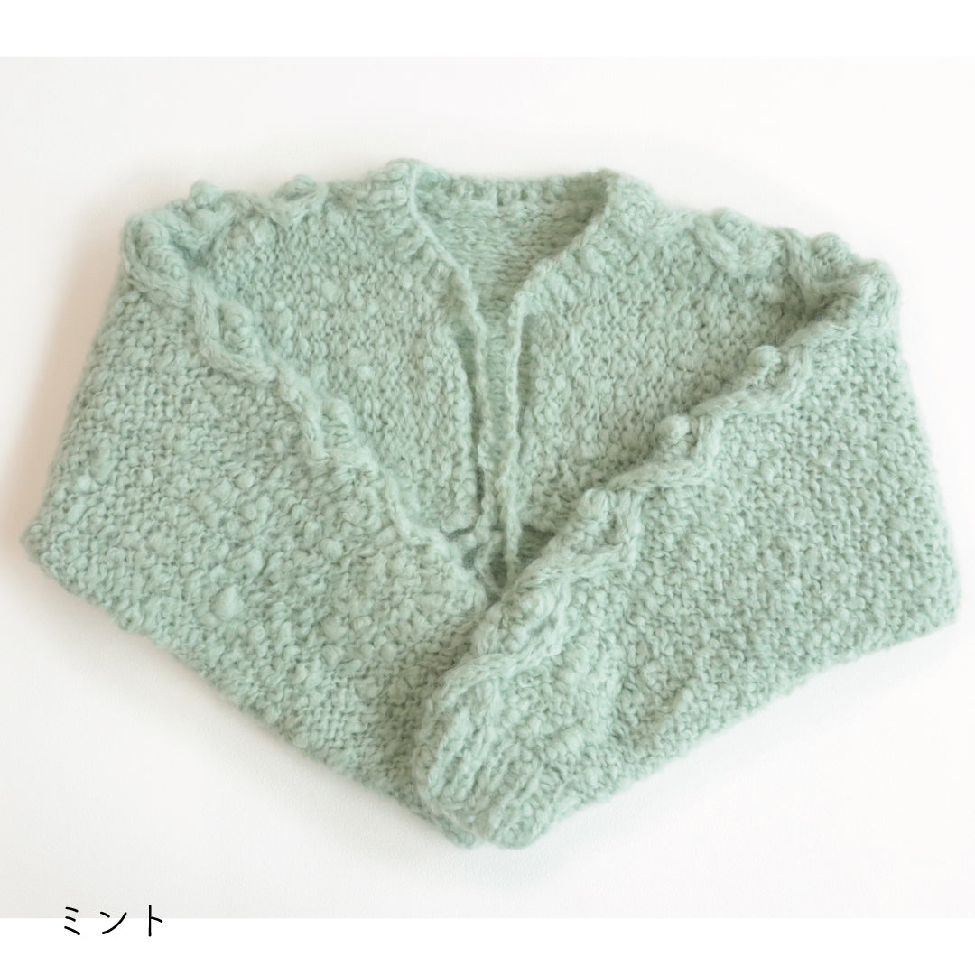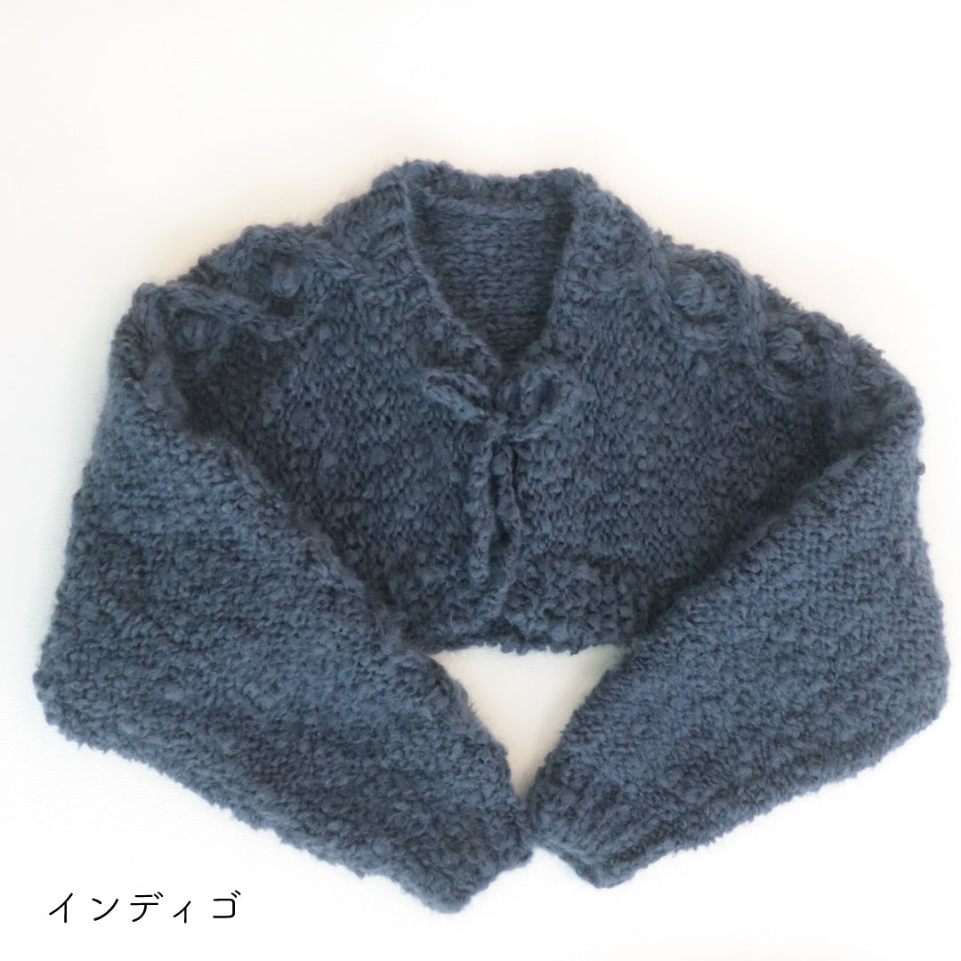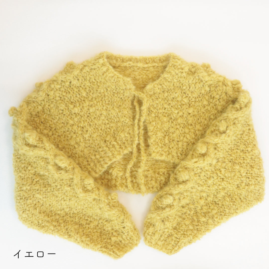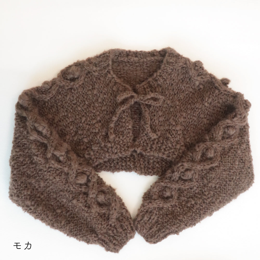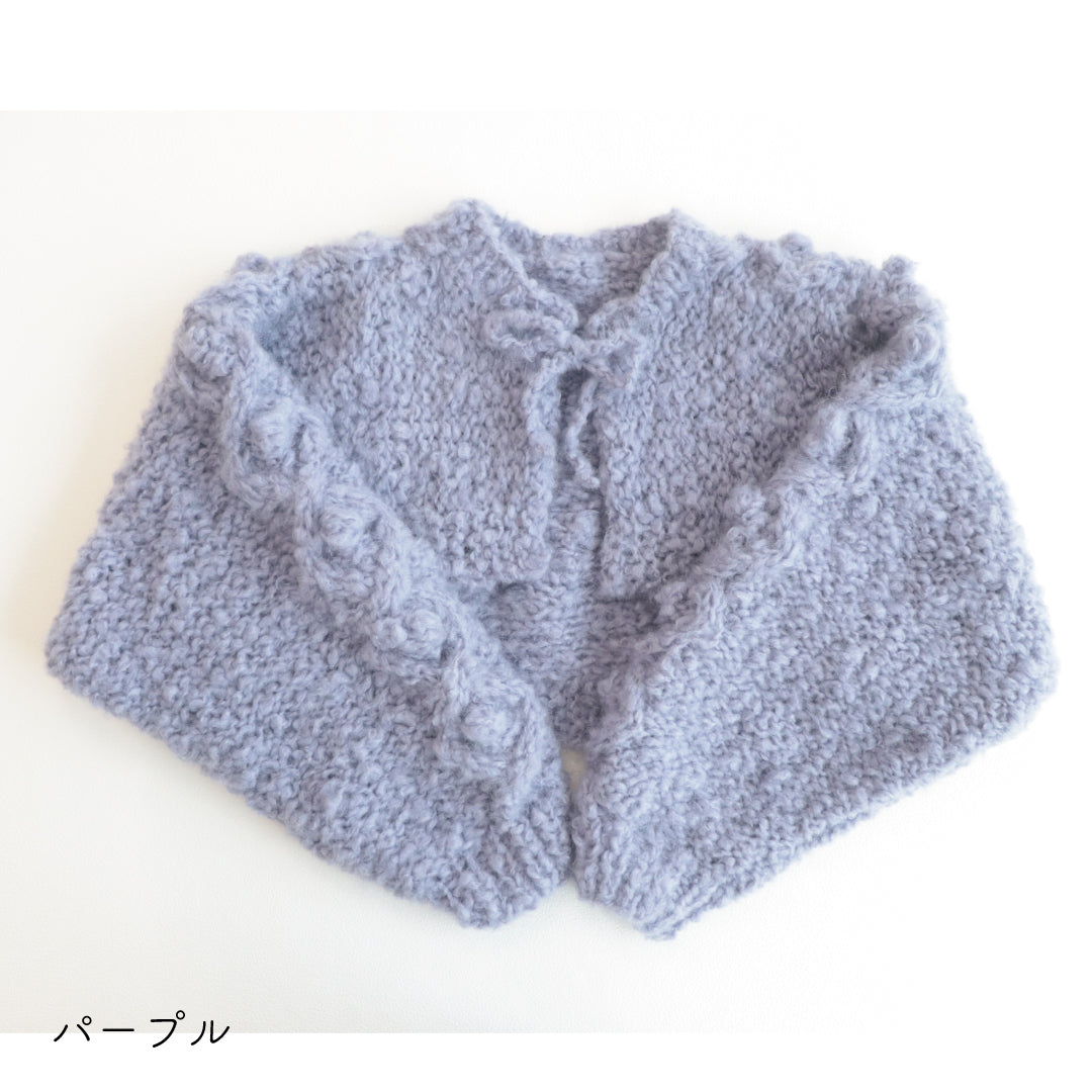 ふんわり優しい肌触りで包み込んでくれる、暖かさ抜群・ボリューム満点のボレロが編めるキットです。 まるで木の実のようなコロンと可愛い玉編みとダイヤ柄の入った両袖がデザインポイント。 首元のリボンをボタンにアレンジしても可愛く仕上がりそうです。 着るだけでなく、マフラーとしてグルグル巻いて使うのもおすすめです!様々なコーディネートをお楽しみください♪