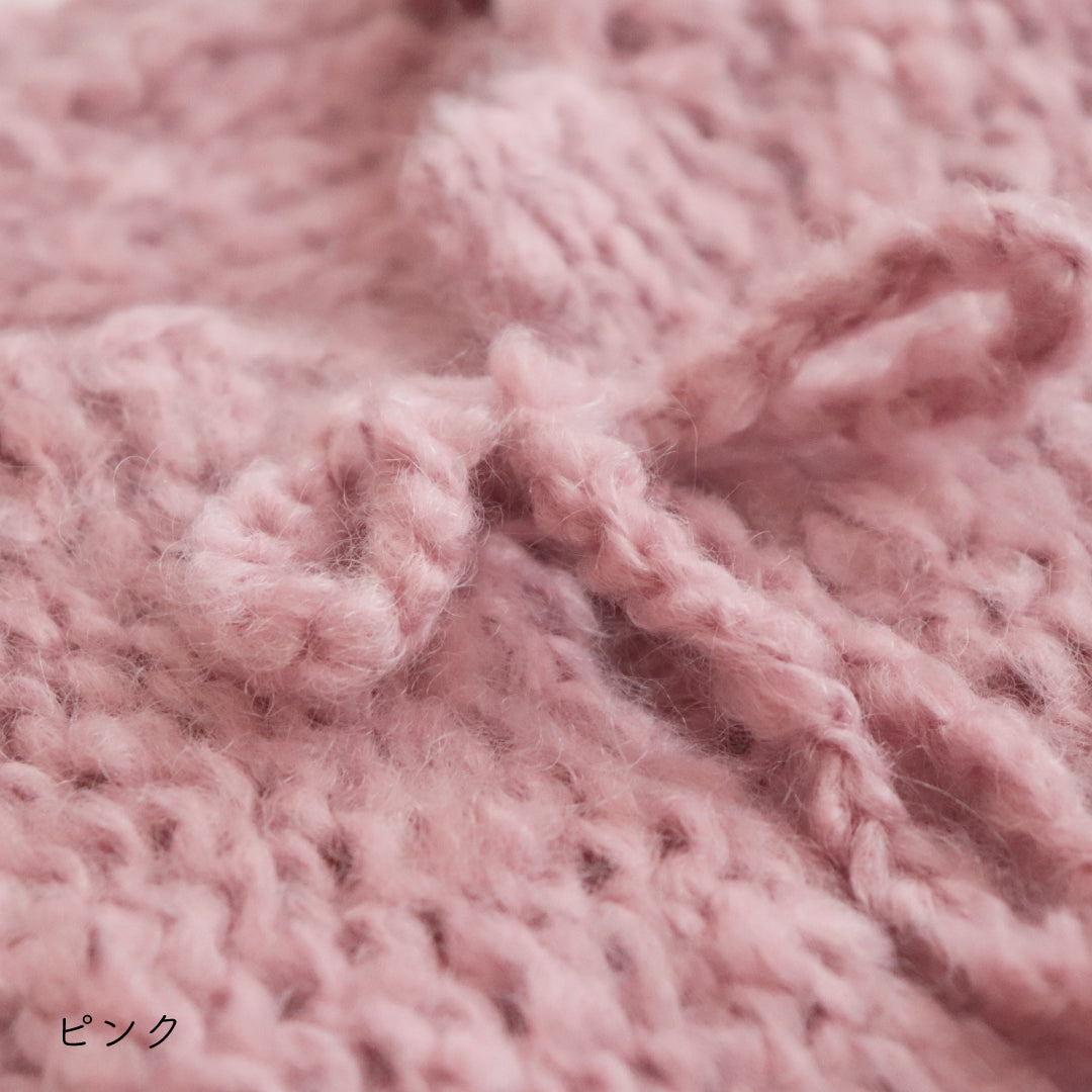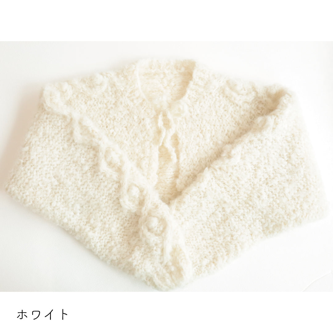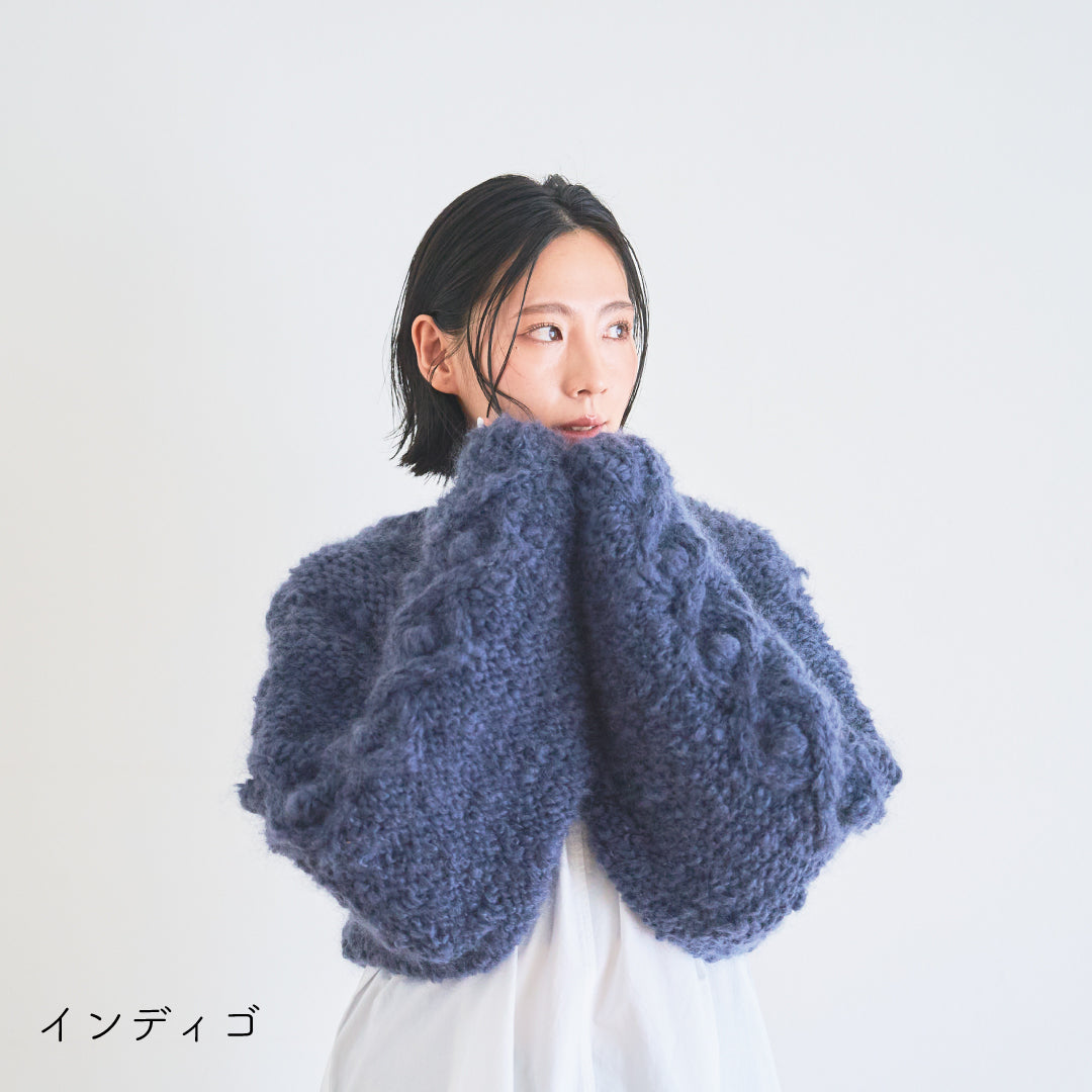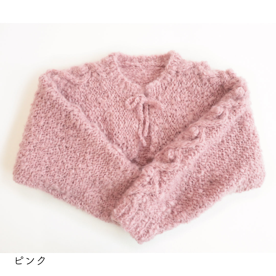ふんわり優しい肌触りで包み込んでくれる、暖かさ抜群・ボリューム満点のボレロが編めるキットです。 まるで木の実のようなコロンと可愛い玉編みとダイヤ柄の入った両袖がデザインポイント。 首元のリボンをボタンにアレンジしても可愛く仕上がりそうです。 着るだけでなく、マフラーとしてグルグル巻いて使うのもおすすめです!様々なコーディネートをお楽しみください♪