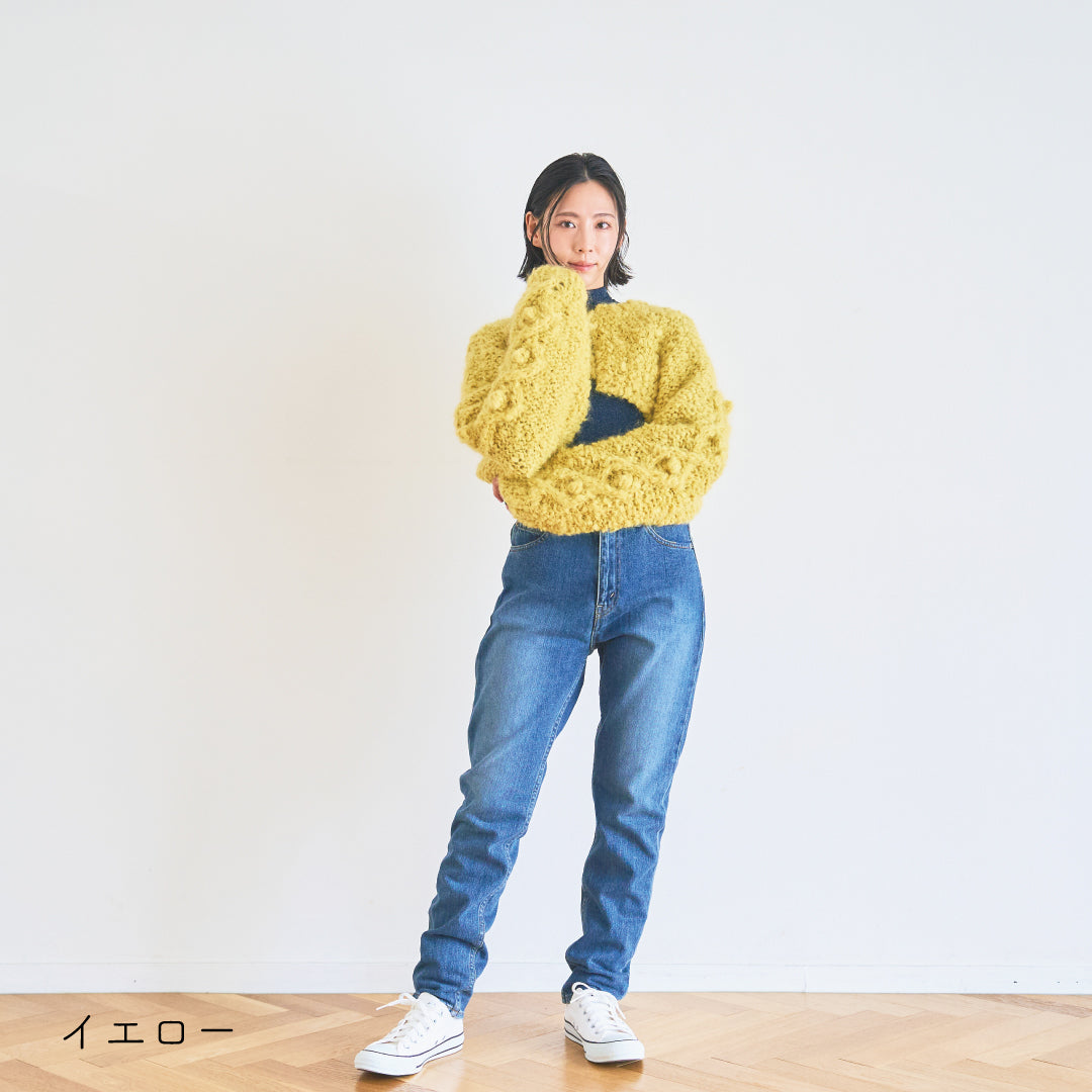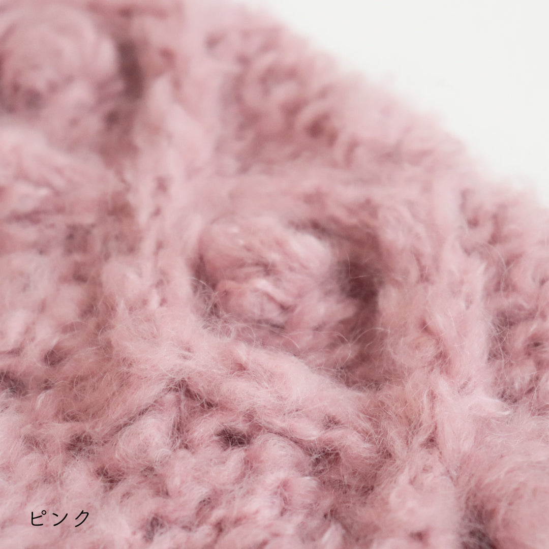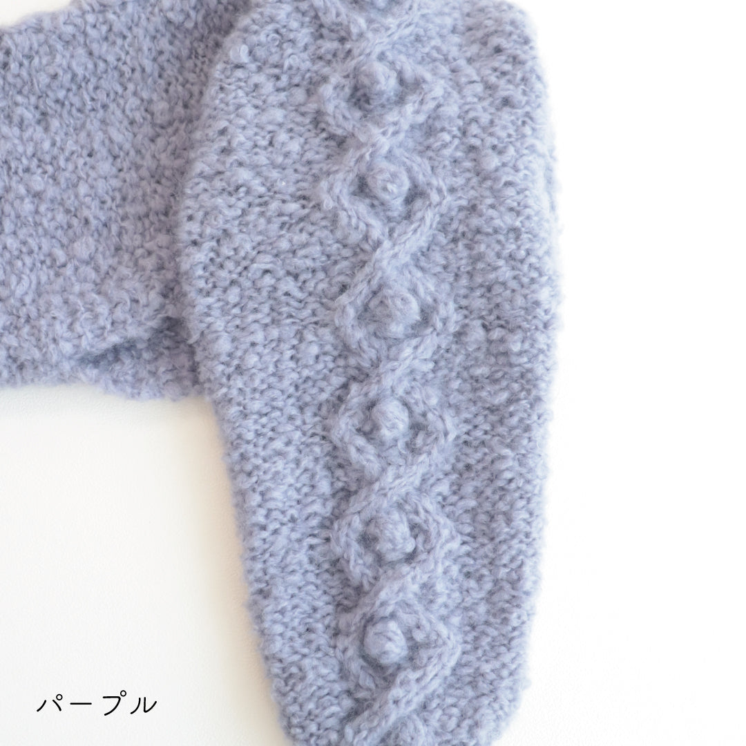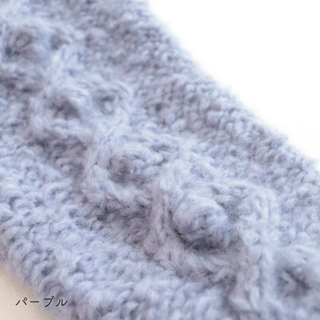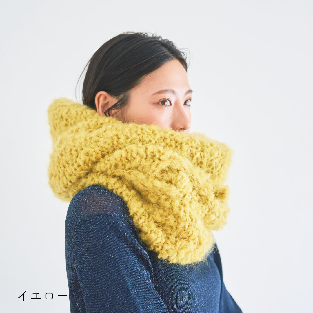 ふんわり優しい肌触りで包み込んでくれる、暖かさ抜群・ボリューム満点のボレロが編めるキットです。 まるで木の実のようなコロンと可愛い玉編みとダイヤ柄の入った両袖がデザインポイント。 首元のリボンをボタンにアレンジしても可愛く仕上がりそうです。 着るだけでなく、マフラーとしてグルグル巻いて使うのもおすすめです!様々なコーディネートをお楽しみください♪
