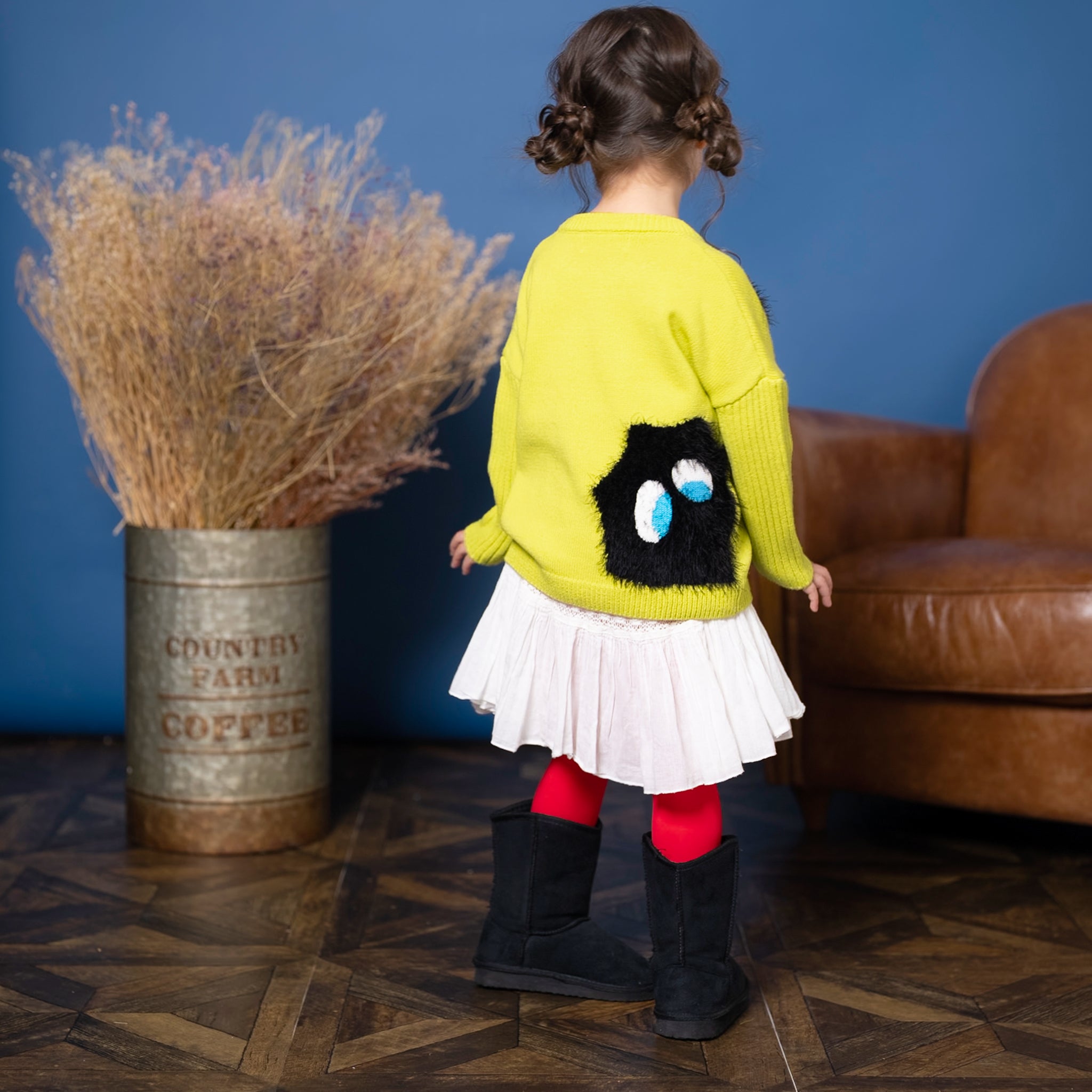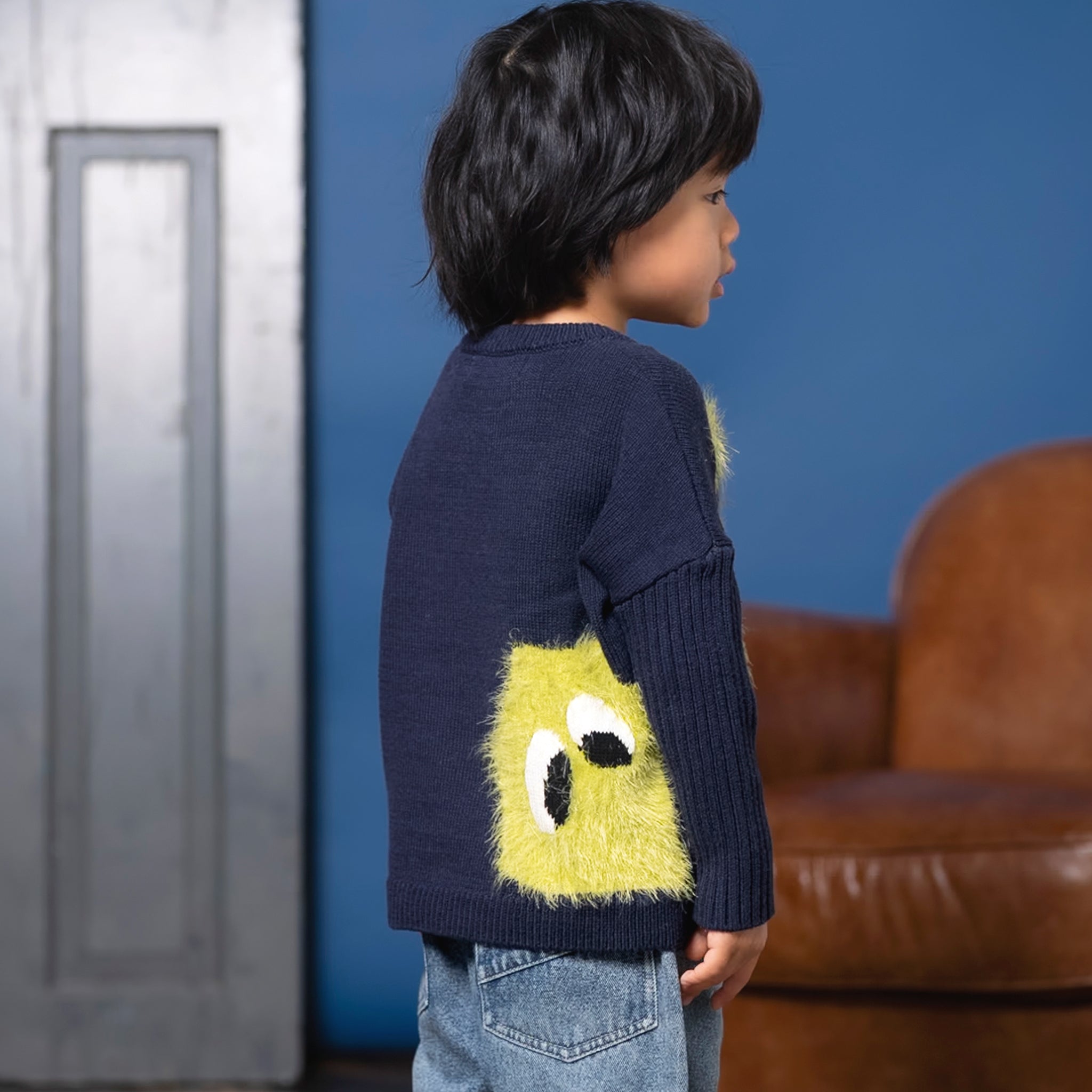 このプルオーバーは、目を引くフワフワのドットフェイス柄が特徴で、背面にも大きな同様のデザインが施されています。