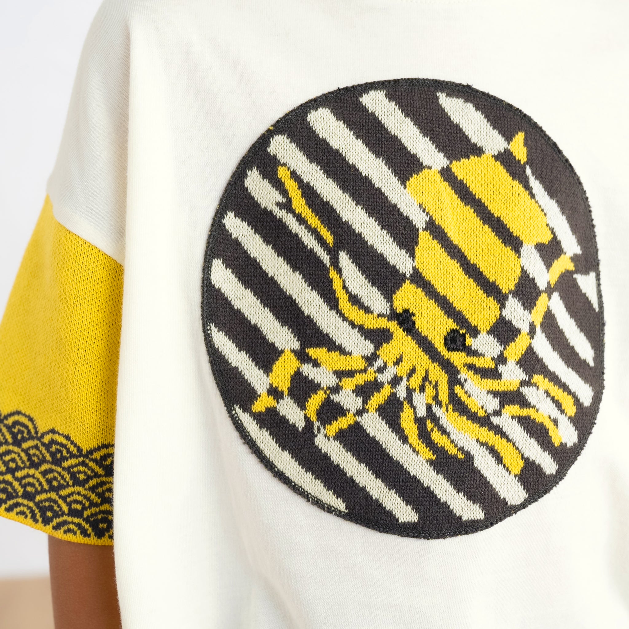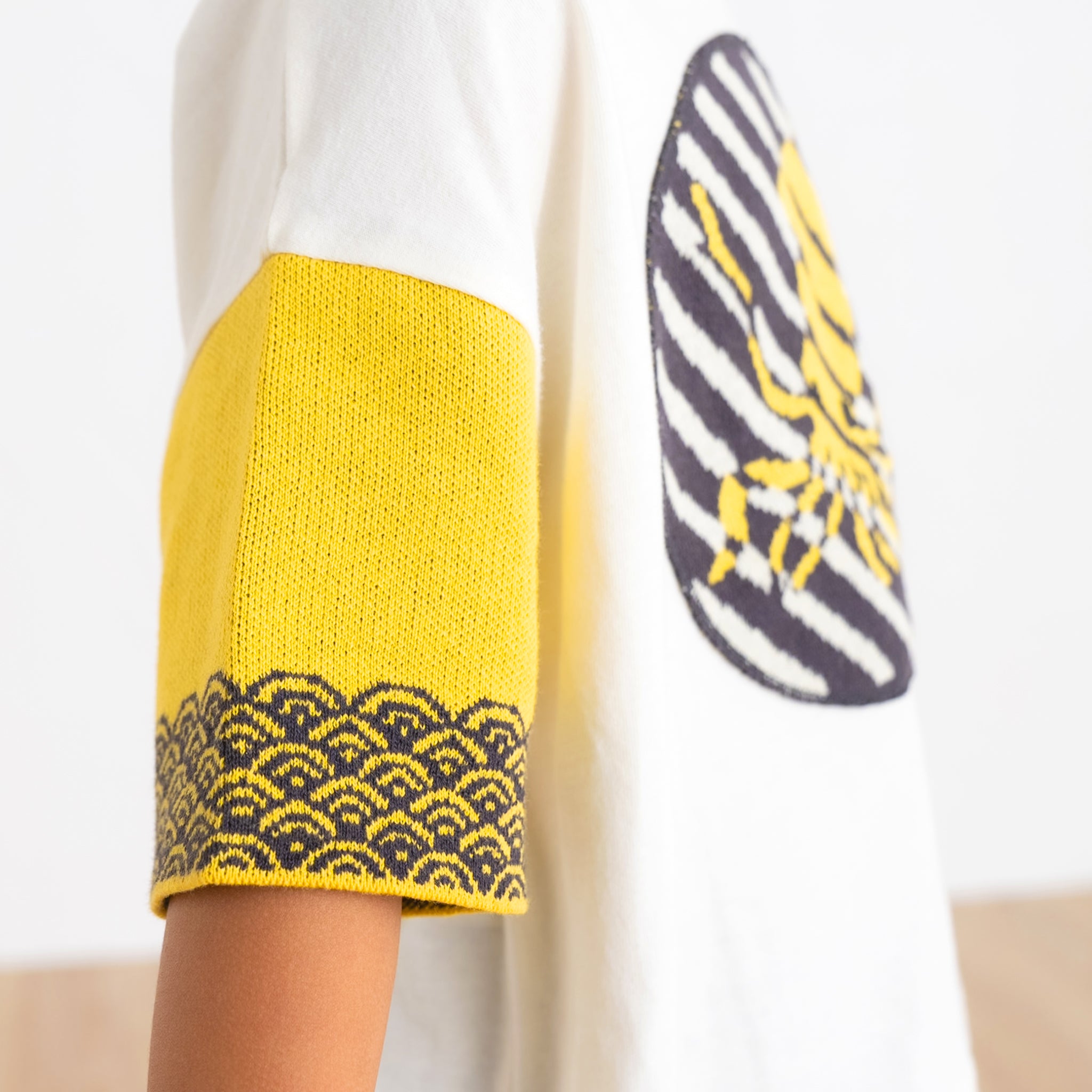 ・ニット袖の波模様と身頃のボーダー柄ニットワッペンが夏らしくユニークなデザイン。