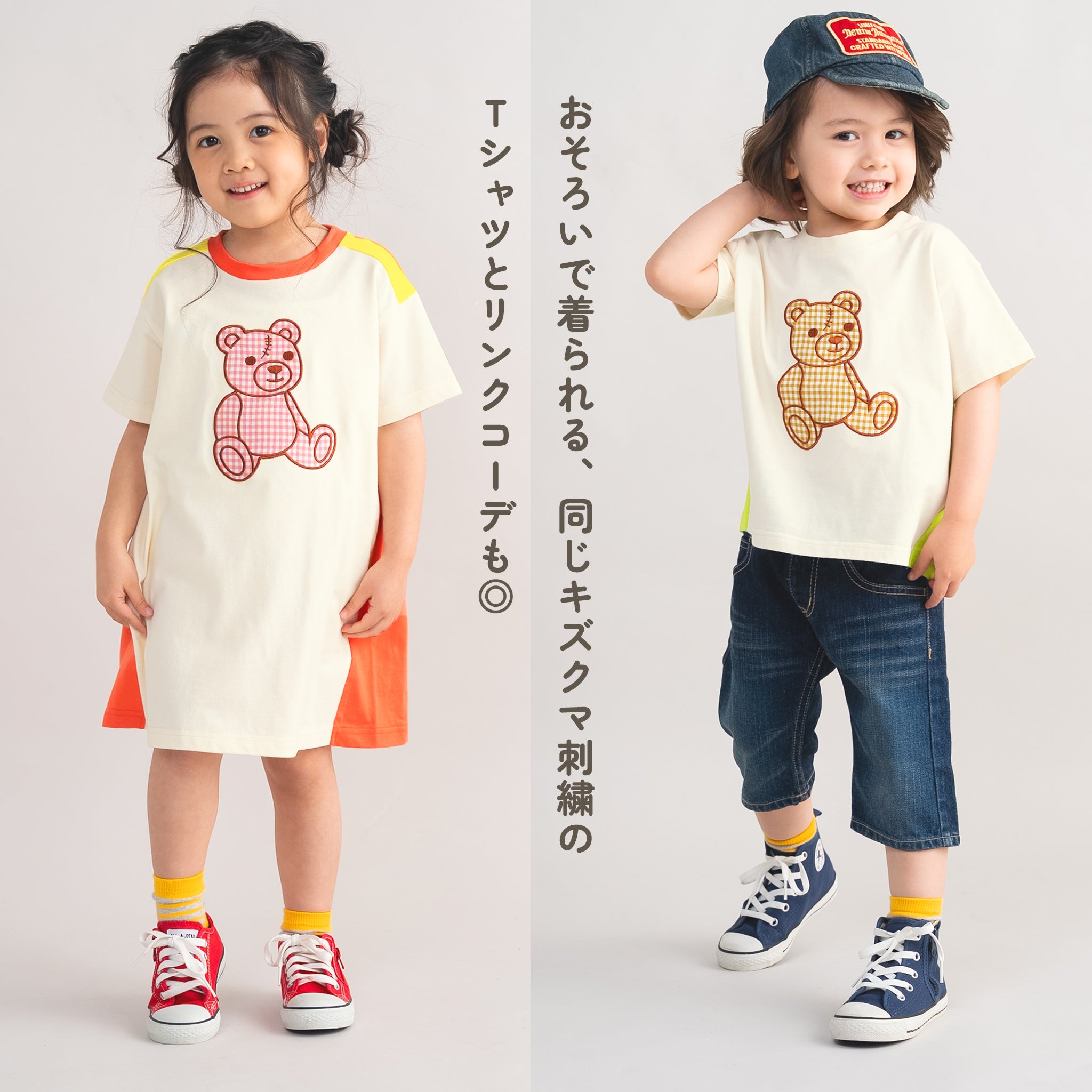 同じキズクマ刺繍のTシャツがあり、姉弟でのリンクコーデが楽しめるのも魅力。