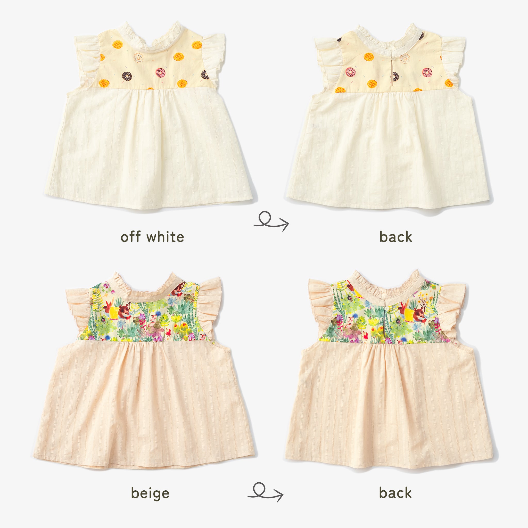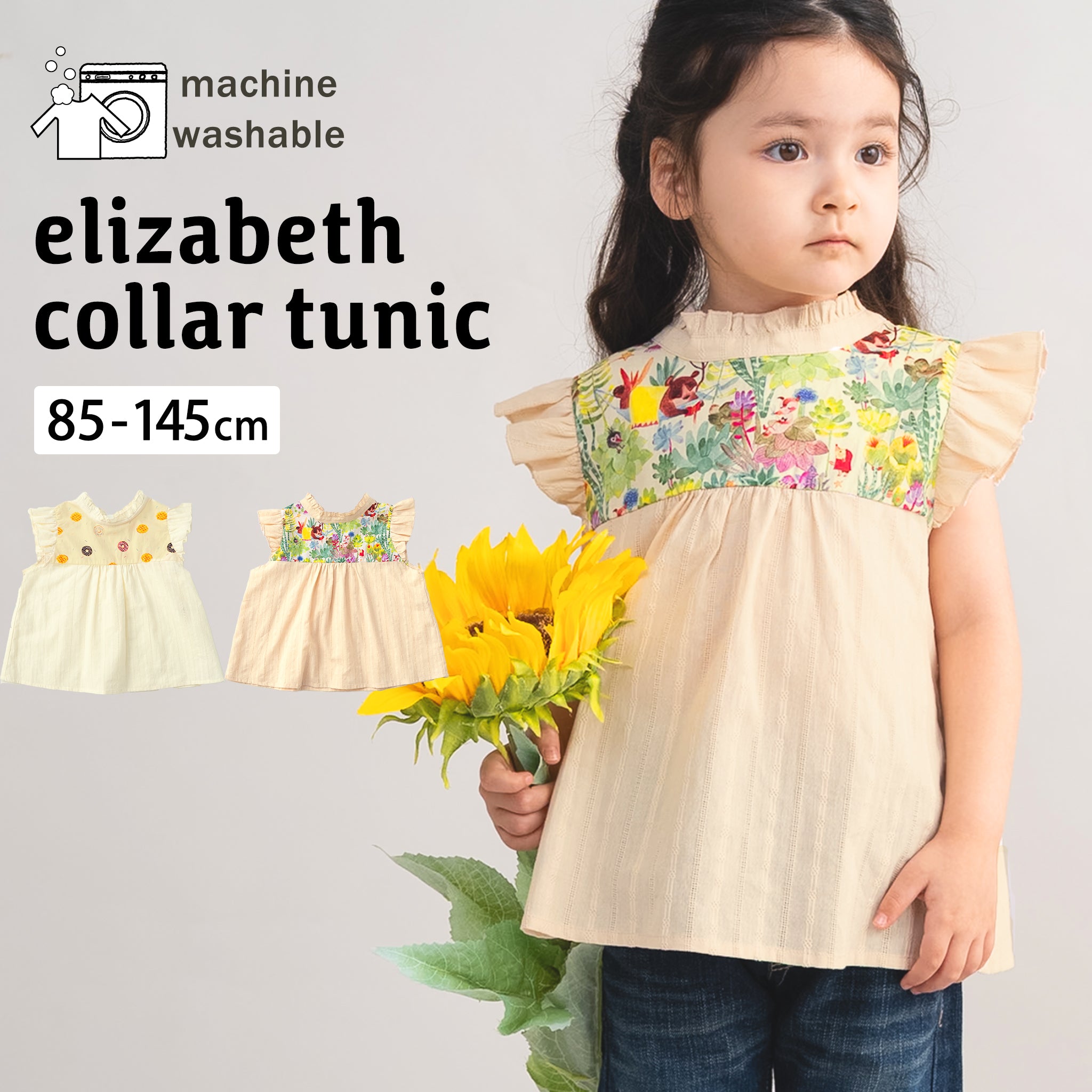ふんわりとしたシルエットがかわいい、エリザベスカラーチュニック。 首元のエリザベスカラーが上品なアクセントになり、1枚で着ても華やかな印象に仕上がります。 カラーは、ポップで楽しいドーナツ柄のオフホワイトと、童話の世界を思わせる動物柄の薄いベージュの2色展開。 袖はノースリーブ仕様にフリルをあしらい、涼しげで女の子らしいデザインです。 チュニック丈なので、レギンスやデニム、ショートパンツなど、さまざまなボトムスと相性◎ デイリー使いはもちろん、お出かけやちょっとしたおめかしにも活躍する、着回し力の高い一枚です。 |