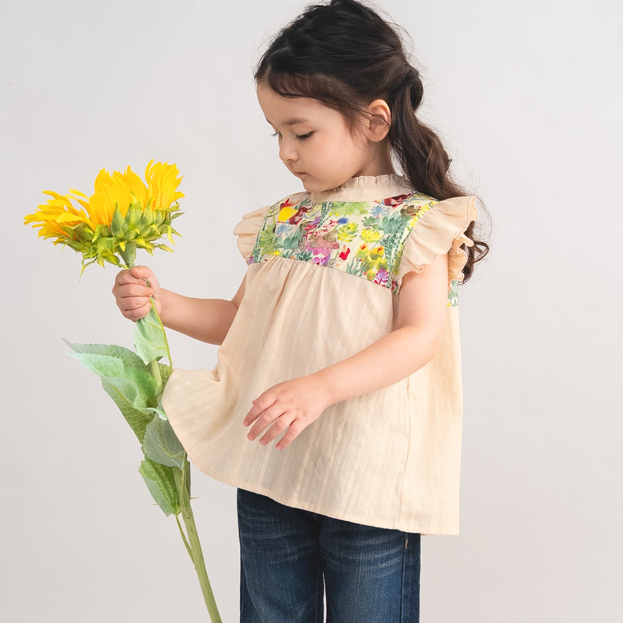 ノースリーブですがフリルがあるので、腕まわりがさみしく見えず、女の子らしさたっぷり。