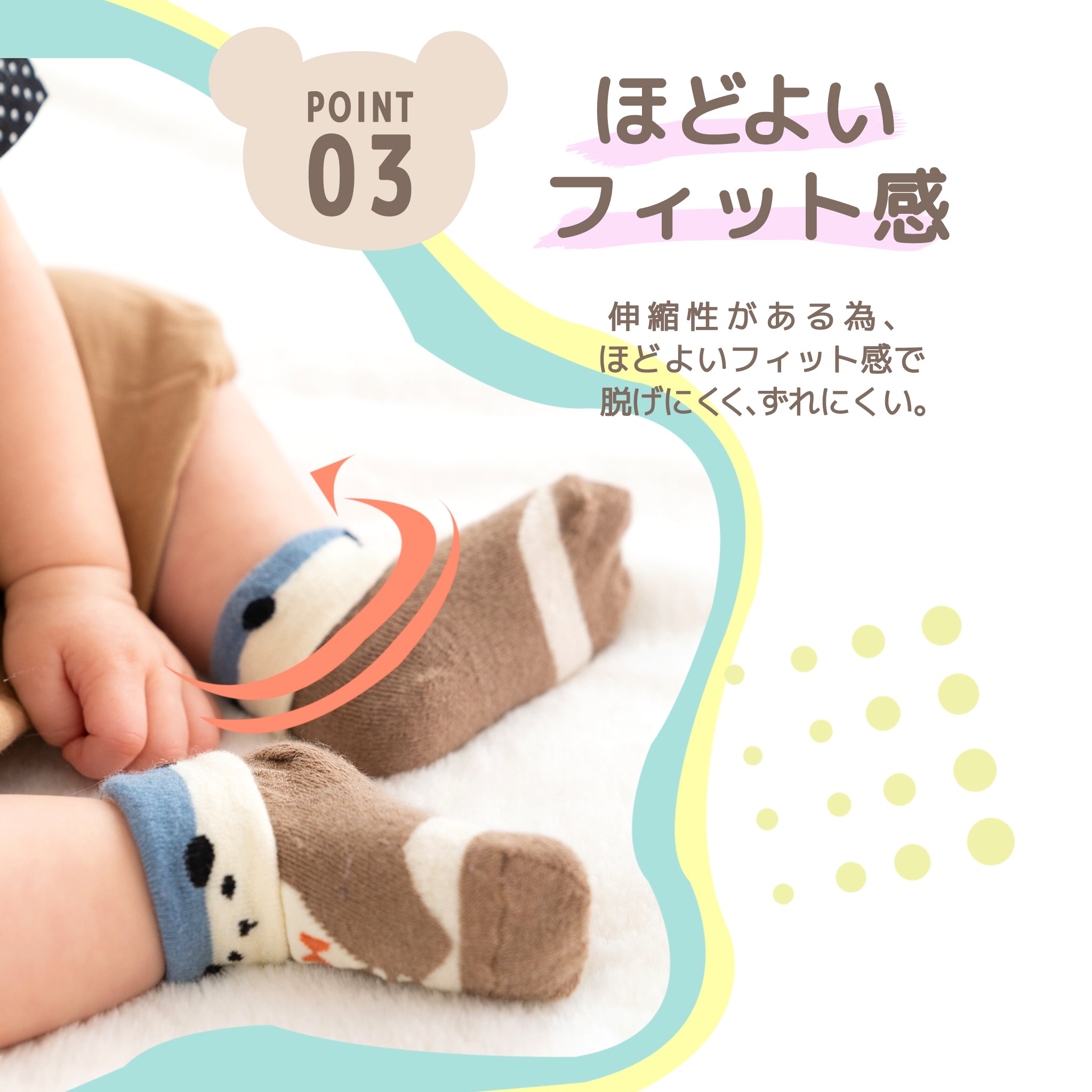 | 日本製のベビーソックスは、赤ちゃんの足元を優しく包み込むために設計されています。 ・立体的なパンダとしろくまの柄が特徴で、見た目にもかわいらしさを演出します。 ・滑り止め付きで、活発に動くお子様の安全をサポート。 ・通気性と伸縮性に優れたコットン素材を使用しており、春夏秋冬を通じて快適に着用できます。 ・保育園や幼稚園での使用はもちろん、結婚式や出産祝いのギフトとしても最適です。 |