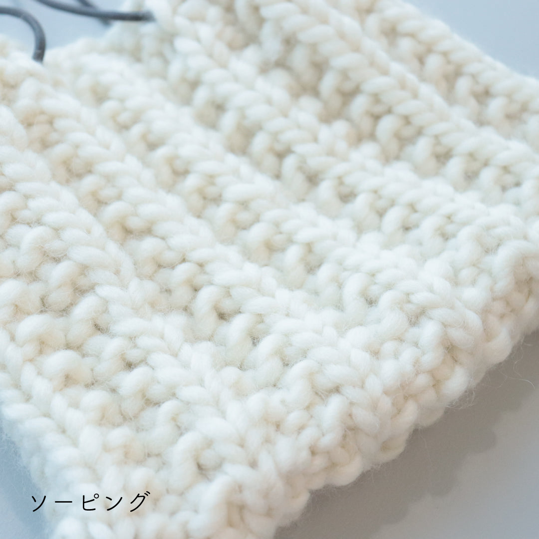 ソーピングを選びました。糸が太いのでざくざく編み進めてあっという間に1枚編めました。可愛くなる予感しかないので楽しみです。