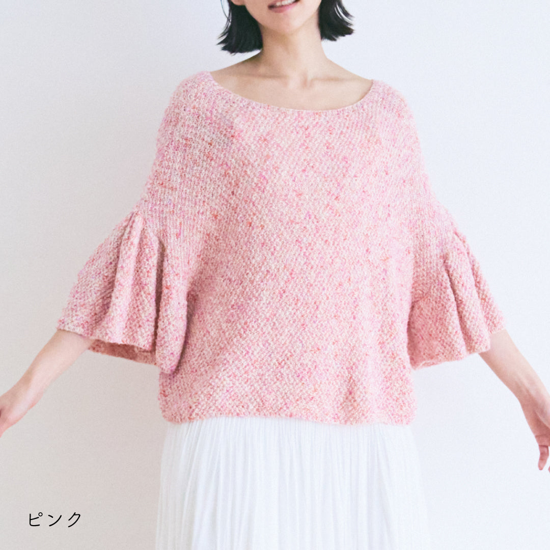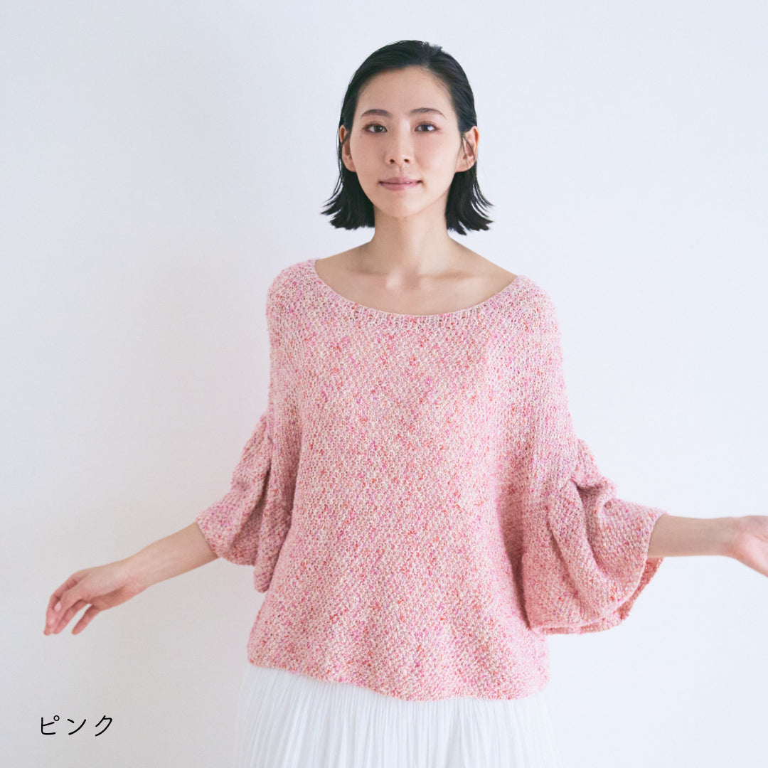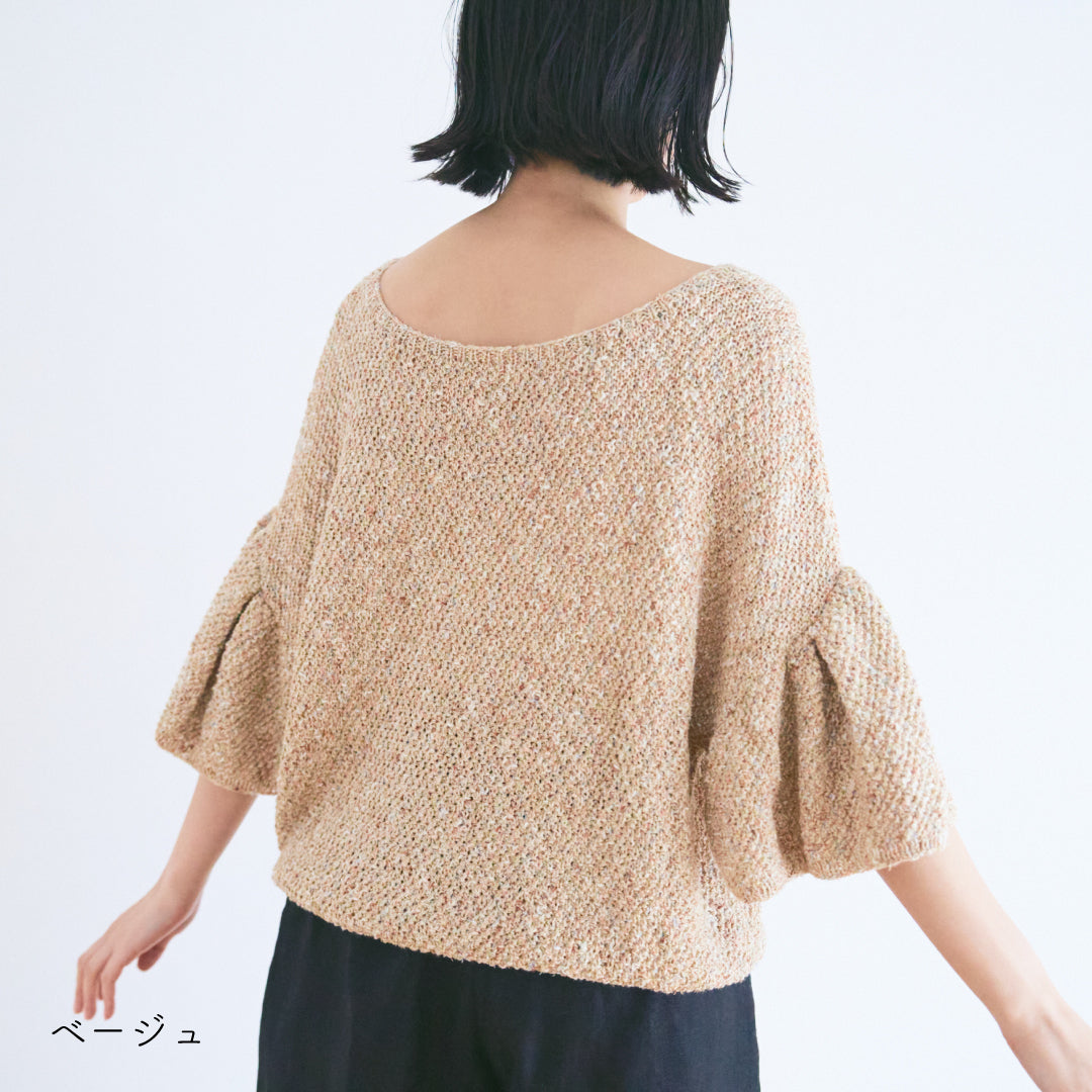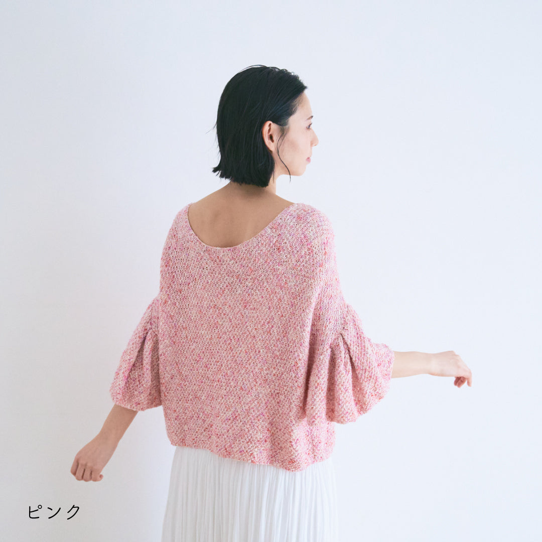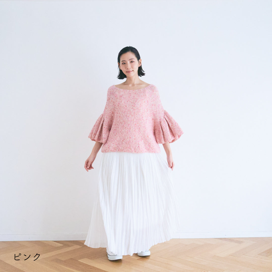 光沢のあるRuFが程よくきらめいて、編みながら気分もあがります♪編地は棒針の変化かのこ編み、袖ははぎ合わせながらタックを作っていく仕様です。衿ぐりは広めのデザインなので、中にキャミソールやシアーなインナー、タートルネックなどと合わせて季節を問わずお楽しみください♡