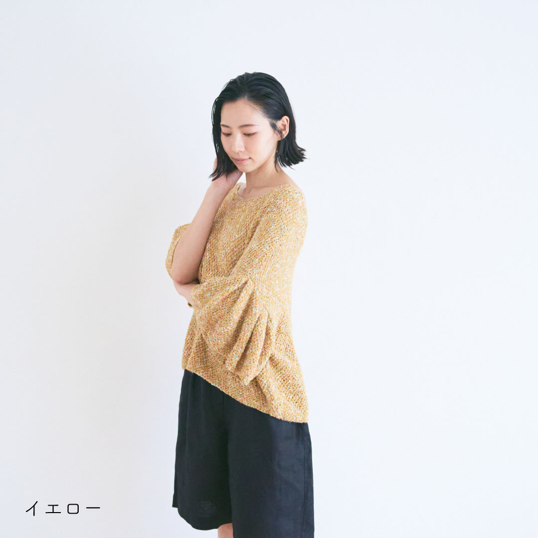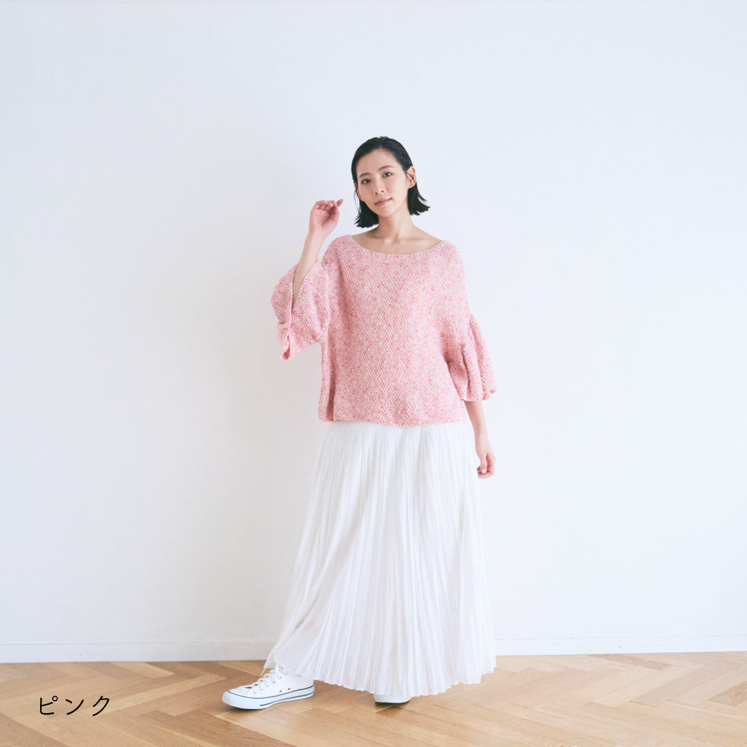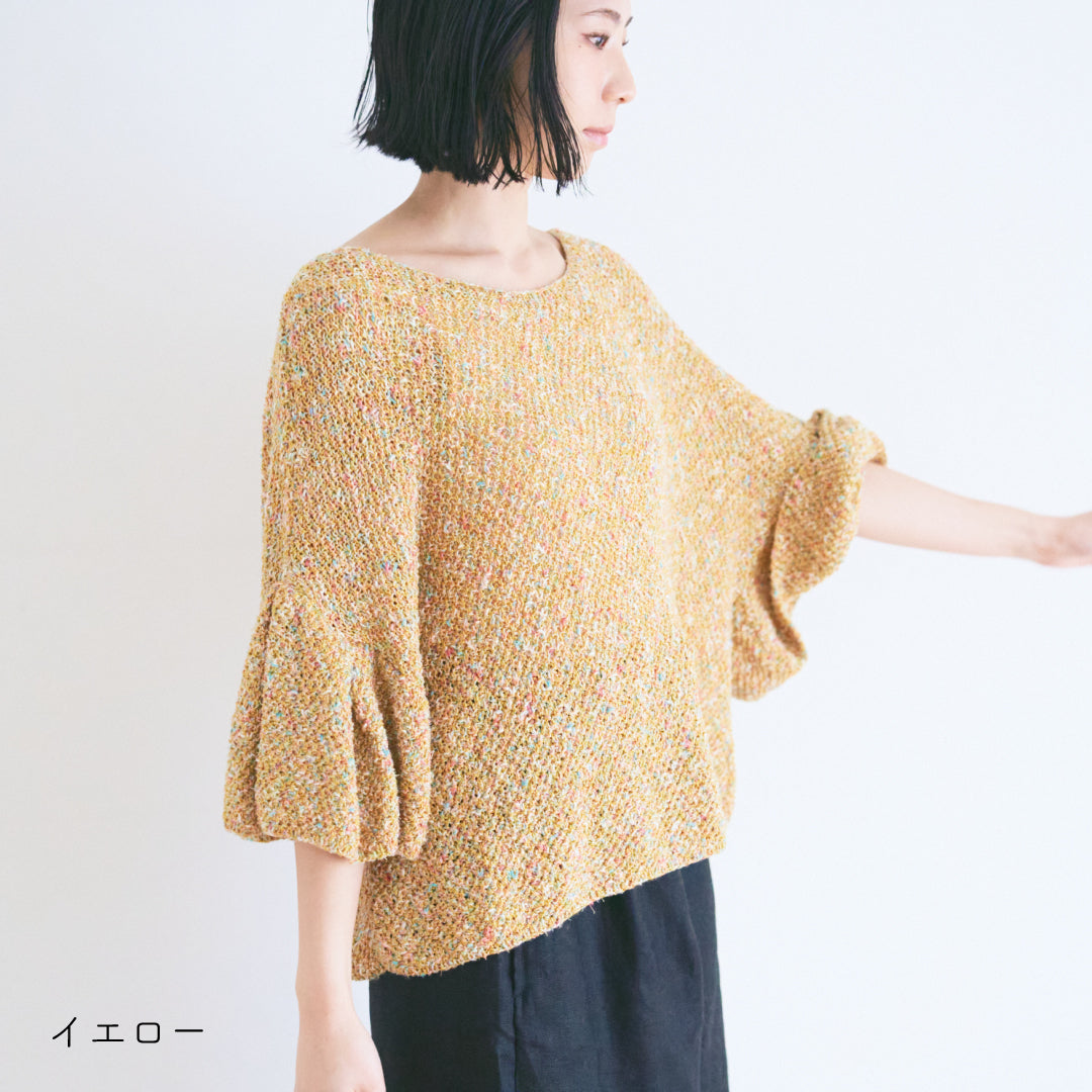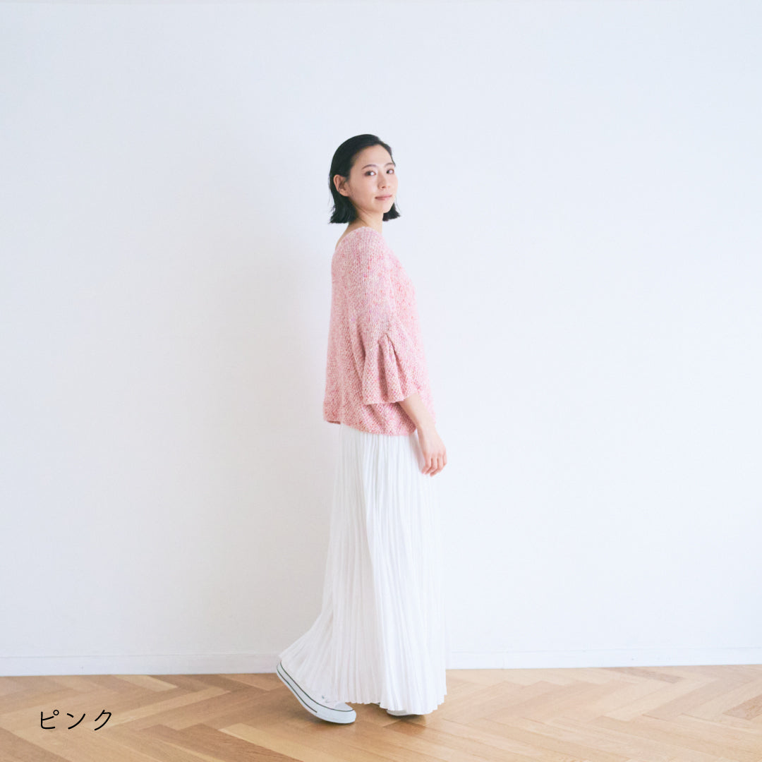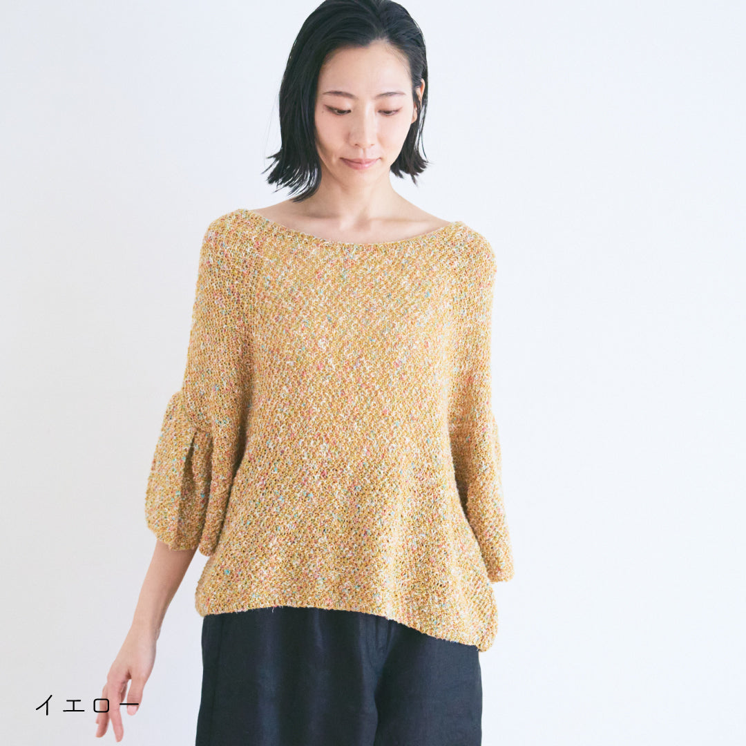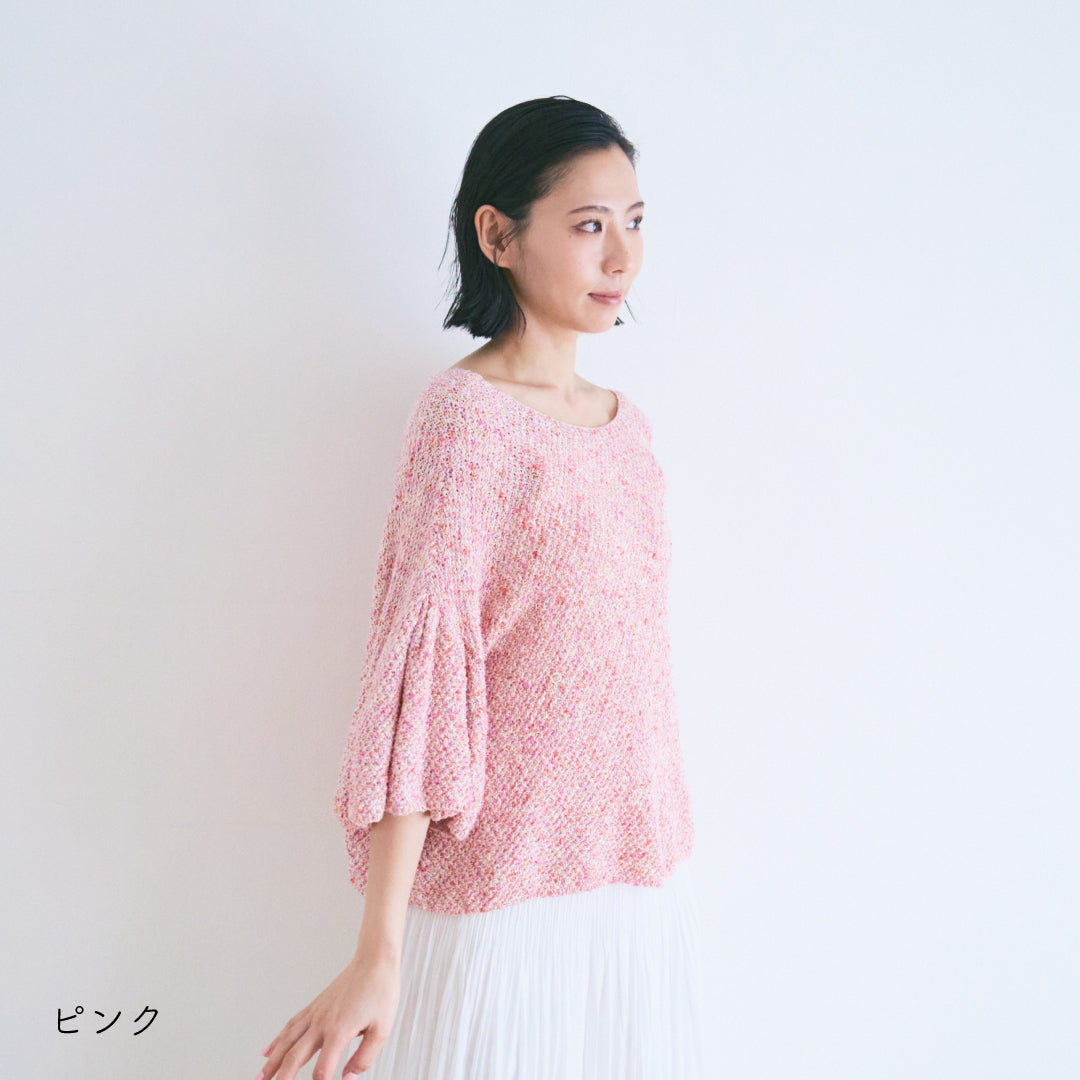 光沢のあるRuFが程よくきらめいて、編みながら気分もあがります♪編地は棒針の変化かのこ編み、袖ははぎ合わせながらタックを作っていく仕様です。衿ぐりは広めのデザインなので、中にキャミソールやシアーなインナー、タートルネックなどと合わせて季節を問わずお楽しみください♡