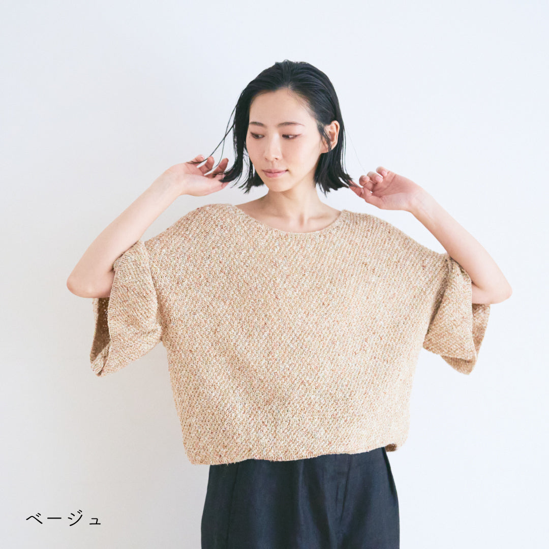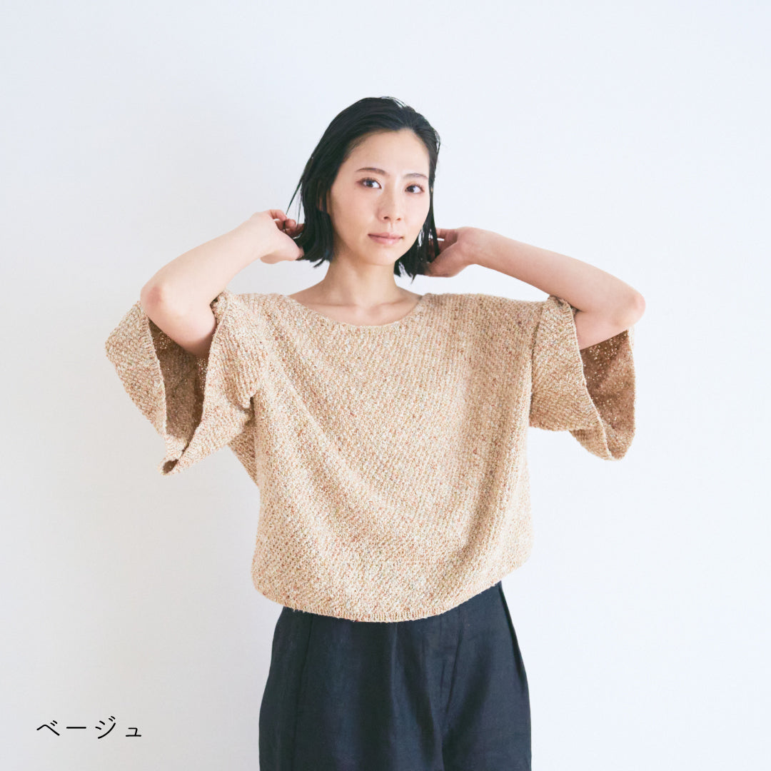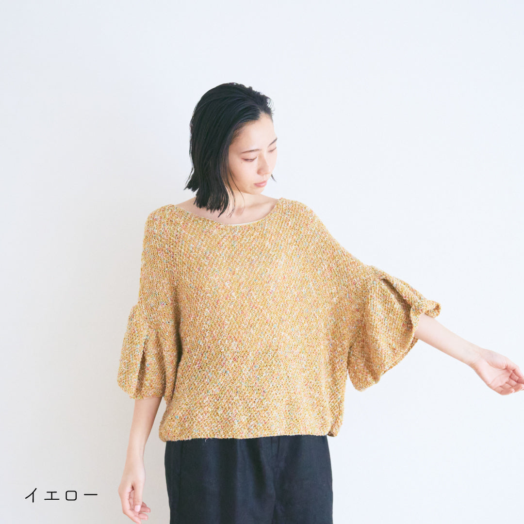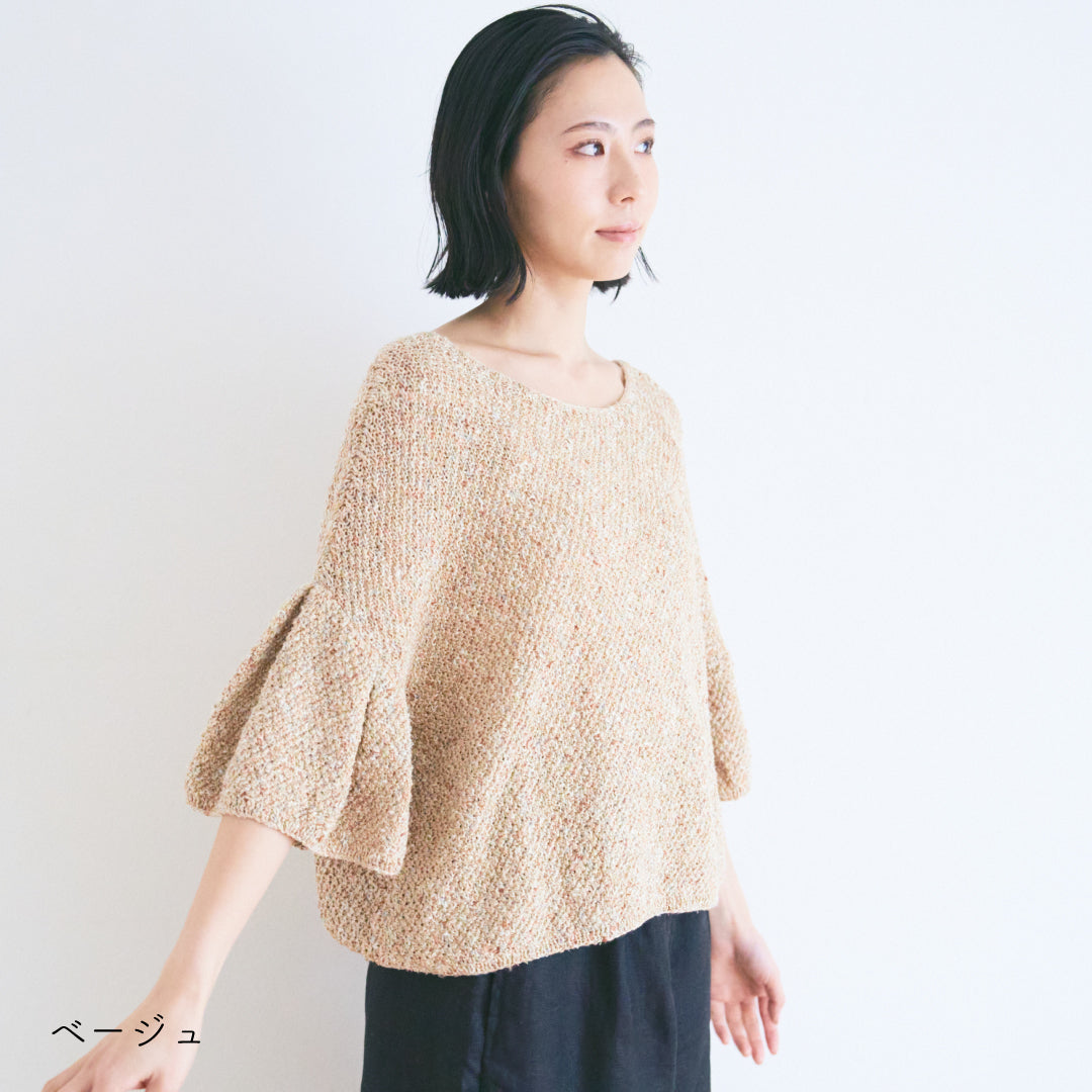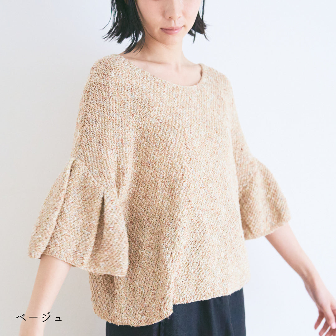 光沢のあるRuFが程よくきらめいて、編みながら気分もあがります♪編地は棒針の変化かのこ編み、袖ははぎ合わせながらタックを作っていく仕様です。衿ぐりは広めのデザインなので、中にキャミソールやシアーなインナー、タートルネックなどと合わせて季節を問わずお楽しみください♡