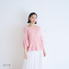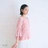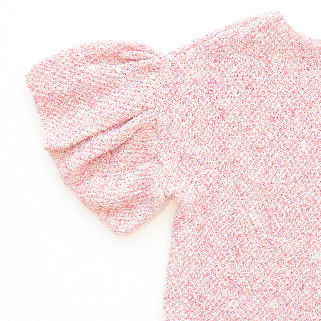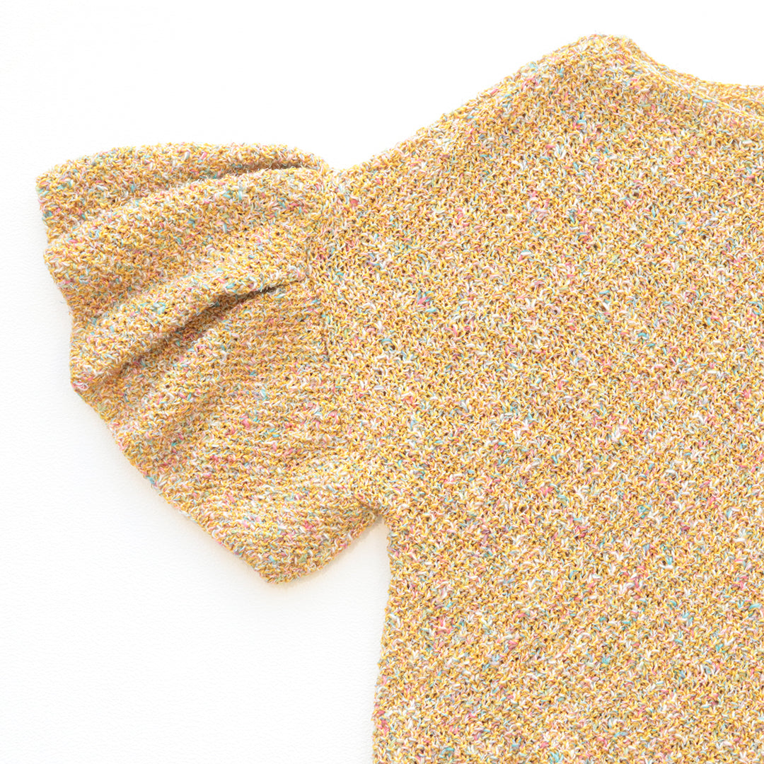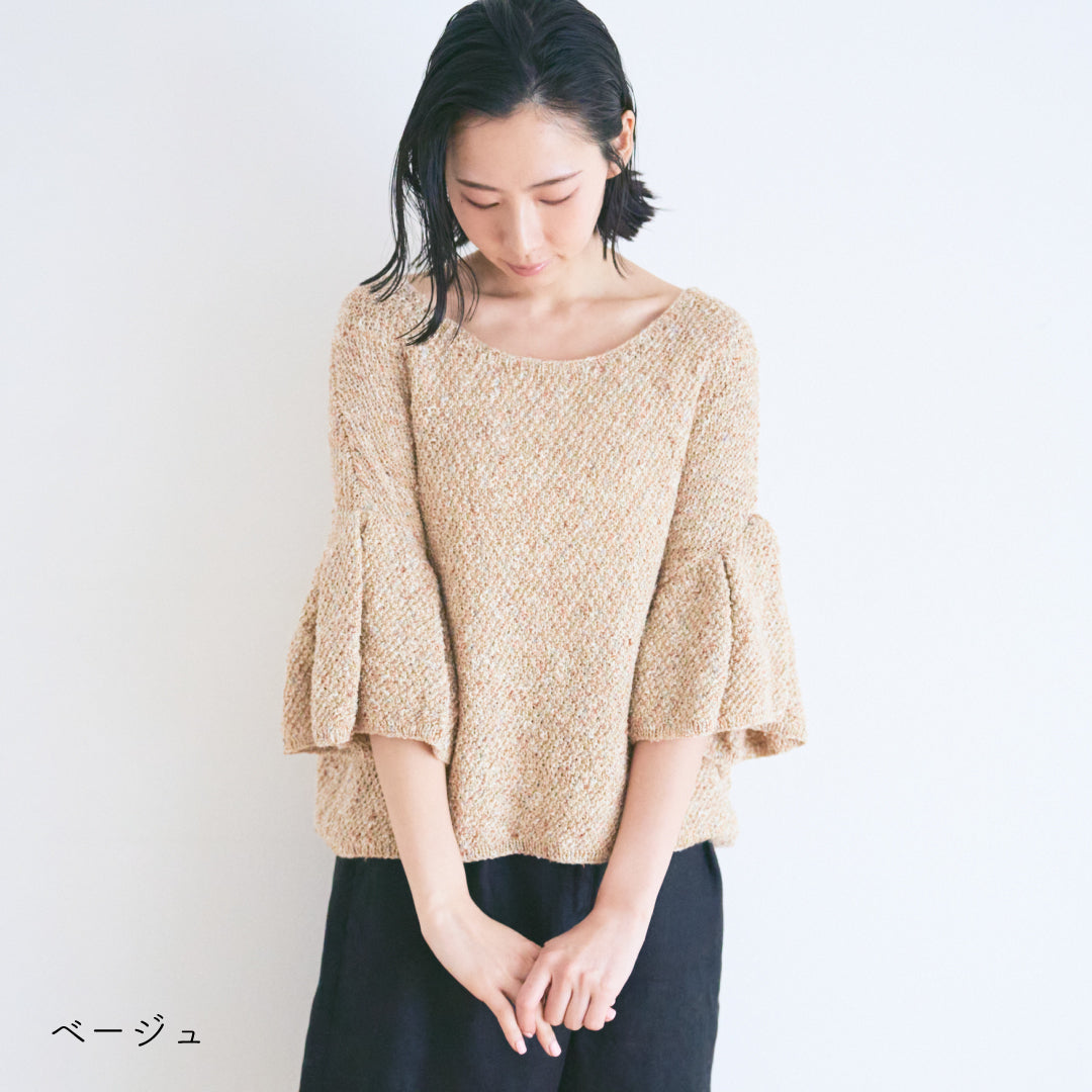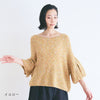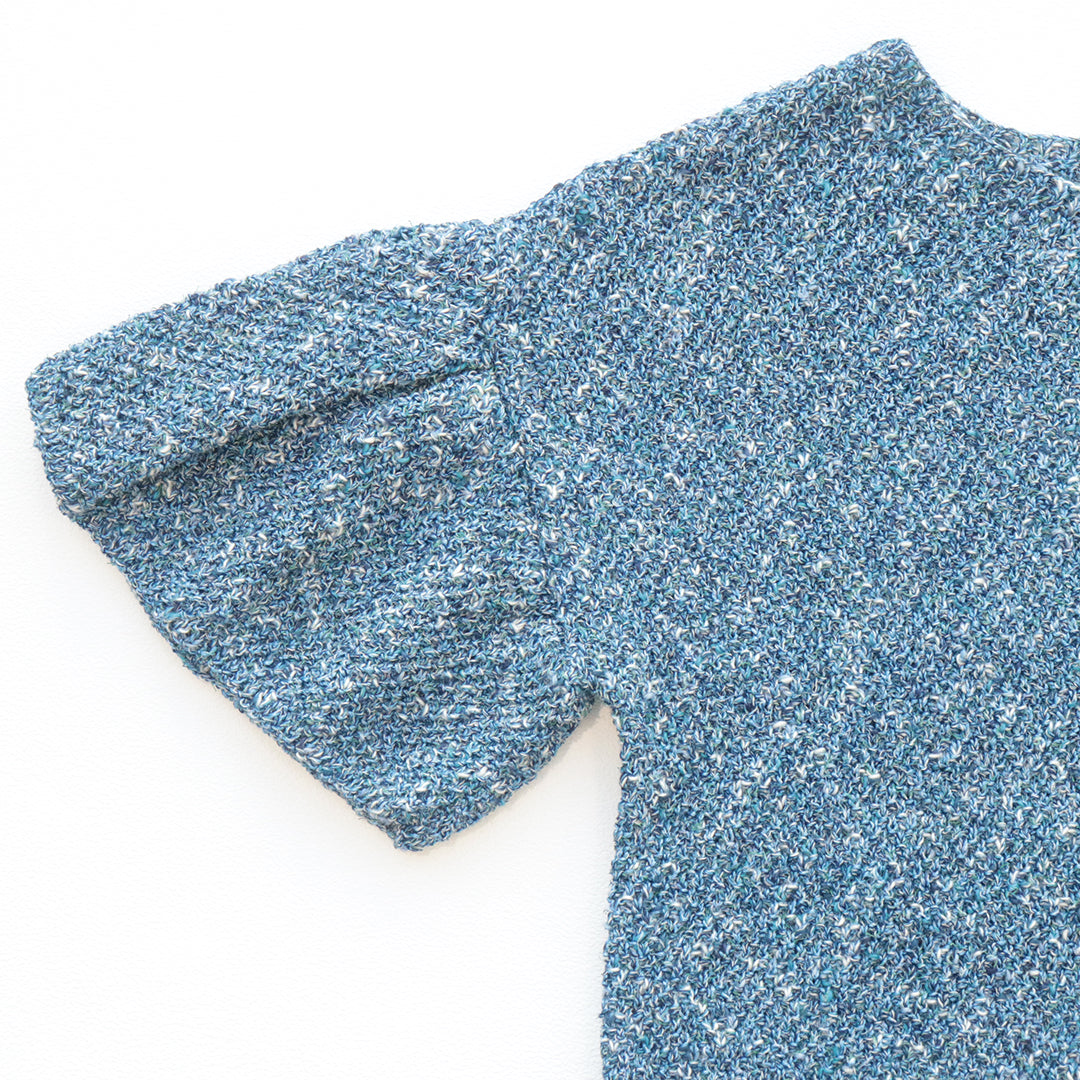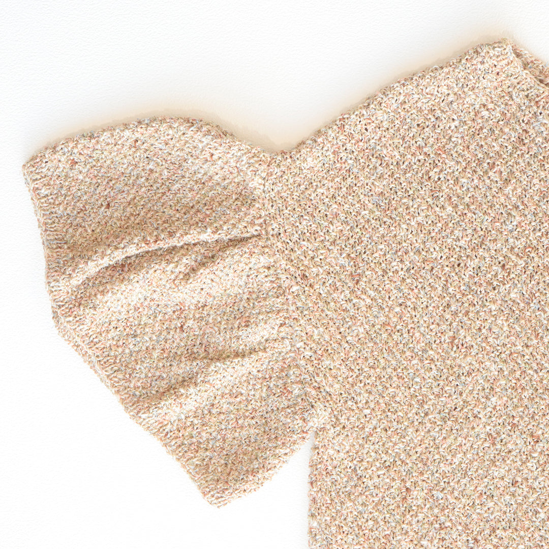 光沢のあるRuFが程よくきらめいて、編みながら気分もあがります♪編地は棒針の変化かのこ編み、袖ははぎ合わせながらタックを作っていく仕様です。衿ぐりは広めのデザインなので、中にキャミソールやシアーなインナー、タートルネックなどと合わせて季節を問わずお楽しみください♡