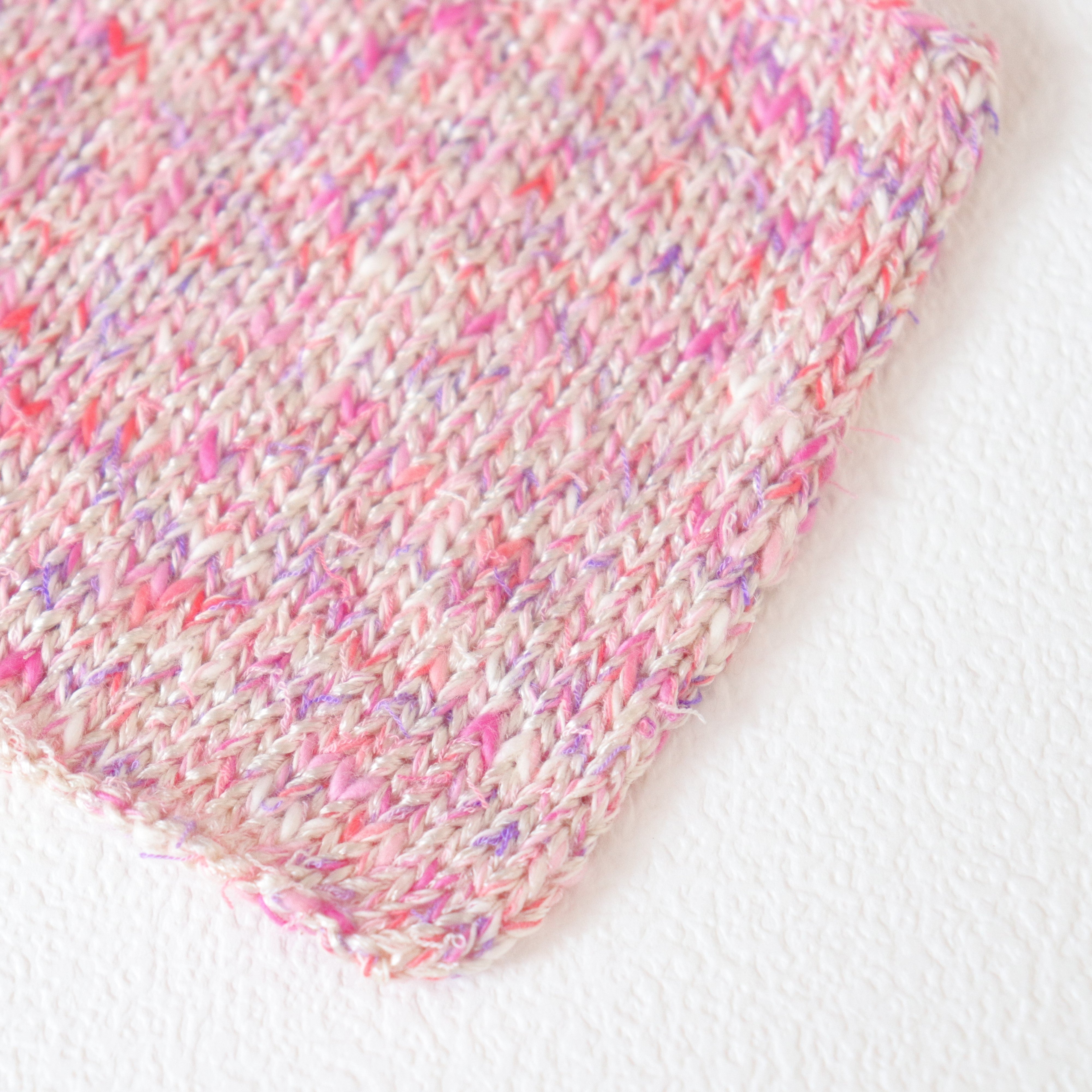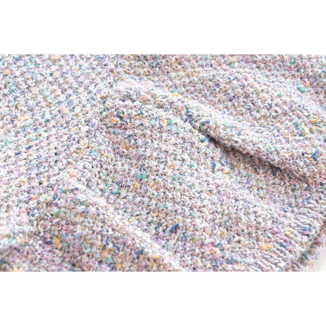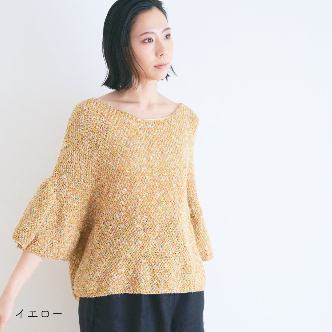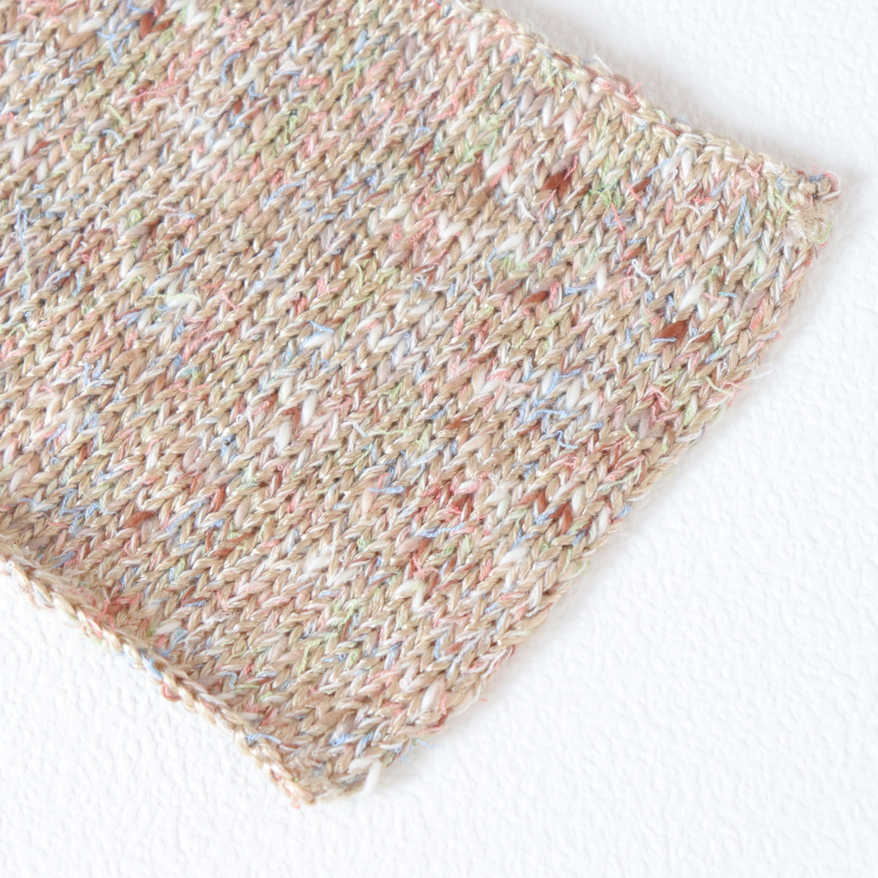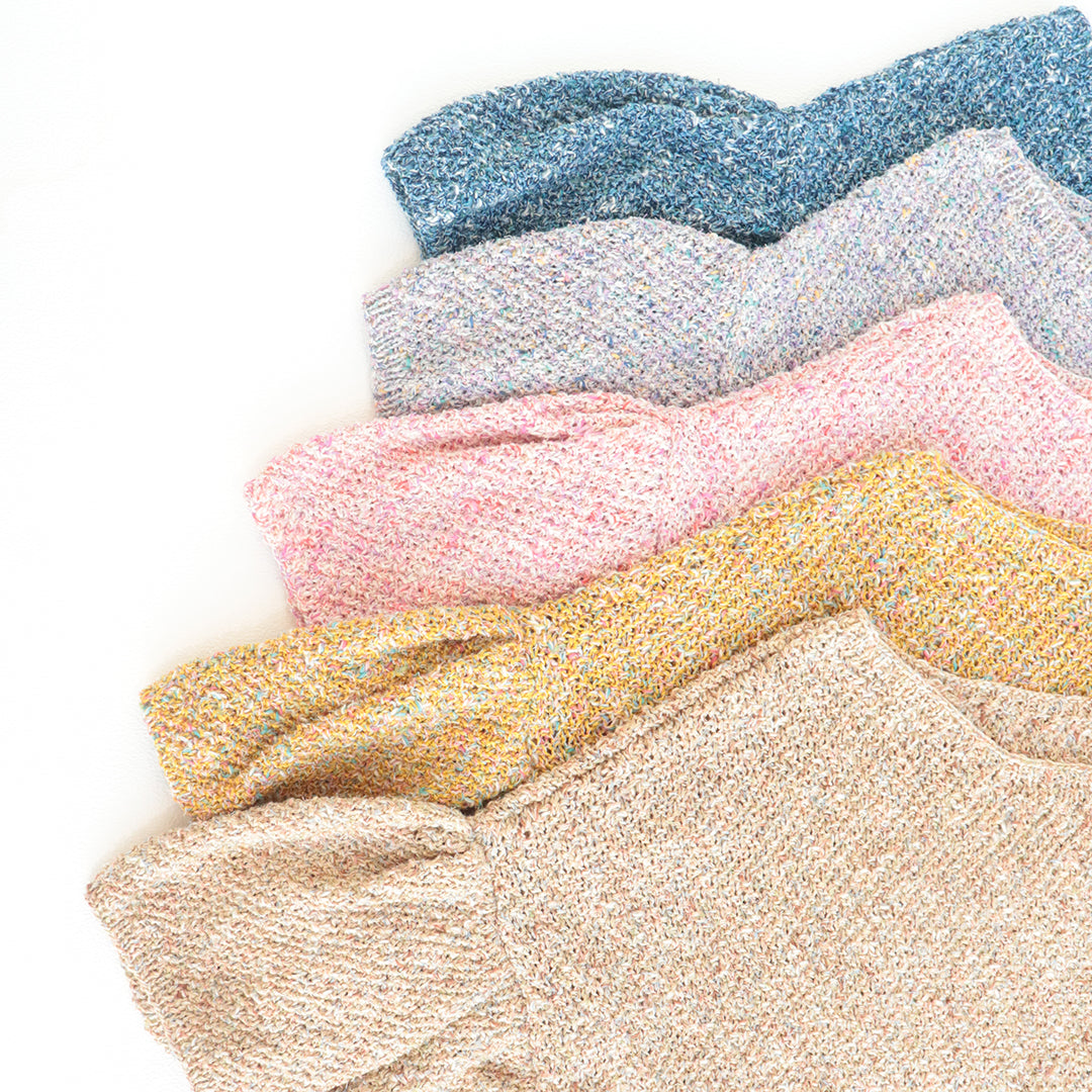 編地は柔らかくしなやか、テロンとした風合いになります。風合い・形状の異なる様々な糸を撚り混ぜて表情豊かに仕上げているのでシンプルな糸と引き揃えも楽しめる糸です♪