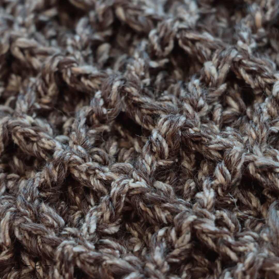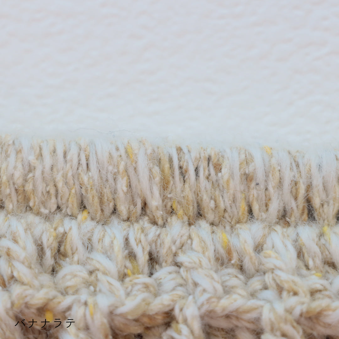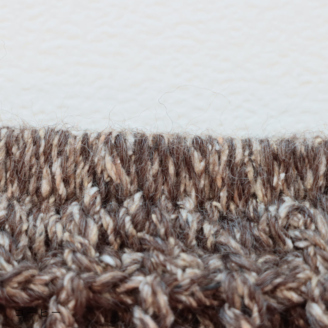 凹凸感が面白いファンシーヤーンになりました。このウールは、空気を多く含んだナチュラルスラブのため弾力性に富み、ふっくらと軽くて暖かな風合いが特徴です。仕上がった作品は長く愛用するとシルク特有の柔らかさが増し馴染んでくる様子もお楽しみいただけます。※素材の特性上、獣毛の香りが強く残っている場合がございます。