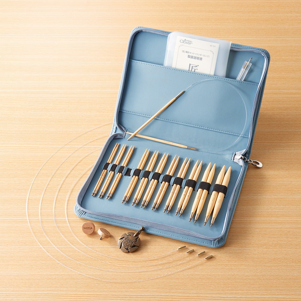 60通り(針12サイズ×コード5サイズ)の組み合わせが可能な、付け替え式セット「匠」輪針セット〈コンボ〉のロングタイプです。針の長さが12㎝(ジャンボサイズは12.5㎝)になって、セーターなどの大きい作品を編む時に、おすすめです。