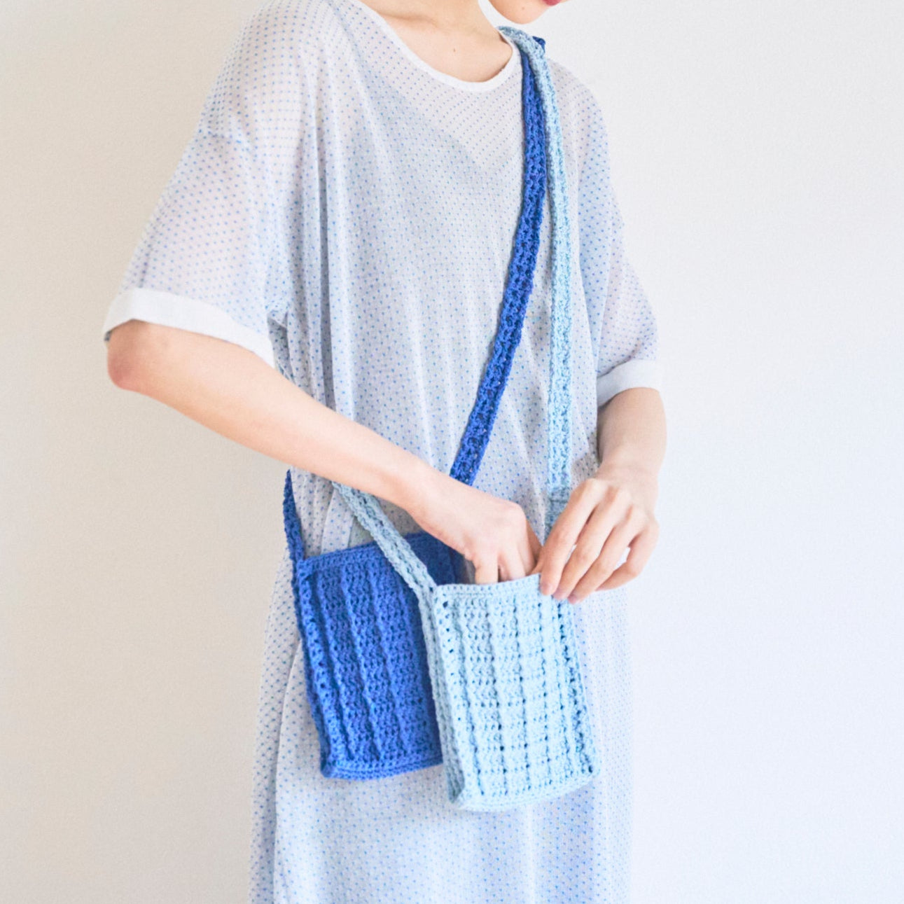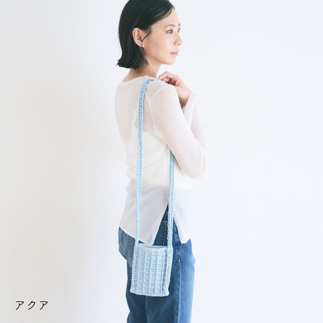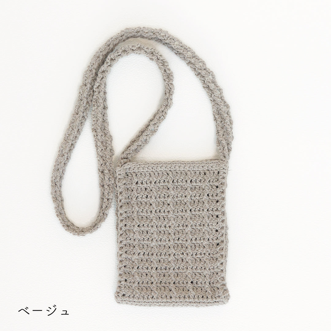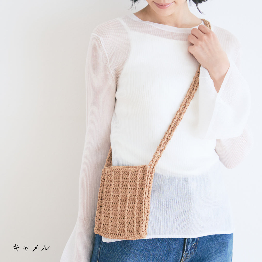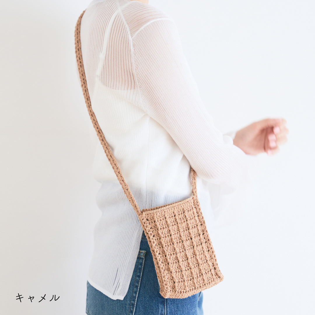 長編みの引き上げ編みを使ってカゴのような凹凸感を表現した編地がとっても可愛い作品です。肩ひもの長さはお好みの段数に調節も可能なので、男性女性問わず体格に合わせてお使いいただけます。