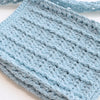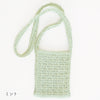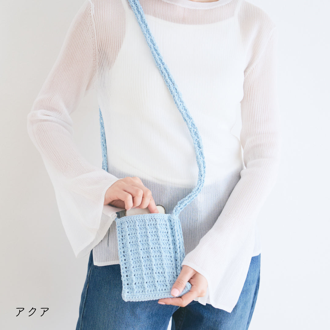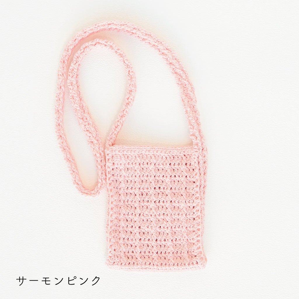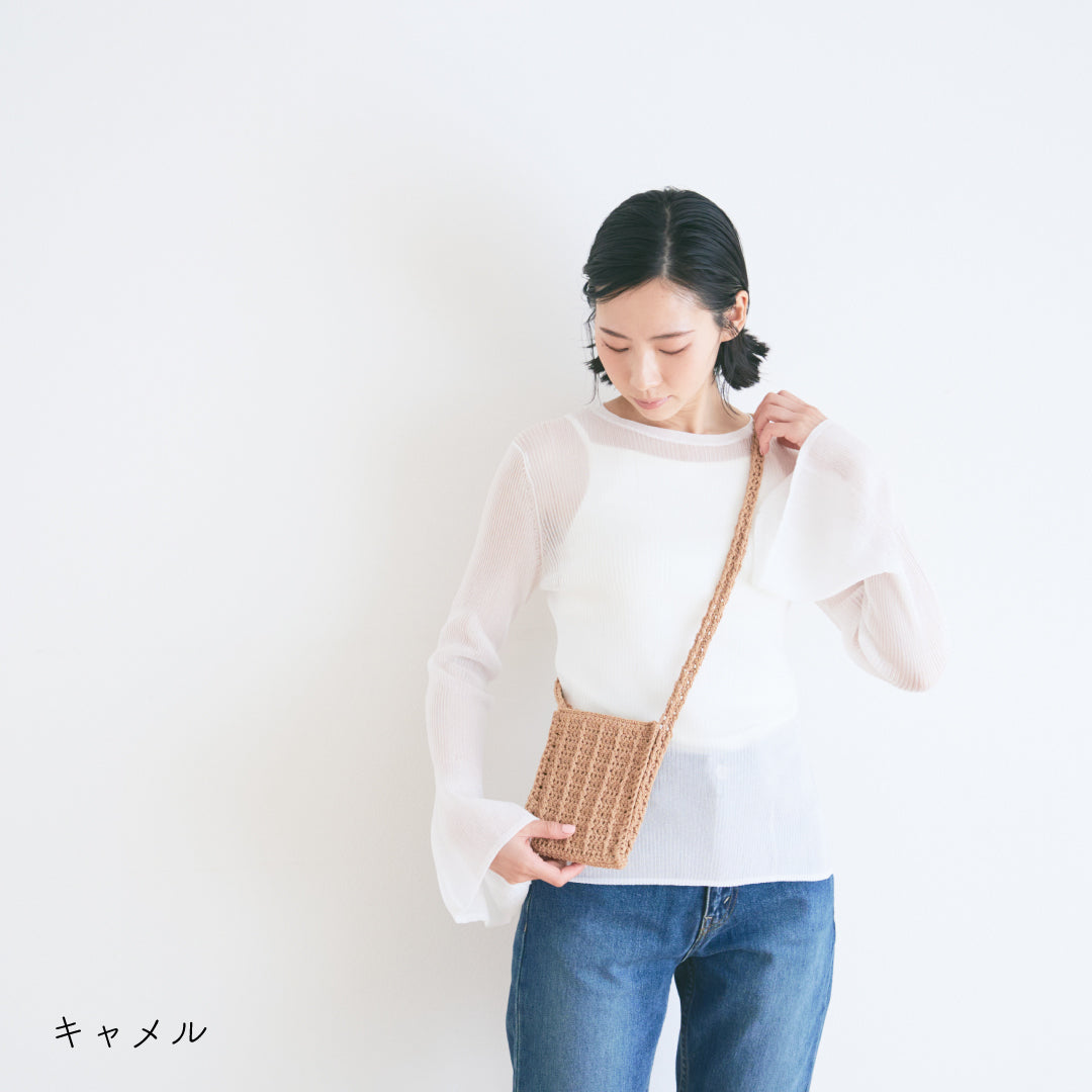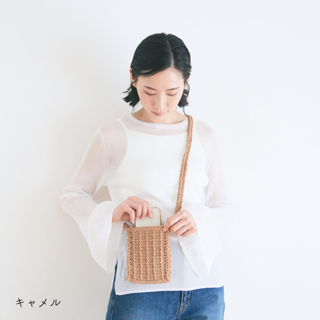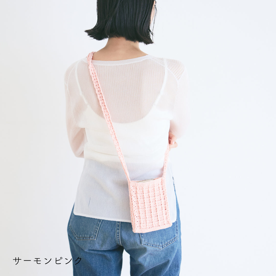 長編みの引き上げ編みを使ってカゴのような凹凸感を表現した編地がとっても可愛い作品です。肩ひもの長さはお好みの段数に調節も可能なので、男性女性問わず体格に合わせてお使いいただけます。