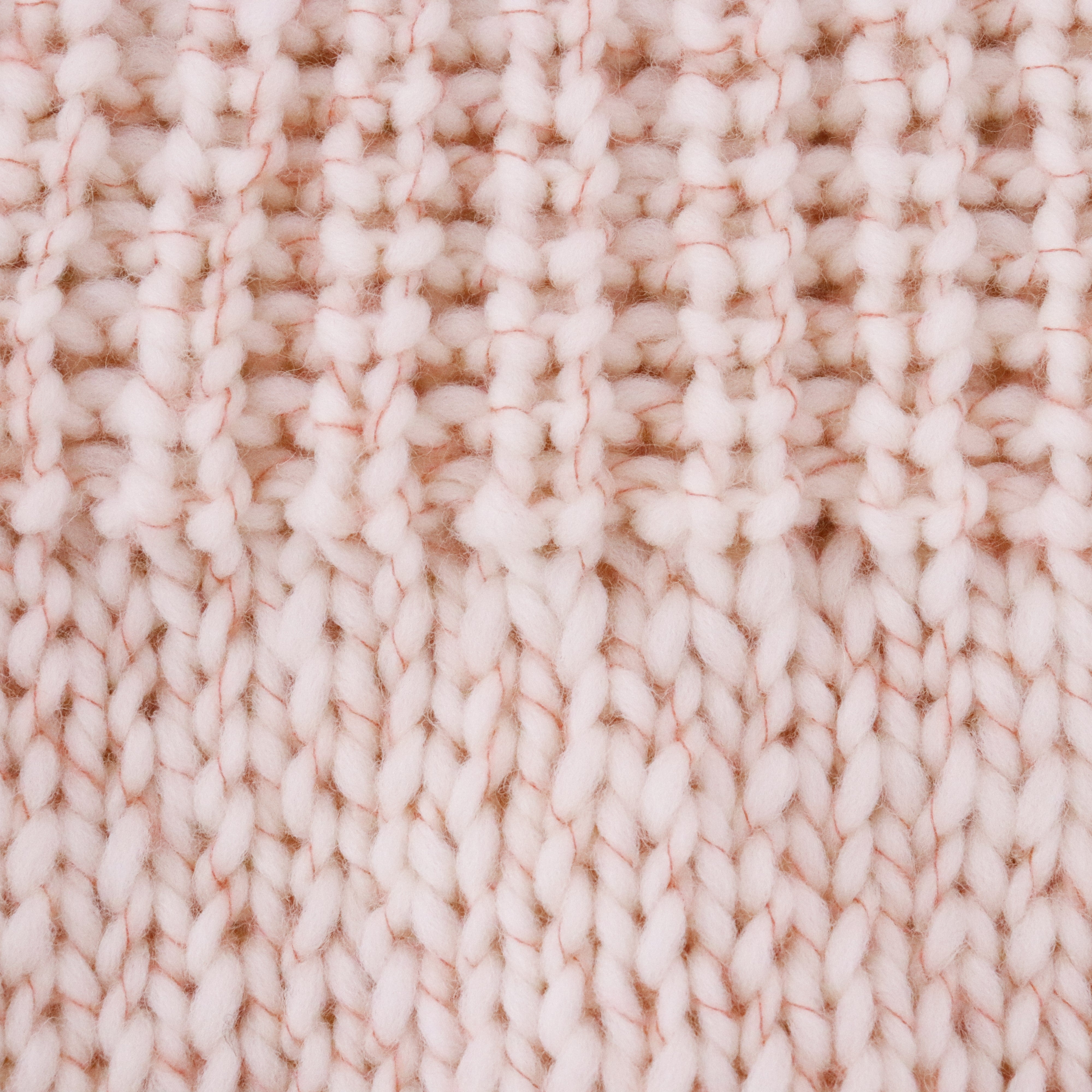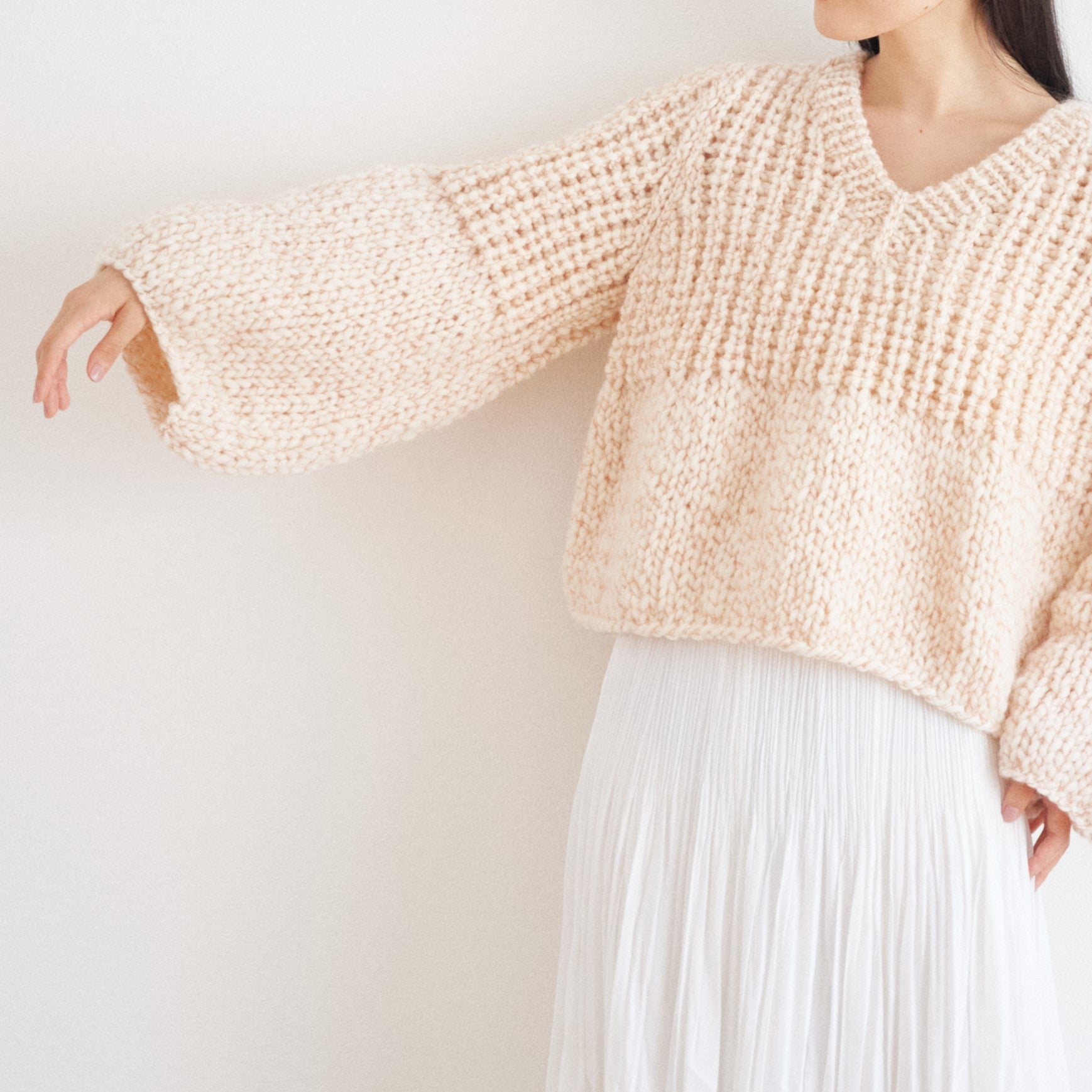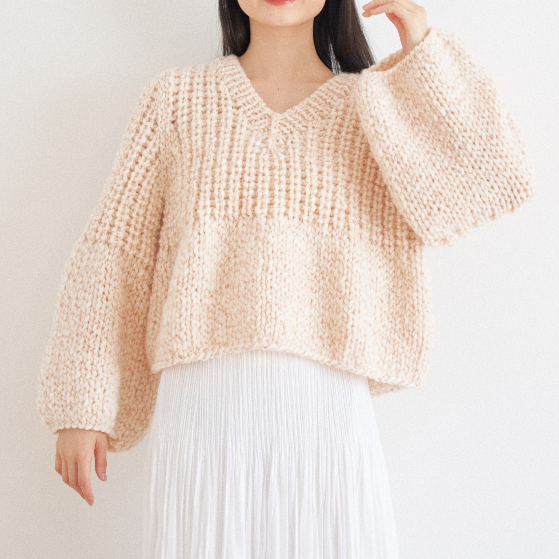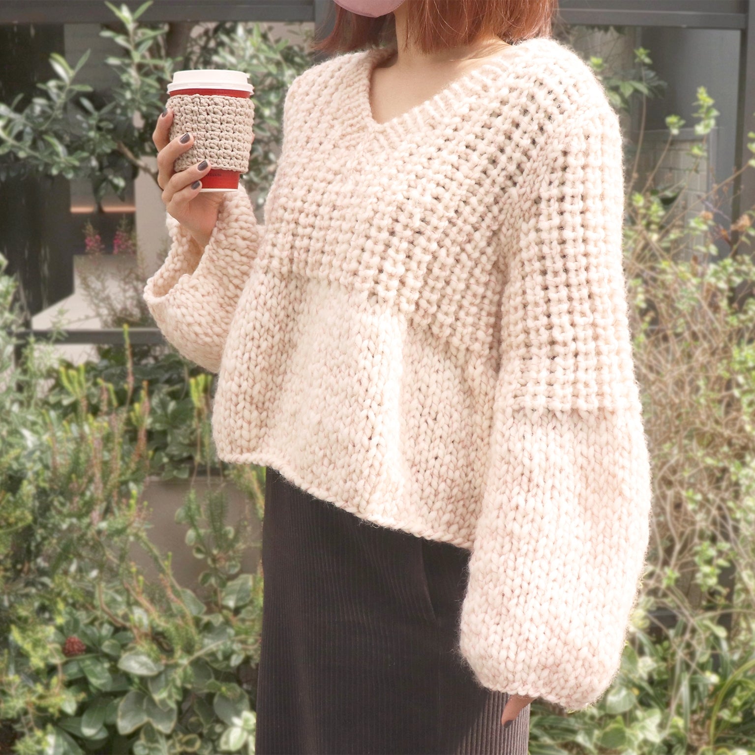 メリヤス編みとイギリスゴム編み(片畦編み)の組み合わせでフワッと広がるシルエットがデザインのポイント